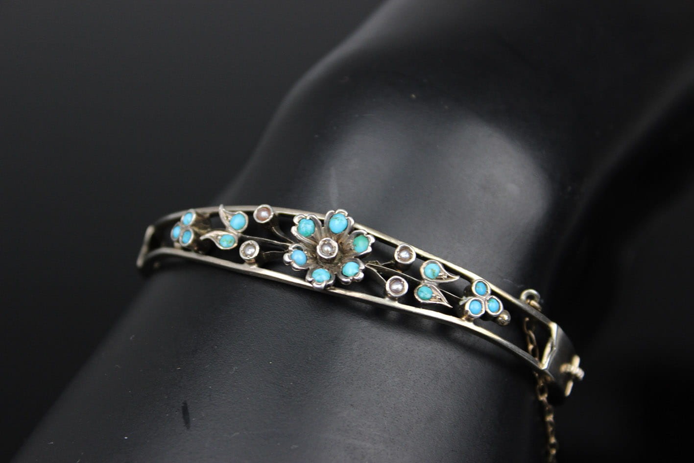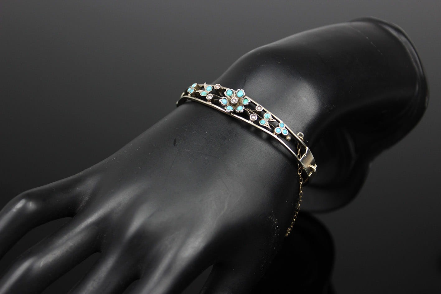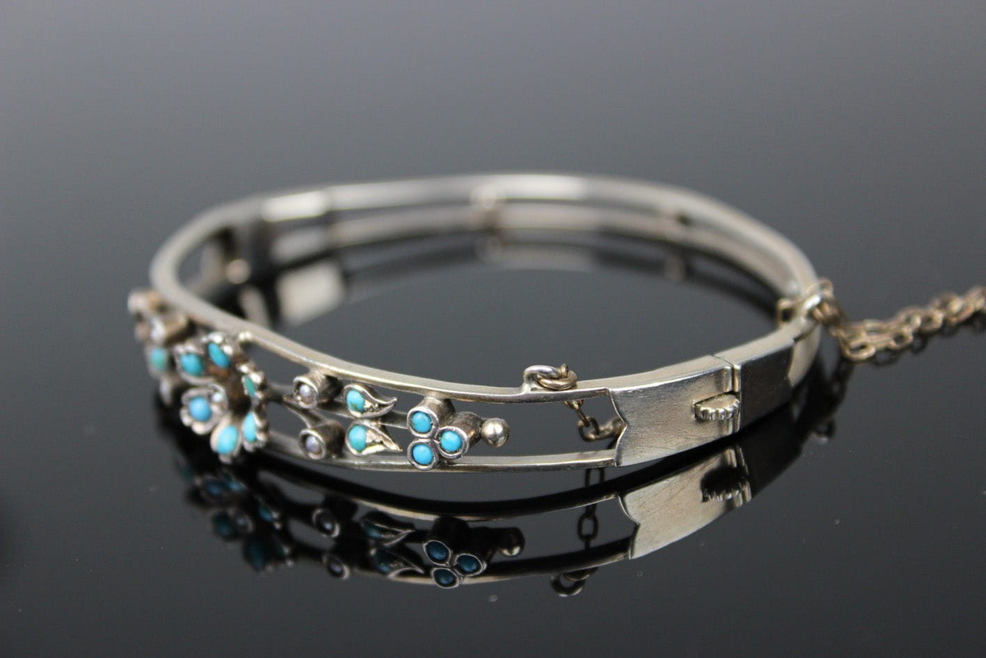 Bransoletka wywodząca się z nurtu sentymentalnego pochodząca z przełomu XIX i XX wieku. Dwudzielna obręcz łączona zawiasem i zapinana na zamek szufladkowy z łańcuszkiem zabezpieczającym. Górna półobręcz rozdziela się przytrzymując gałązkę kwiatową zdobionych naturalnym turkusem oraz perłami. Podstawa w srebrze próby ok. 800- brak punc badanie kwasowe. Zapięcie szufladkowe z dodatkowym zabezpieczeniem w postaci łańcuszka. Wymiary: