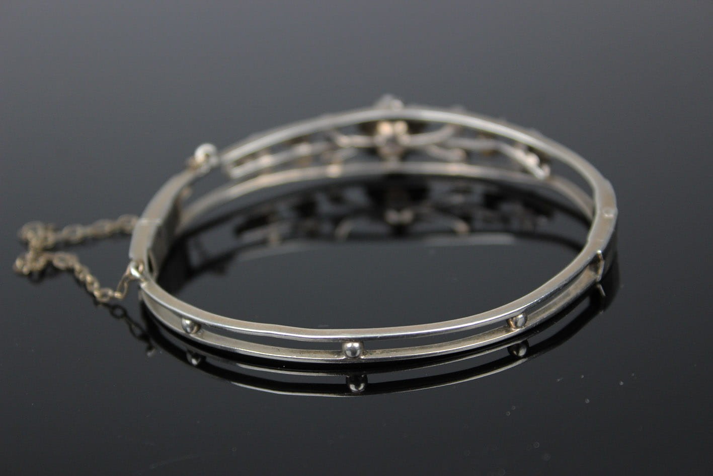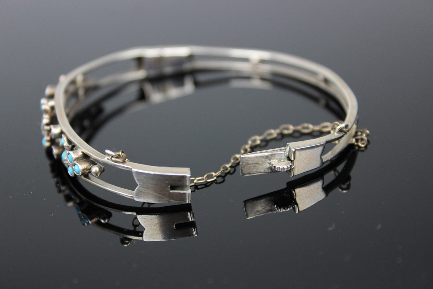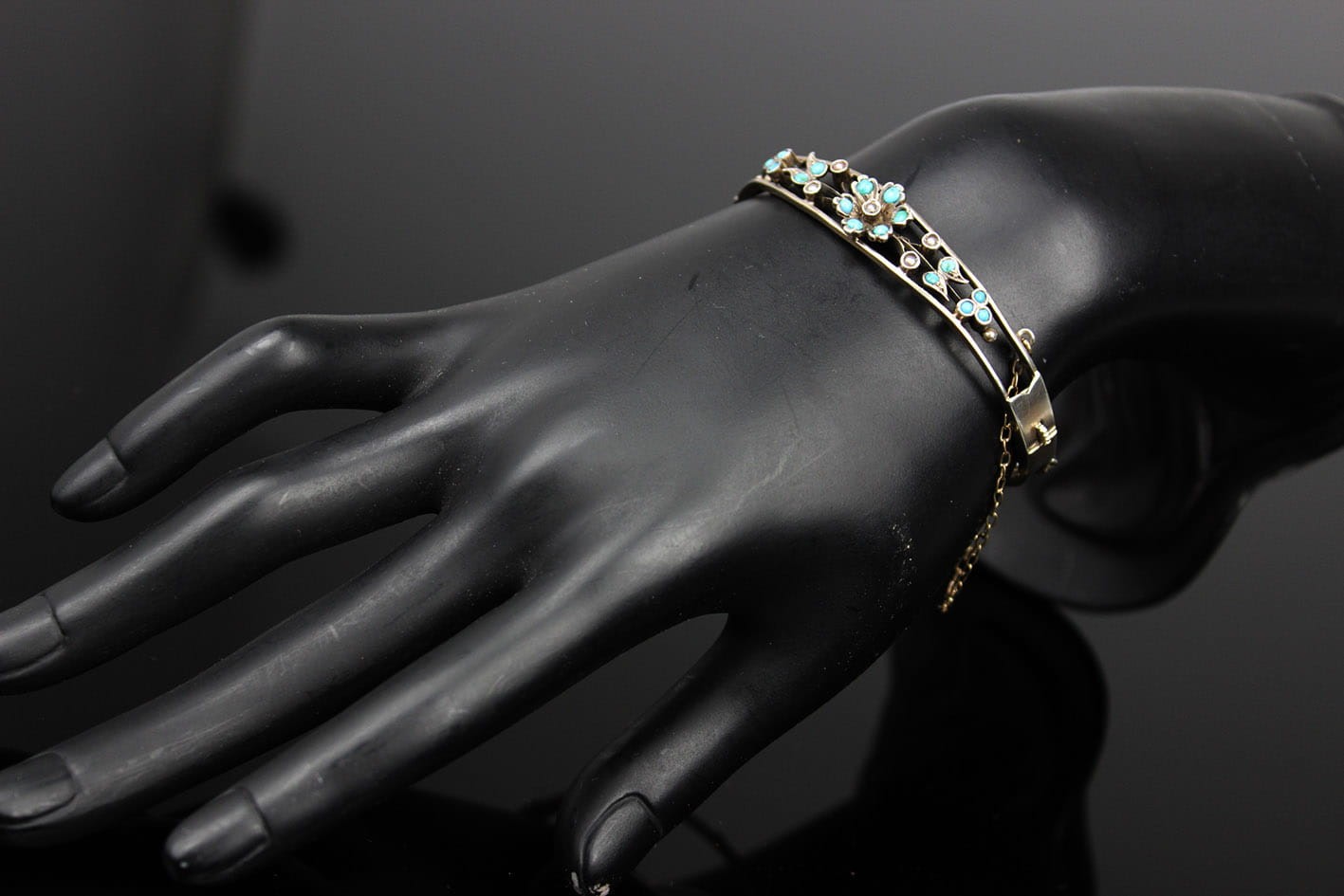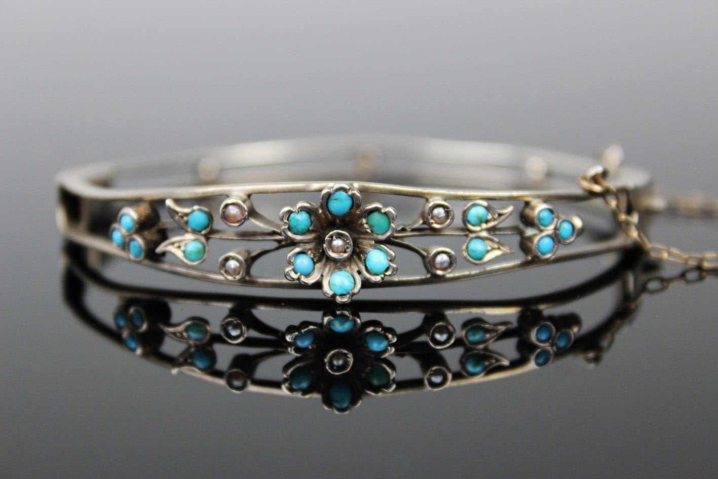Bransoletka wywodząca się z nurtu sentymentalnego pochodząca z przełomu XIX i XX wieku. Dwudzielna obręcz łączona zawiasem i zapinana na zamek szufladkowy z łańcuszkiem zabezpieczającym. Górna półobręcz rozdziela się przytrzymując gałązkę kwiatową zdobionych naturalnym turkusem oraz perłami. Podstawa w srebrze próby ok. 800- brak punc badanie kwasowe. Zapięcie szufladkowe z dodatkowym zabezpieczeniem w postaci łańcuszka. Wymiary: