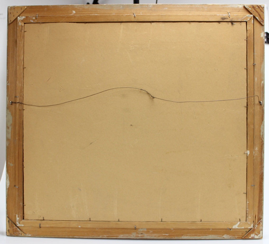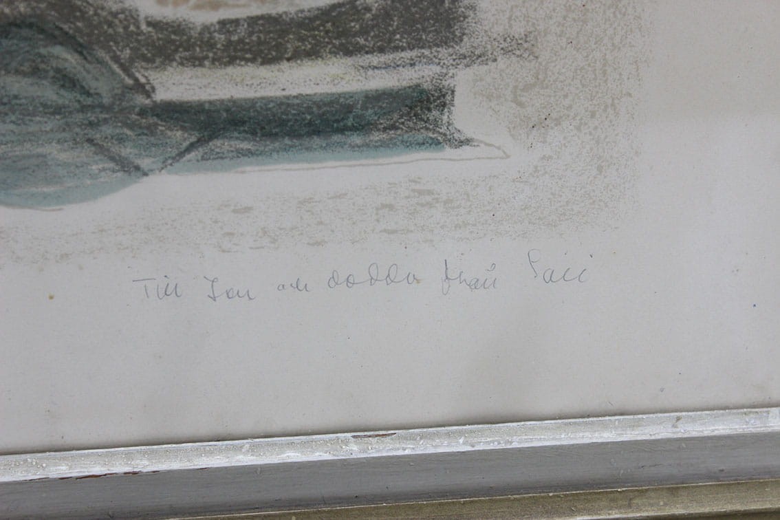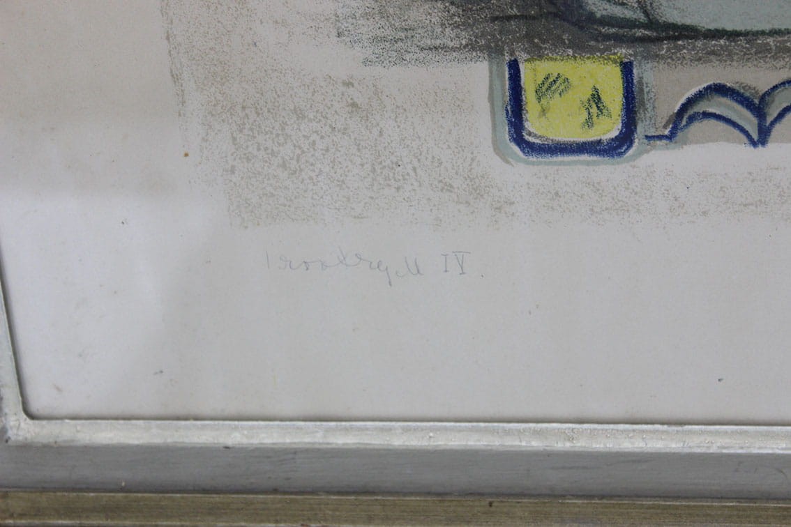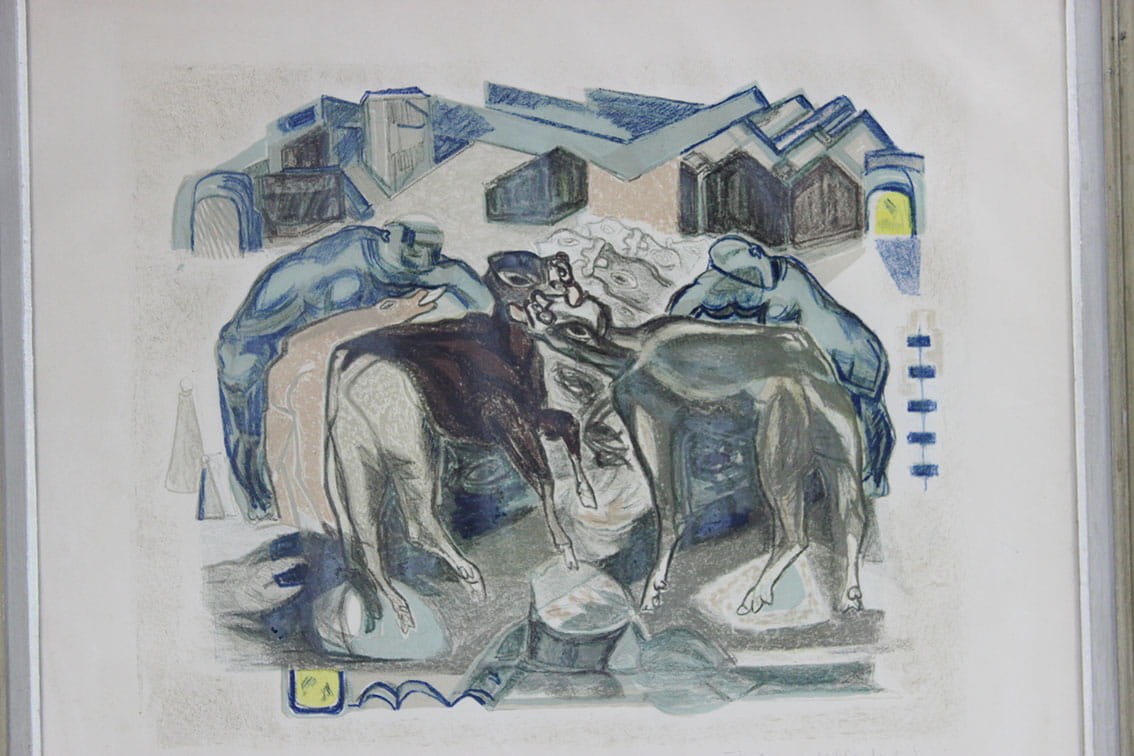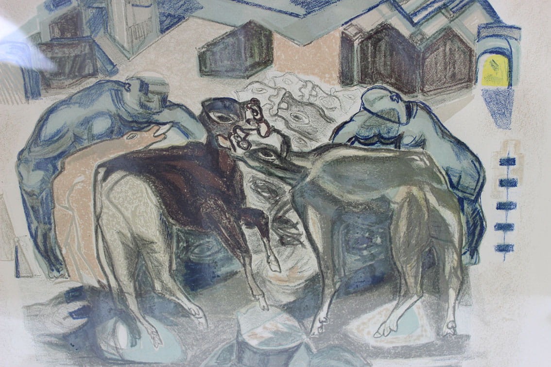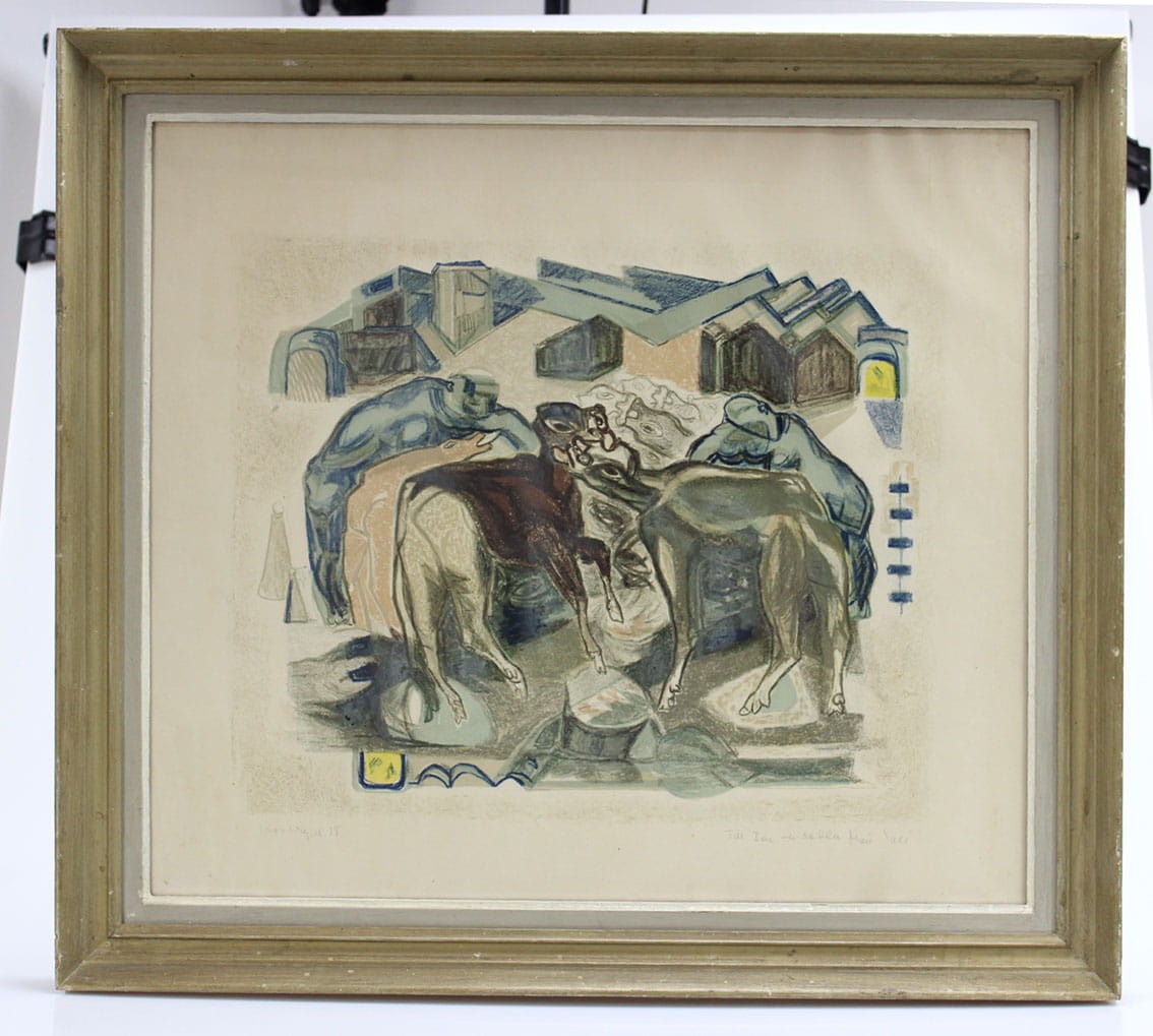 Kolorowa litografia znakomitej szwedzkiej artystki SIRI DERKERT ( Siri Karin Johansson) 1888-1973 zatytułowana "Kalvarna matas". Szkice do pracy wykonywane były w Fogelstad- gospodarstwie prowadzonym przez kobiety. Podczas swojego pobytu Siri Derkert poświęciła wiele godzin na szkicowanie zwierząt, gdzie w szczególności niestrudzenie rysowała cielęta w stodole. Szkice te zostały później wykorzystane do litografii "Karmione Cielęta", która została zamówiona przez Konstfrämjandet. Artystka uchwyciła w niej pracę kobiet i niezdarne ruchy cieląt, otoczone architekturą stodoły. Litografia została wydrukowana w 1947 r. Z uwagi na fakt, że Siri Derkert była stosunkowo mało znany szerszej publiczności, druk nie sprzedawał się dobrze. Jednak kiedy Derkert reprezentował Szwecję na Biennale w Wenecji w 1966 roku, sprzedaż jej prac gwałtownie wzrosła, a wydanie wyprzedano z dnia na dzień.Praca podpisana ołówkiem w dolnej części. Całość w passe partout w drewnianej ramie. Wymiary: