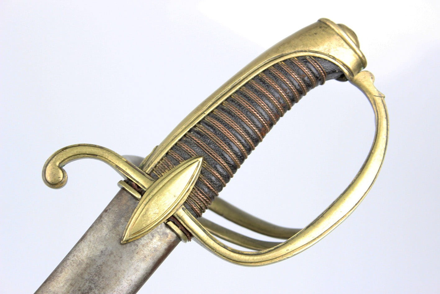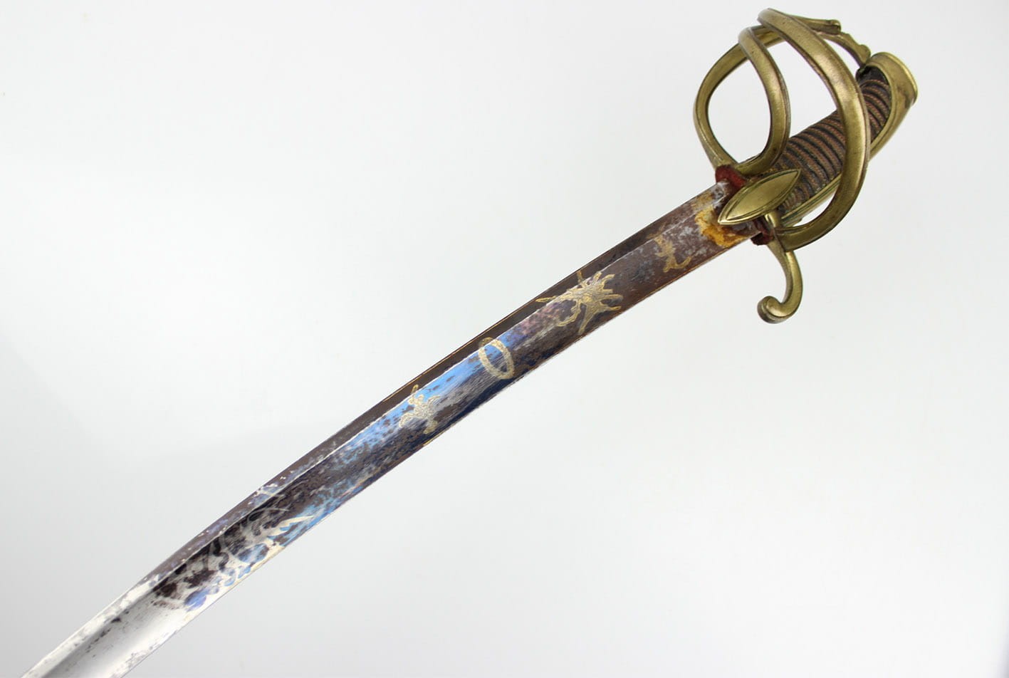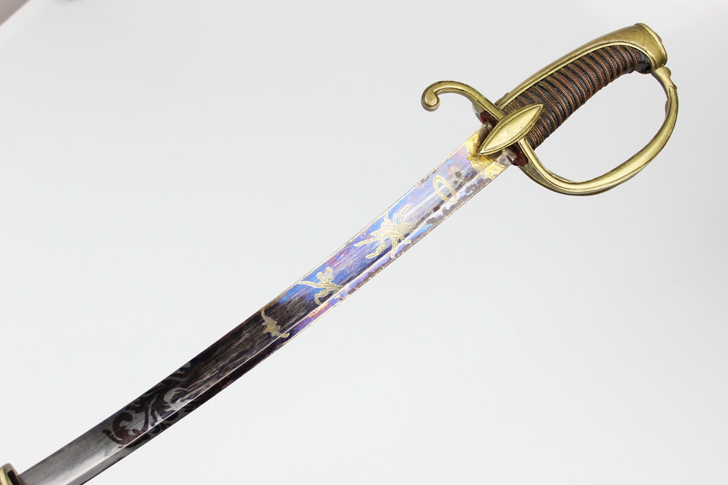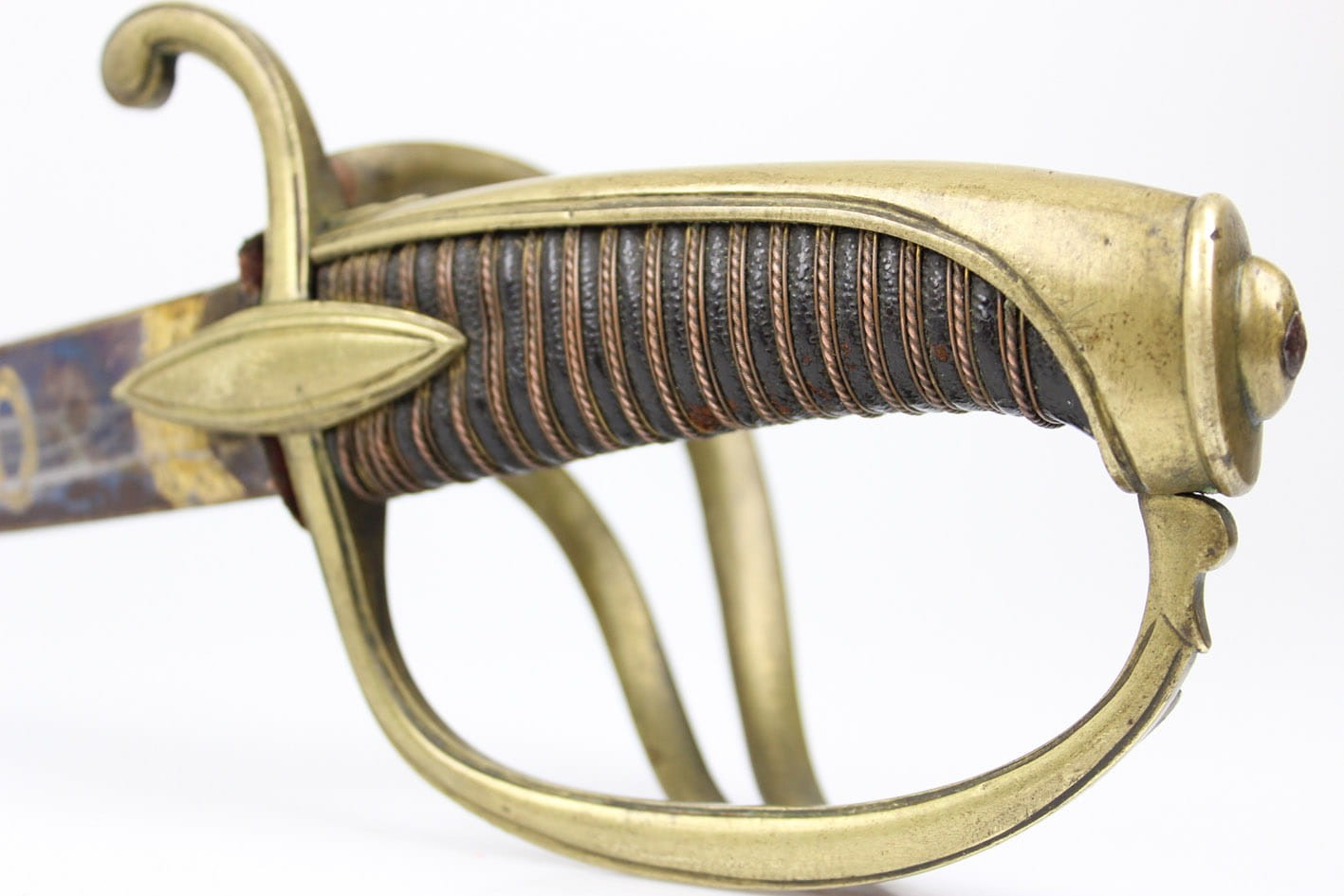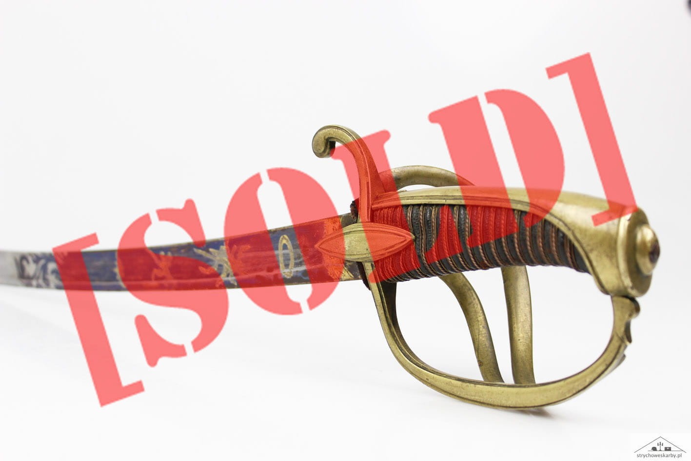 Oryginalna szabla francuska oficera kawalerii lekkiej mod. AN IX. Rękojeść zamknięta, oprawa mosiężna, złocona. Jelec trójkabłąkowy z dwoma kabłąkami bocznymi. Głowica lekko pochylona ku przodowi, pokryta kapturkiem zakończonym główką w której zanitowany jest trzpień głowni. Wąsy wypukłe o owalnych zakończeniach. Trzon rękojeści drewniany, obciągnięty czarną skórą, z oplotem z mosiężnego filigranu. Głownia stalowa, obustronnie wklęsło szlifowana w pojedynczą szeroką bruzdę, zakończoną długim obosiecznym piórem. Na obu płazach zastawy bogata oksydacja, złocona dekoracja o motywach roślinnych. U nasady głowni widoczny grawer manufaktury Solingen. Pochwa stalowa, polerowana z mosiężną szyjką i dwiema mosiężnymi, złoconymi ryfkami w formie szerokich, lekko wybrzuszonych opasek z ruchomymi kółkami nośnymi. Stan dokładnie jak na fotografiach.