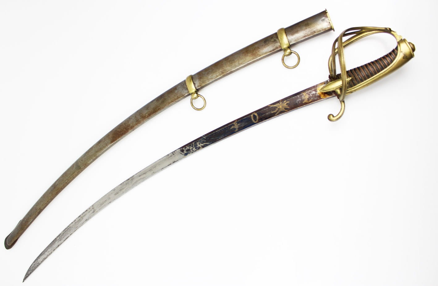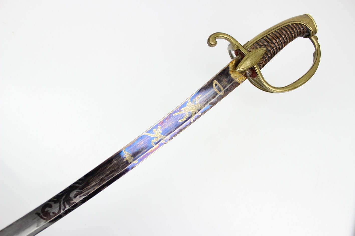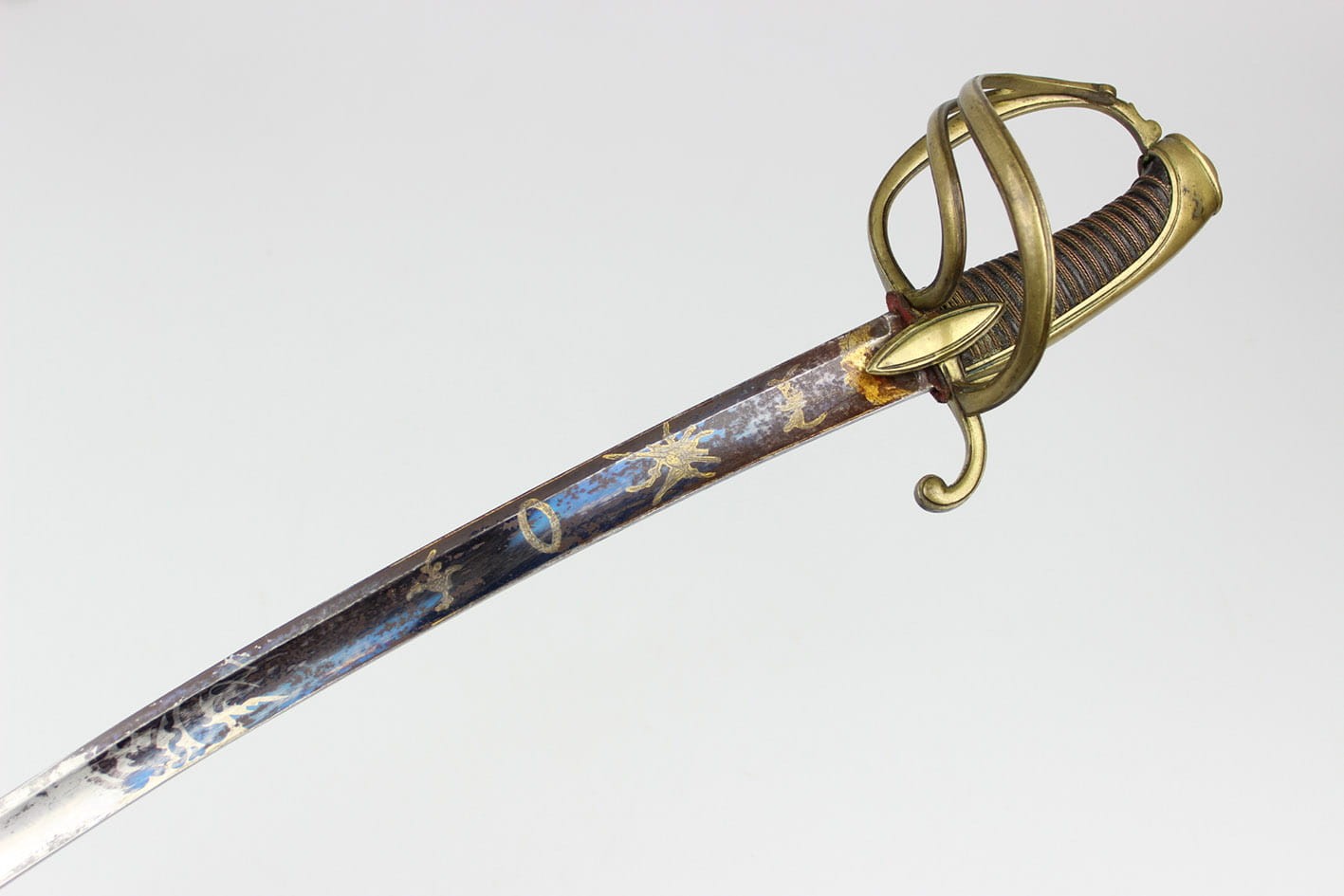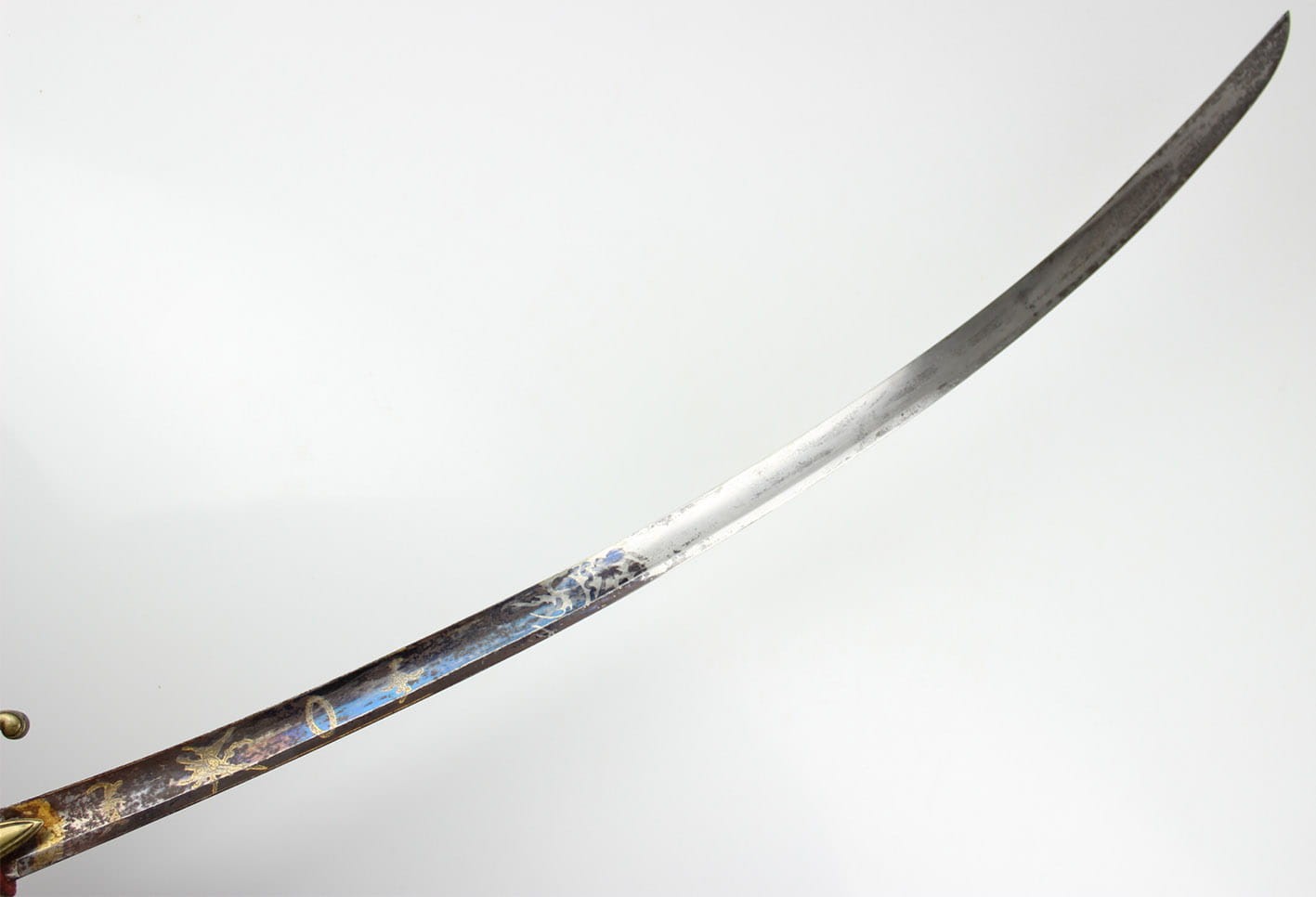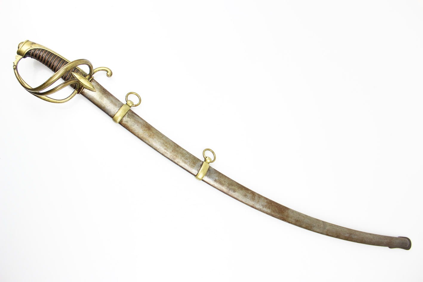 Oryginalna szabla francuska oficera kawalerii lekkiej mod. AN IX. Rękojeść zamknięta, oprawa mosiężna, złocona. Jelec trójkabłąkowy z dwoma kabłąkami bocznymi. Głowica lekko pochylona ku przodowi, pokryta kapturkiem zakończonym główką w której zanitowany jest trzpień głowni. Wąsy wypukłe o owalnych zakończeniach. Trzon rękojeści drewniany, obciągnięty czarną skórą, z oplotem z mosiężnego filigranu. Głownia stalowa, obustronnie wklęsło szlifowana w pojedynczą szeroką bruzdę, zakończoną długim obosiecznym piórem. Na obu płazach zastawy bogata oksydacja, złocona dekoracja o motywach roślinnych. U nasady głowni widoczny grawer manufaktury Solingen. Pochwa stalowa, polerowana z mosiężną szyjką i dwiema mosiężnymi, złoconymi ryfkami w formie szerokich, lekko wybrzuszonych opasek z ruchomymi kółkami nośnymi. Stan dokładnie jak na fotografiach.