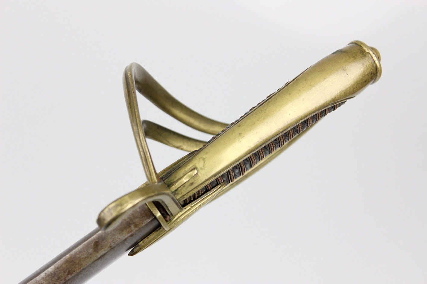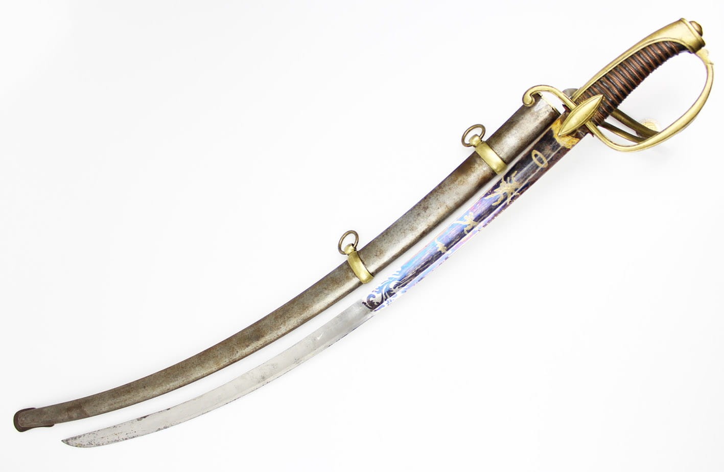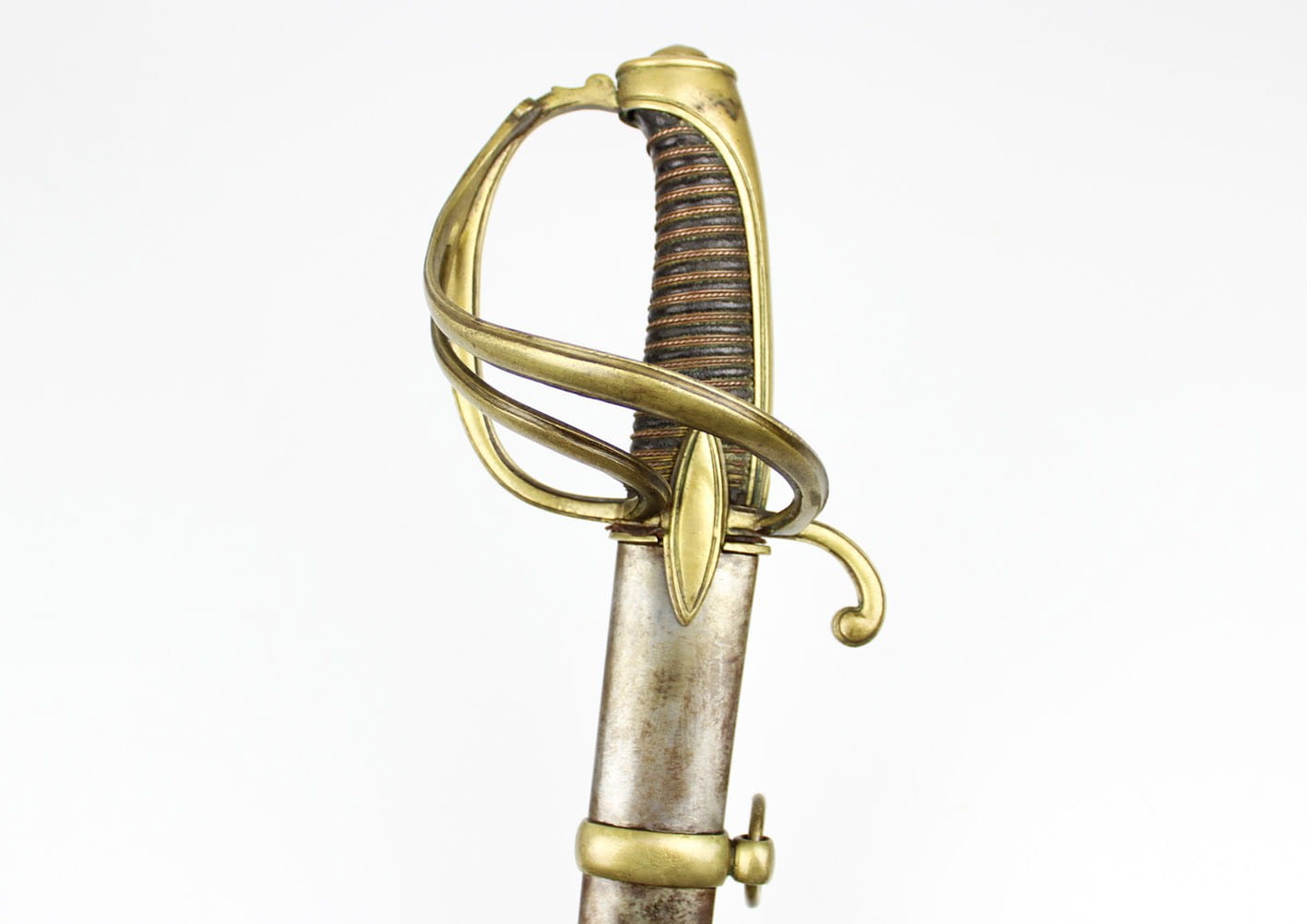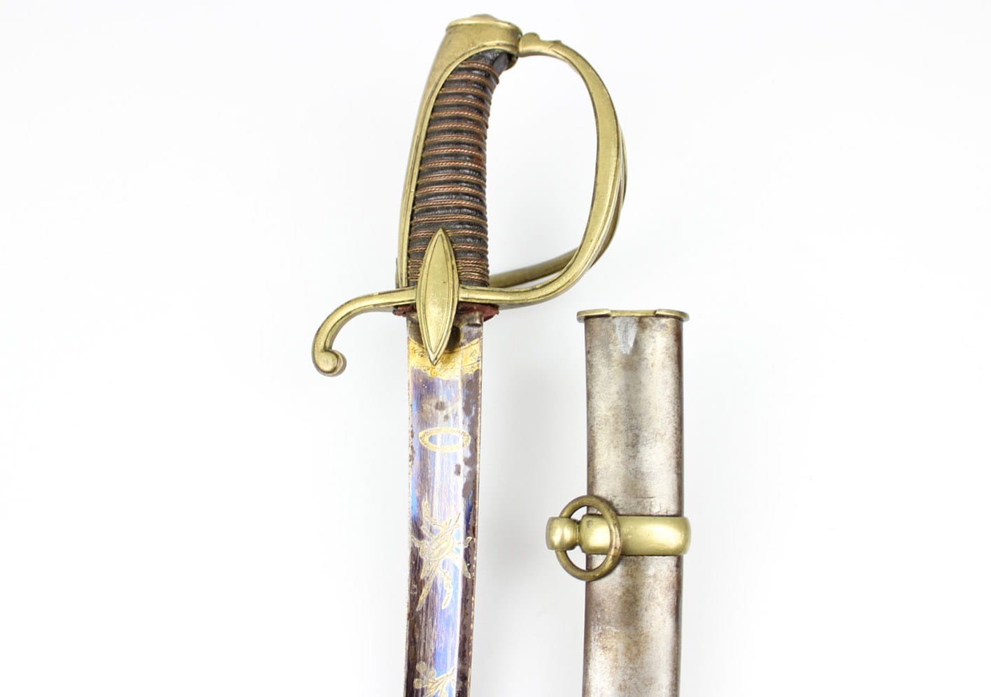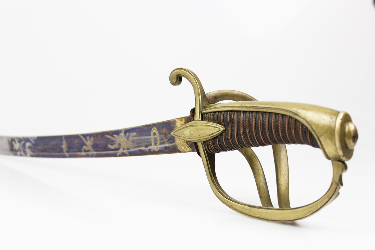 Oryginalna szabla francuska oficera kawalerii lekkiej mod. AN IX. Rękojeść zamknięta, oprawa mosiężna, złocona. Jelec trójkabłąkowy z dwoma kabłąkami bocznymi. Głowica lekko pochylona ku przodowi, pokryta kapturkiem zakończonym główką w której zanitowany jest trzpień głowni. Wąsy wypukłe o owalnych zakończeniach. Trzon rękojeści drewniany, obciągnięty czarną skórą, z oplotem z mosiężnego filigranu. Głownia stalowa, obustronnie wklęsło szlifowana w pojedynczą szeroką bruzdę, zakończoną długim obosiecznym piórem. Na obu płazach zastawy bogata oksydacja, złocona dekoracja o motywach roślinnych. U nasady głowni widoczny grawer manufaktury Solingen. Pochwa stalowa, polerowana z mosiężną szyjką i dwiema mosiężnymi, złoconymi ryfkami w formie szerokich, lekko wybrzuszonych opasek z ruchomymi kółkami nośnymi. Stan dokładnie jak na fotografiach.