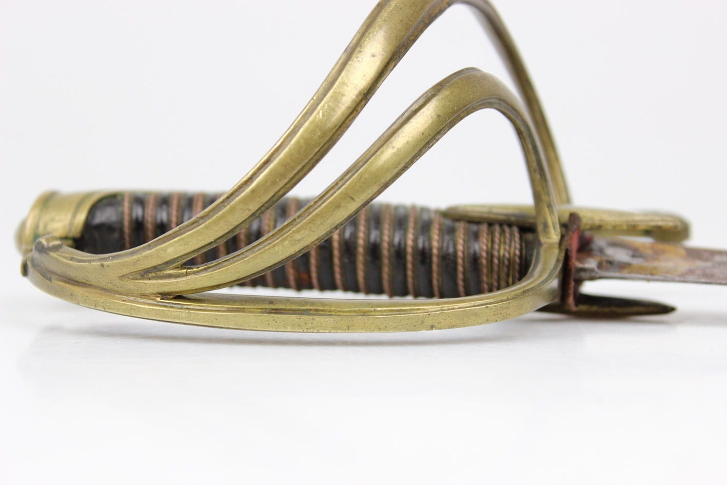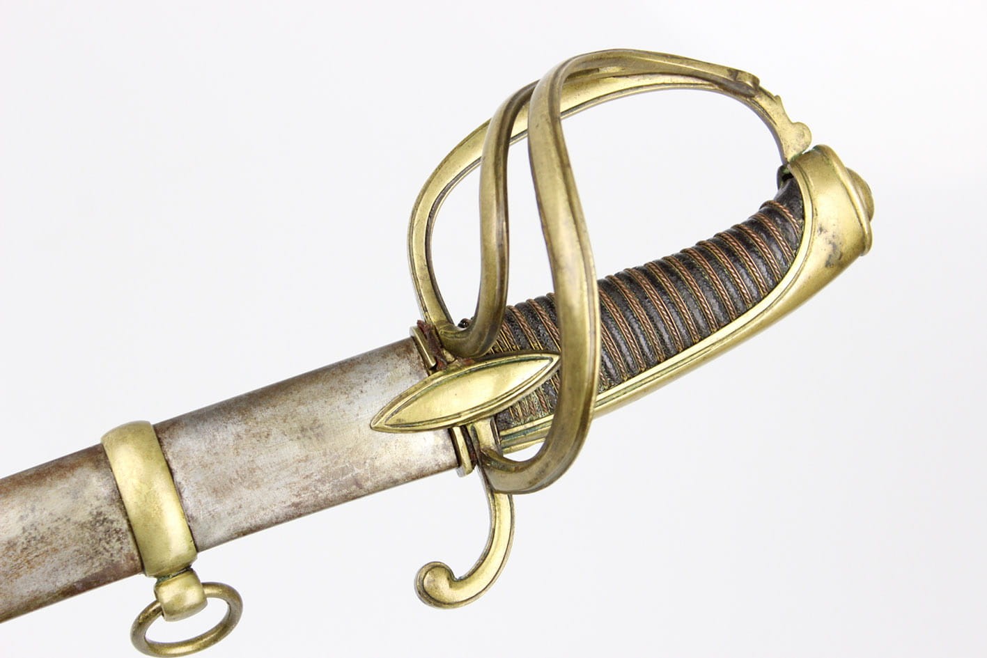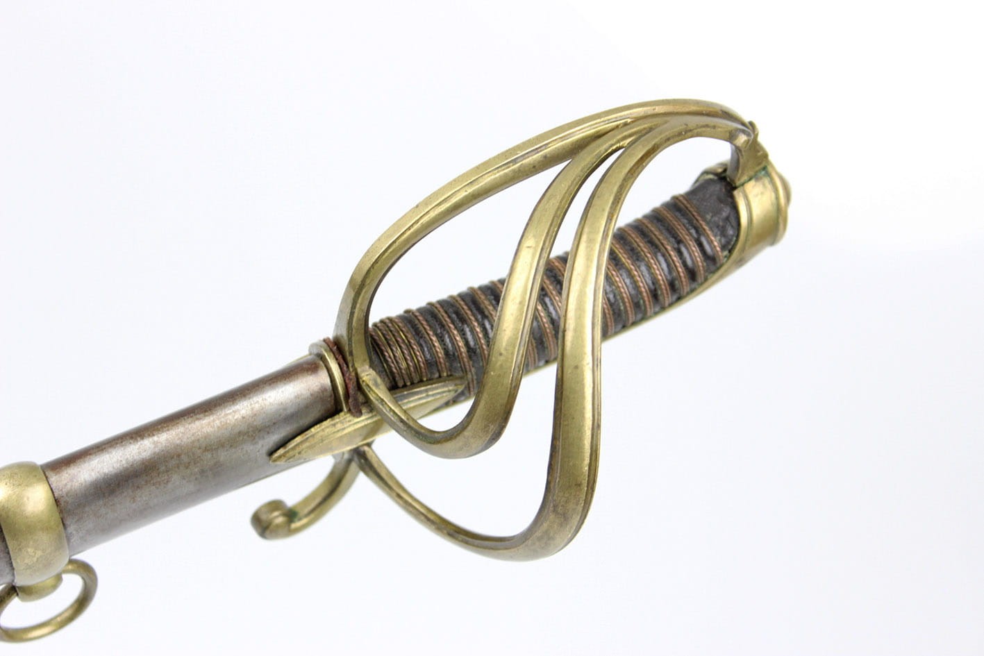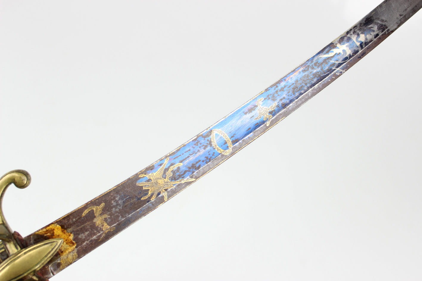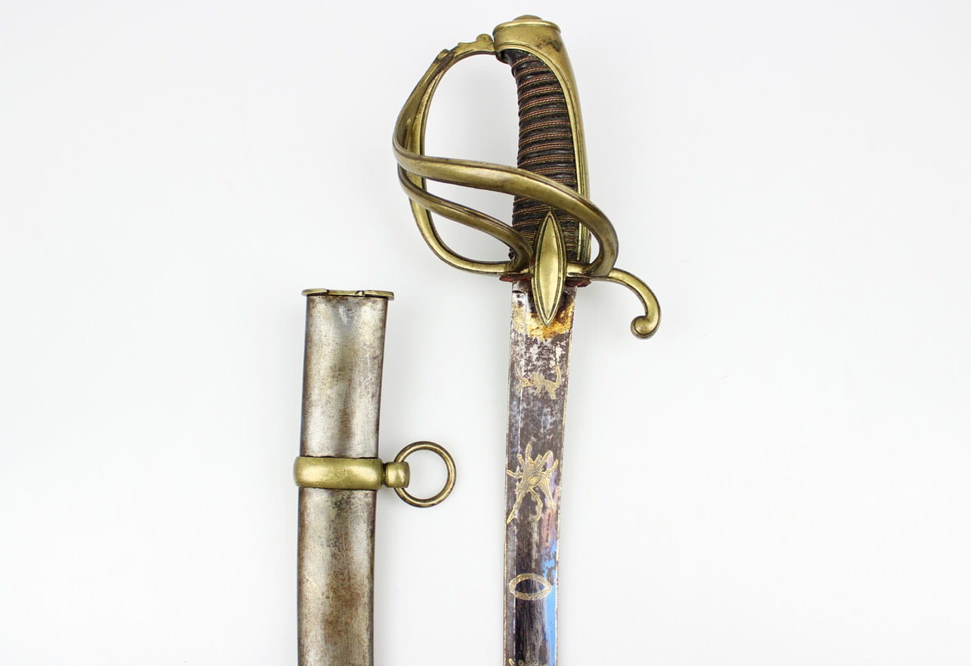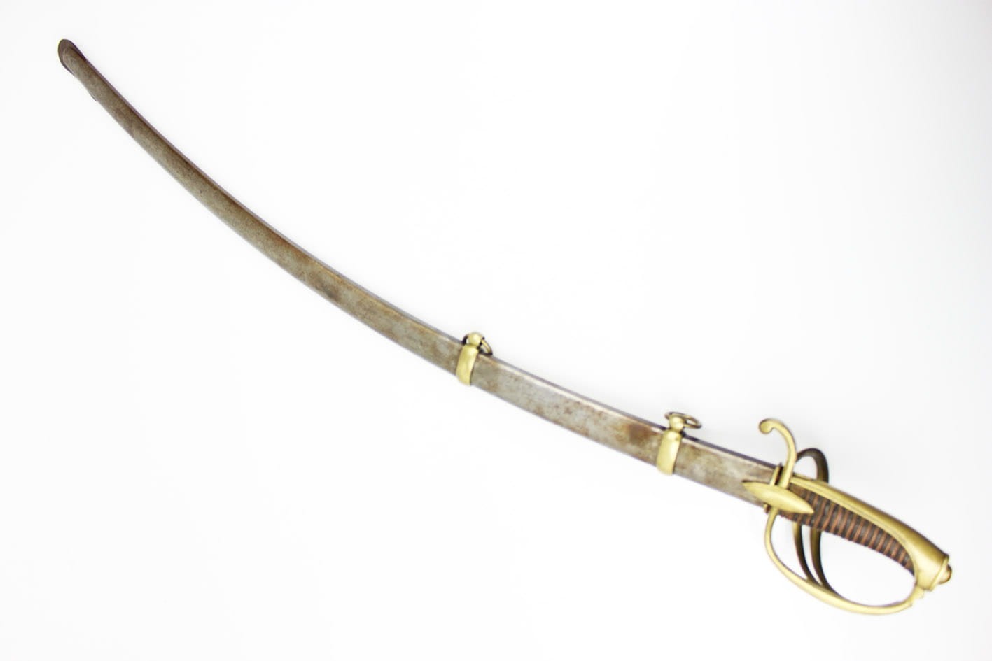 Oryginalna szabla francuska oficera kawalerii lekkiej mod. AN IX. Rękojeść zamknięta, oprawa mosiężna, złocona. Jelec trójkabłąkowy z dwoma kabłąkami bocznymi. Głowica lekko pochylona ku przodowi, pokryta kapturkiem zakończonym główką w której zanitowany jest trzpień głowni. Wąsy wypukłe o owalnych zakończeniach. Trzon rękojeści drewniany, obciągnięty czarną skórą, z oplotem z mosiężnego filigranu. Głownia stalowa, obustronnie wklęsło szlifowana w pojedynczą szeroką bruzdę, zakończoną długim obosiecznym piórem. Na obu płazach zastawy bogata oksydacja, złocona dekoracja o motywach roślinnych. U nasady głowni widoczny grawer manufaktury Solingen. Pochwa stalowa, polerowana z mosiężną szyjką i dwiema mosiężnymi, złoconymi ryfkami w formie szerokich, lekko wybrzuszonych opasek z ruchomymi kółkami nośnymi. Stan dokładnie jak na fotografiach.