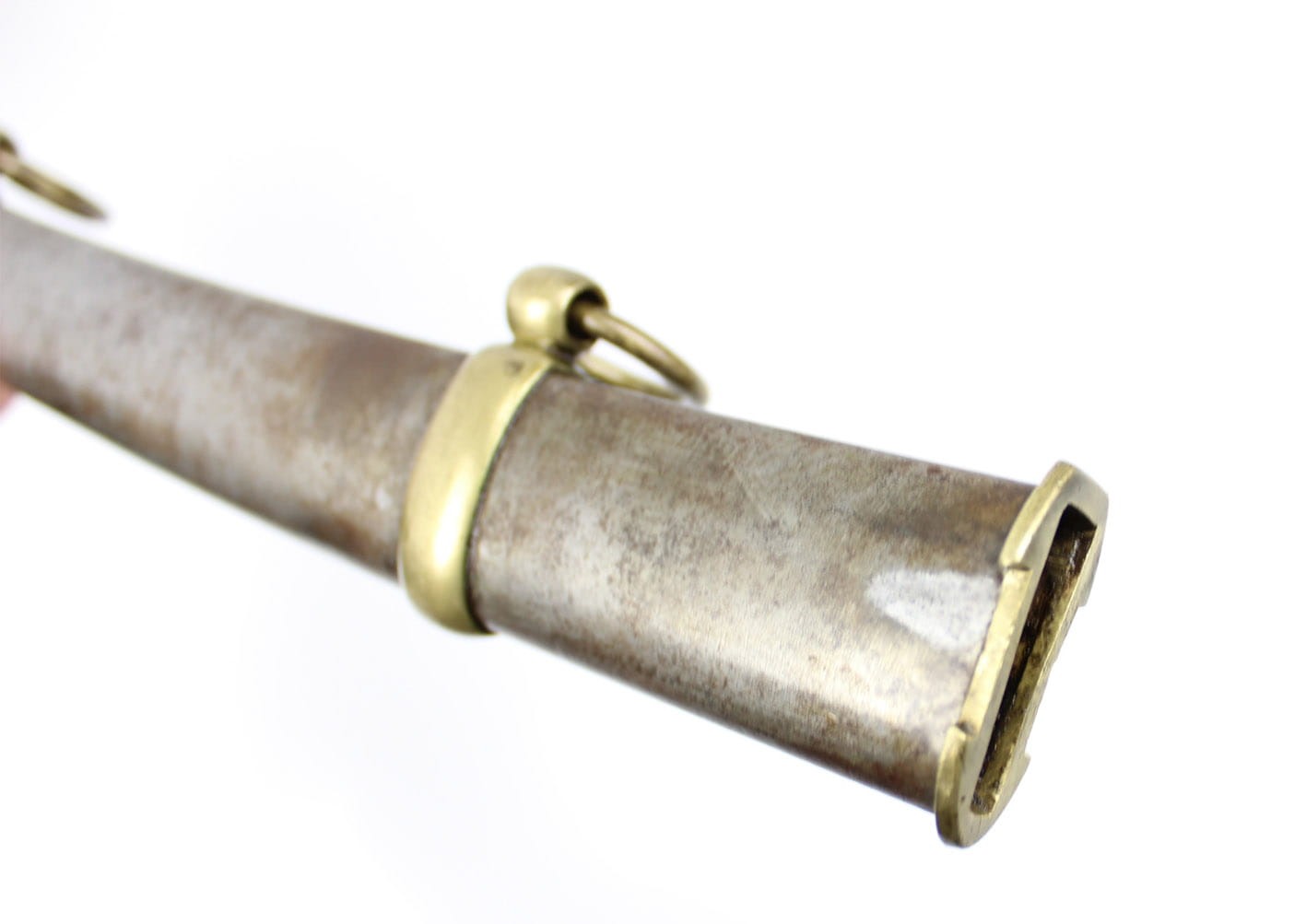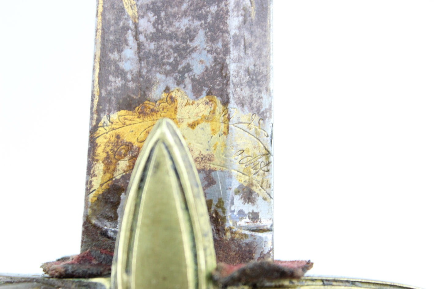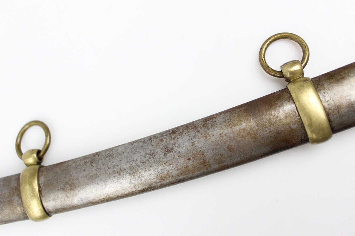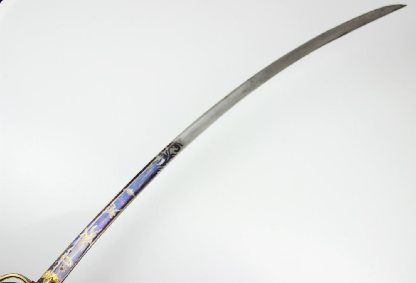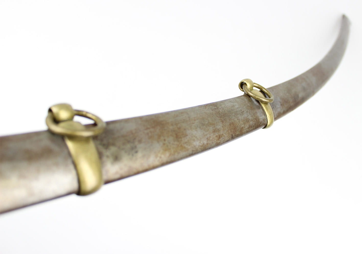 Oryginalna szabla francuska oficera kawalerii lekkiej mod. AN IX. Rękojeść zamknięta, oprawa mosiężna, złocona. Jelec trójkabłąkowy z dwoma kabłąkami bocznymi. Głowica lekko pochylona ku przodowi, pokryta kapturkiem zakończonym główką w której zanitowany jest trzpień głowni. Wąsy wypukłe o owalnych zakończeniach. Trzon rękojeści drewniany, obciągnięty czarną skórą, z oplotem z mosiężnego filigranu. Głownia stalowa, obustronnie wklęsło szlifowana w pojedynczą szeroką bruzdę, zakończoną długim obosiecznym piórem. Na obu płazach zastawy bogata oksydacja, złocona dekoracja o motywach roślinnych. U nasady głowni widoczny grawer manufaktury Solingen. Pochwa stalowa, polerowana z mosiężną szyjką i dwiema mosiężnymi, złoconymi ryfkami w formie szerokich, lekko wybrzuszonych opasek z ruchomymi kółkami nośnymi. Stan dokładnie jak na fotografiach.
