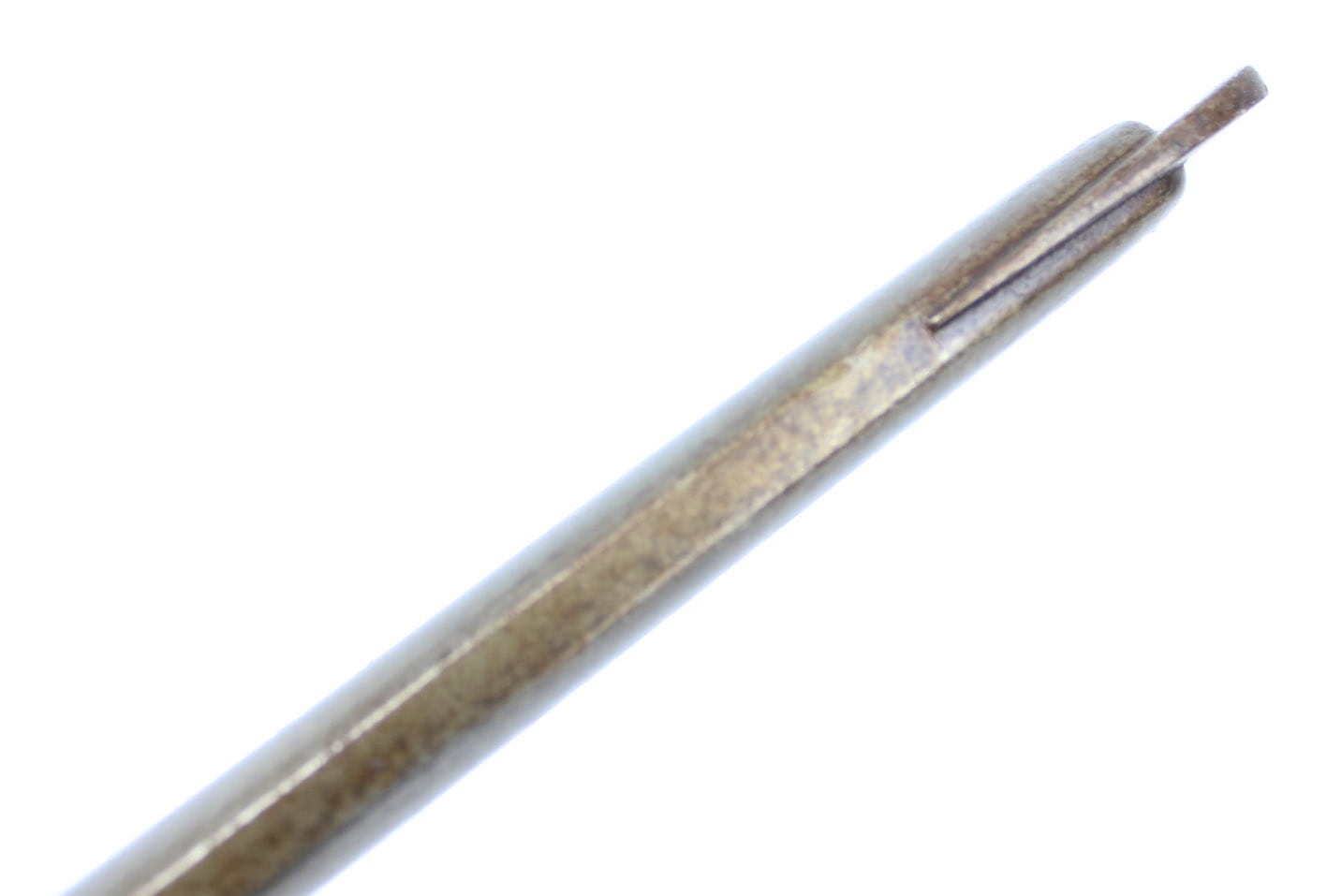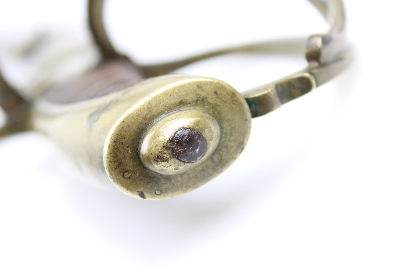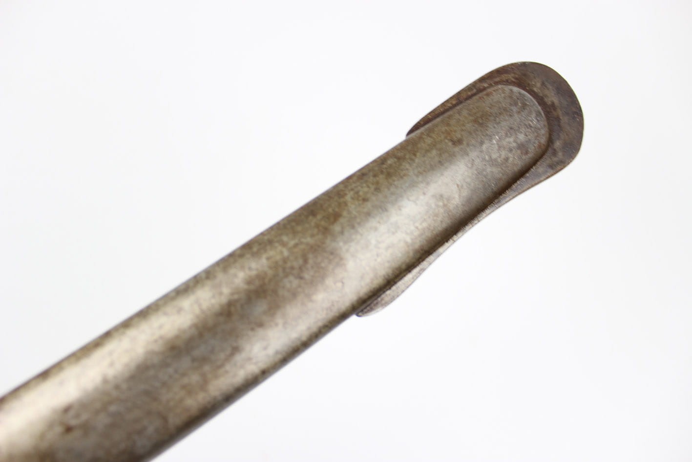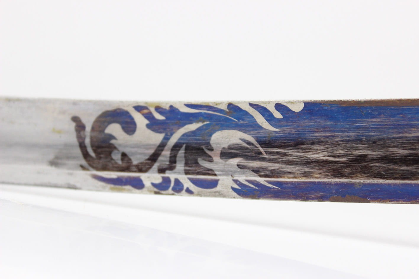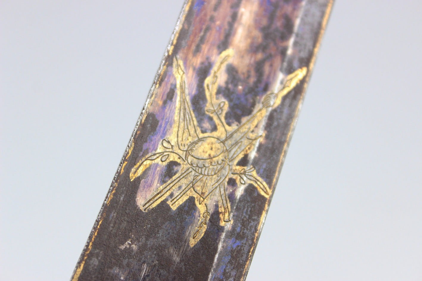 Oryginalna szabla francuska oficera kawalerii lekkiej mod. AN IX. Rękojeść zamknięta, oprawa mosiężna, złocona. Jelec trójkabłąkowy z dwoma kabłąkami bocznymi. Głowica lekko pochylona ku przodowi, pokryta kapturkiem zakończonym główką w której zanitowany jest trzpień głowni. Wąsy wypukłe o owalnych zakończeniach. Trzon rękojeści drewniany, obciągnięty czarną skórą, z oplotem z mosiężnego filigranu. Głownia stalowa, obustronnie wklęsło szlifowana w pojedynczą szeroką bruzdę, zakończoną długim obosiecznym piórem. Na obu płazach zastawy bogata oksydacja, złocona dekoracja o motywach roślinnych. U nasady głowni widoczny grawer manufaktury Solingen. Pochwa stalowa, polerowana z mosiężną szyjką i dwiema mosiężnymi, złoconymi ryfkami w formie szerokich, lekko wybrzuszonych opasek z ruchomymi kółkami nośnymi. Stan dokładnie jak na fotografiach.