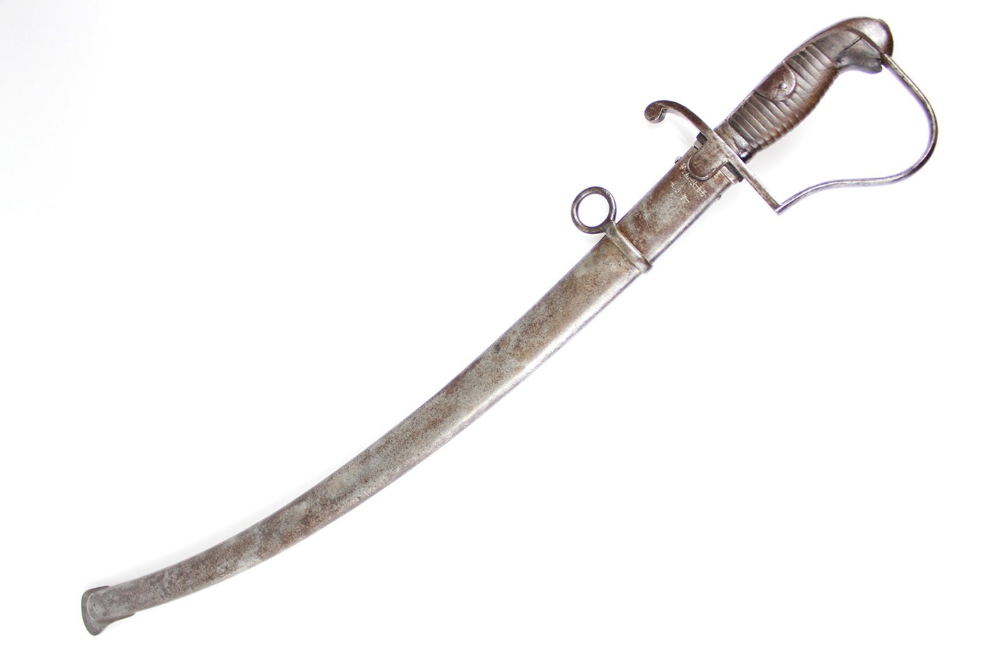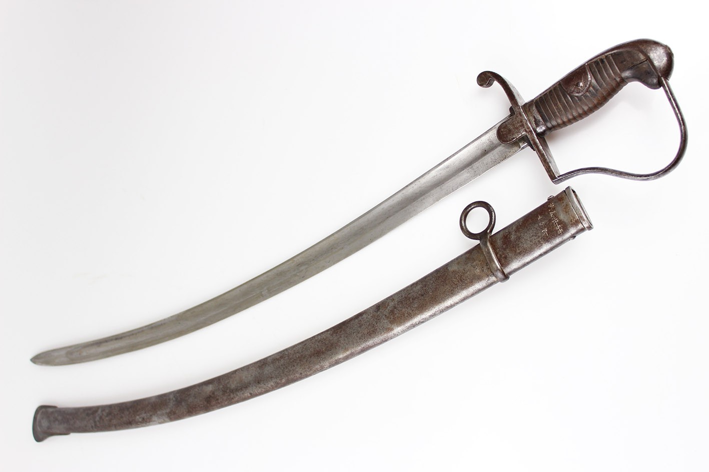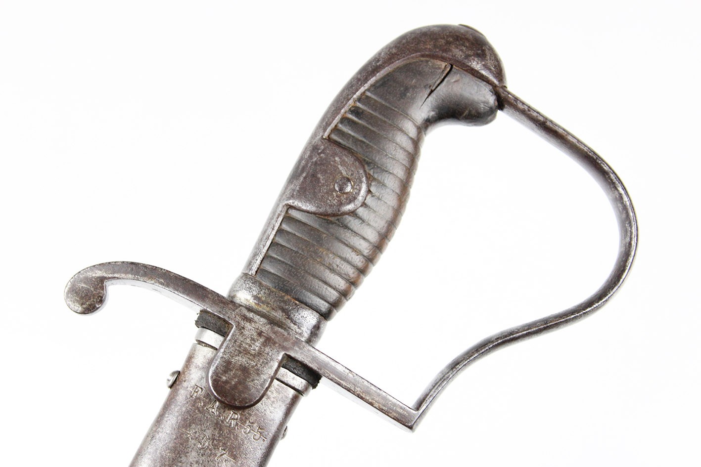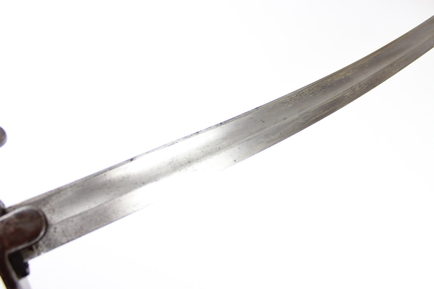 Pruska szabla artyleryjska neuer Art przyjęta na stan armii w 1916 roku. Głownia obustronnie szlifowana w jedną przygrzbietową bruzdę. Na progu nasady pod wąsem wybita marka firmy F.W. HOLLER. Na grzbiecie nasady wybite W pod koroną ( Wilhelm II), cyfra 16, oraz cecha kontroli technicznej. Rękojeść stalowa jednokabłąkowa. Uchwyt z ciemnobrązowego drewna. Pochwa z blachy stalowej z nieruchomym kółkiem nośnym i prostokątną antybabką. Szyjka pochwy zakończona kołnierzem i zabezpieczona po obu stronach wkrętami. Na szyjce pochwy wybite przekreślone oznaczenie pułkowe F.A.R.55. ( 55 Pułk Artylerii Polowej- 2 Turyngski) z drugiej strony R.A.R. 51 Pochwa i rękojeść w strychowym stanie zachowania z delikatną kaszką. Głownia pięknie zachowana, prosta. Jedynym mankamentem jest delikatne pęknięcie uchwytu widoczne na zdjęciach. Dokładnie to co na fotografiach.