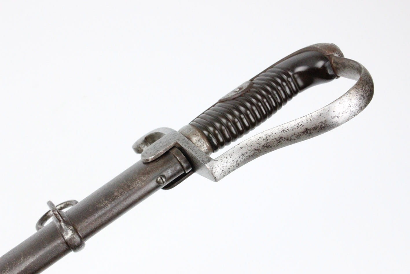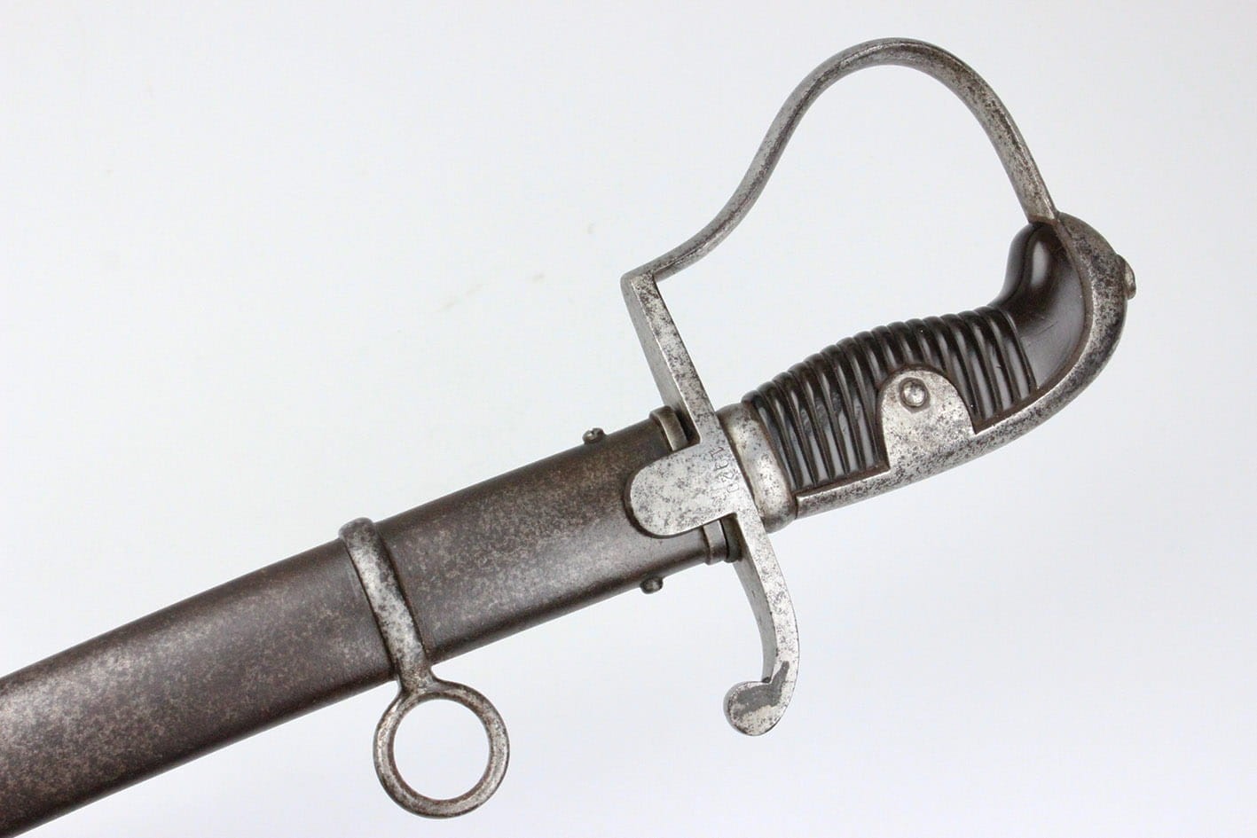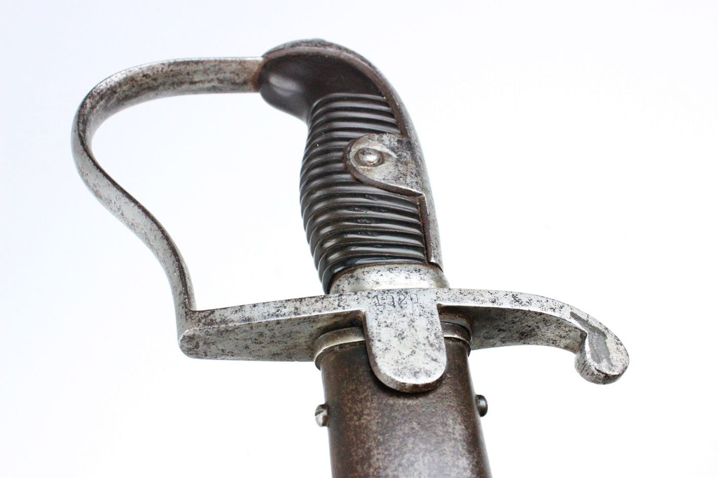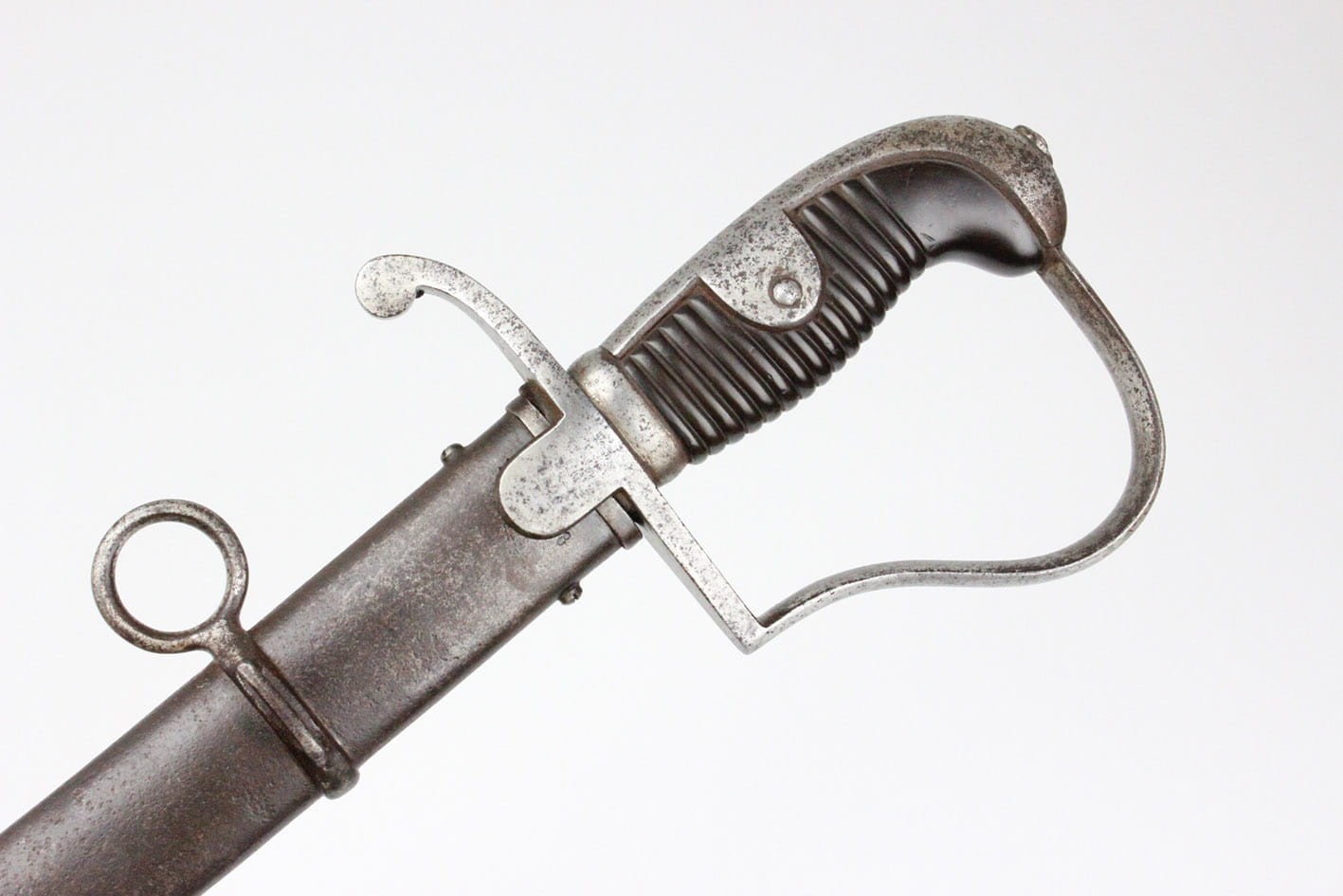 Pruska szabla artyleryjska neuer Art przyjęta na stan armii w 1915 roku a stosowana jeszcze do końca Republiki Weimarskiej. Głownie obustronnie szlifowana w jedną przygrzbietową bruzdę. Na progu nasady pod wąsem wybita marka firmy CLEMEN & JUNG SOLINGEN. Na grzbiecie nasady wybite W pod koroną ( Wilhelm II), cyfra 15 ( oznaczenie przyjęcia na stan armi w 1915 roku), oraz cecha kontroli technicznej. Rękojeść stalowa jednokabłąkowa. Po stronie zewnętrznej kabłąka rękojeści wybite oznaczenie 1920, wskazujące że szabla została zinwentaryzowana na mocy traktatu wersalskiego i po 1920 r. przyjęta do Weimarskiej Reichswehry. Uchwyt z ciemnobrązowego bakielitu. Pochwa z blachy stalowej z nieruchomym kółkiem nośnym i prostokątną antybabką. Szyjka pochwy zakończona kołnierzem i zabezpieczona po obu stronach wkrętami. Na szyjce pochwy wybite oznaczenie pułkowe 1.2.G.38.Pochwa i rękojeść w strychowym stanie zachowania z delikatną kaszką. Głownia pięknie zachowana, prosta. Dokładnie to co na fotografiach.