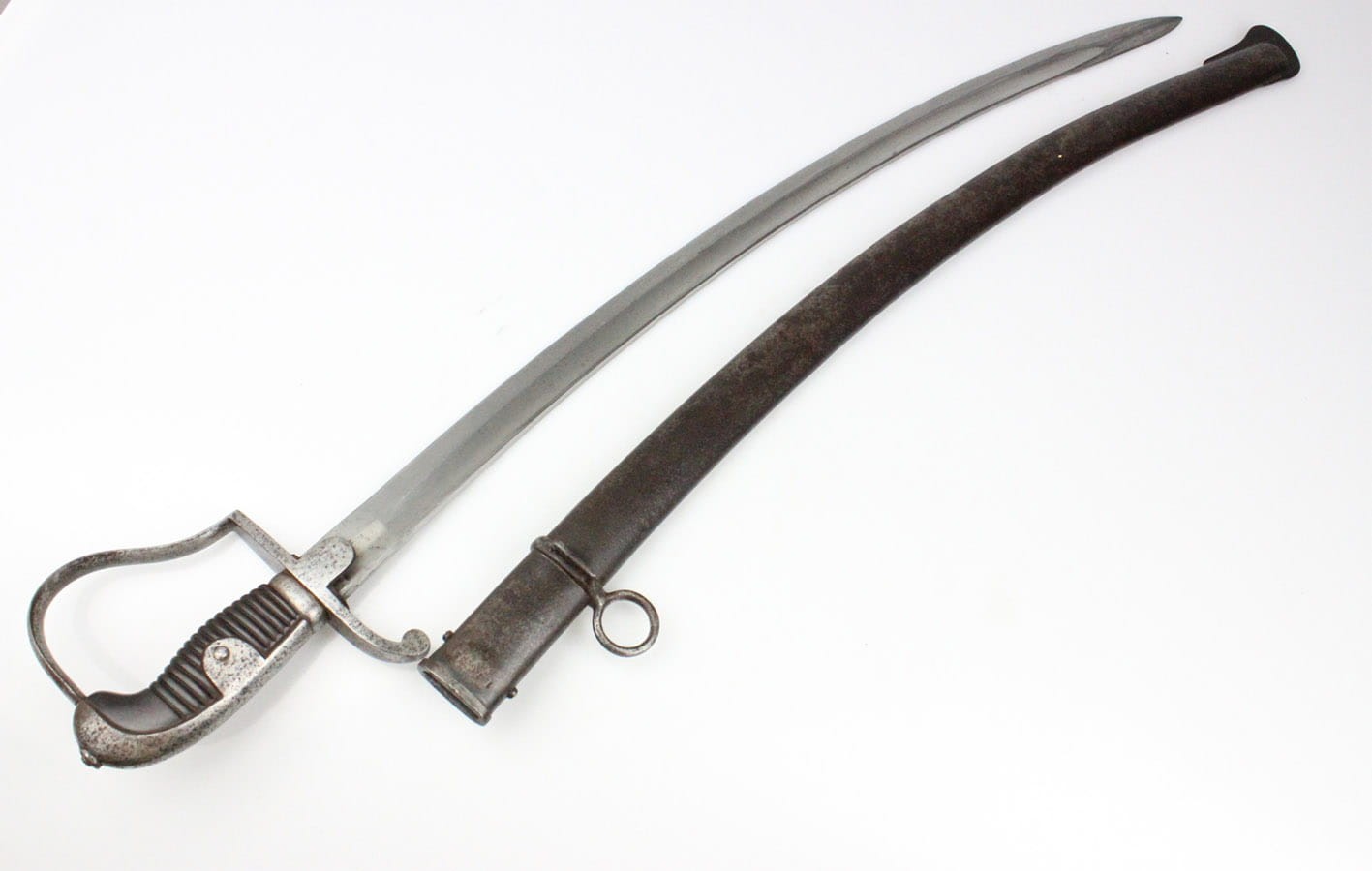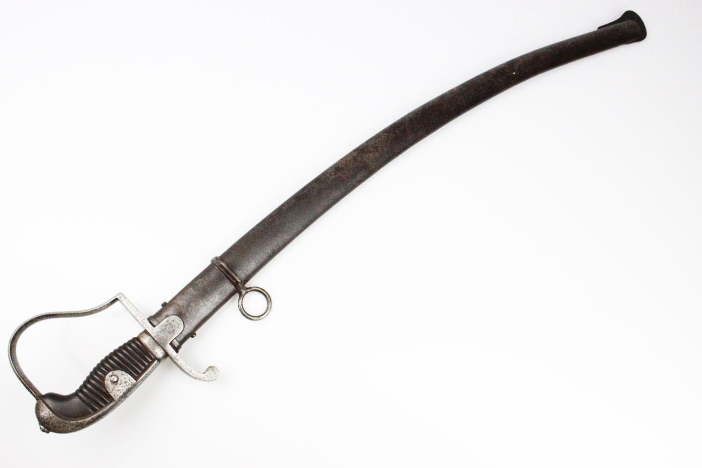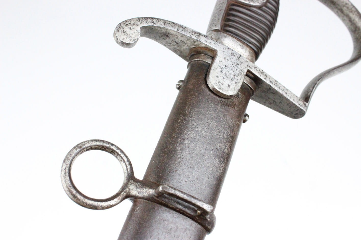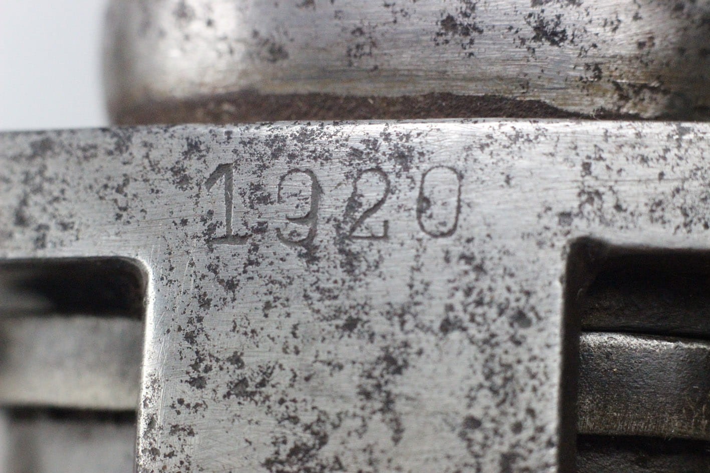 Pruska szabla artyleryjska neuer Art przyjęta na stan armii w 1915 roku a stosowana jeszcze do końca Republiki Weimarskiej. Głownie obustronnie szlifowana w jedną przygrzbietową bruzdę. Na progu nasady pod wąsem wybita marka firmy CLEMEN & JUNG SOLINGEN. Na grzbiecie nasady wybite W pod koroną ( Wilhelm II), cyfra 15 ( oznaczenie przyjęcia na stan armi w 1915 roku), oraz cecha kontroli technicznej. Rękojeść stalowa jednokabłąkowa. Po stronie zewnętrznej kabłąka rękojeści wybite oznaczenie 1920, wskazujące że szabla została zinwentaryzowana na mocy traktatu wersalskiego i po 1920 r. przyjęta do Weimarskiej Reichswehry. Uchwyt z ciemnobrązowego bakielitu. Pochwa z blachy stalowej z nieruchomym kółkiem nośnym i prostokątną antybabką. Szyjka pochwy zakończona kołnierzem i zabezpieczona po obu stronach wkrętami. Na szyjce pochwy wybite oznaczenie pułkowe 1.2.G.38.Pochwa i rękojeść w strychowym stanie zachowania z delikatną kaszką. Głownia pięknie zachowana, prosta. Dokładnie to co na fotografiach.