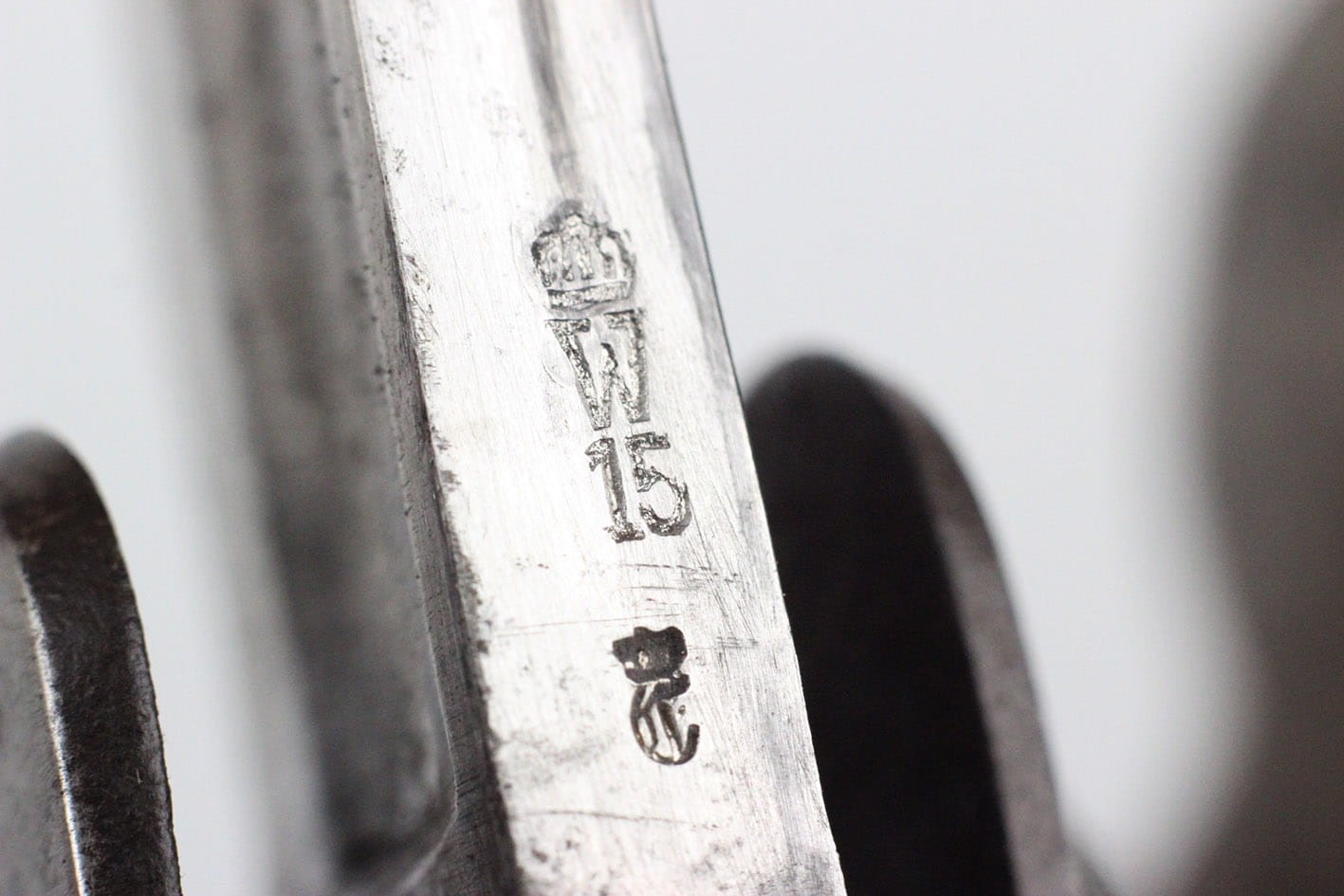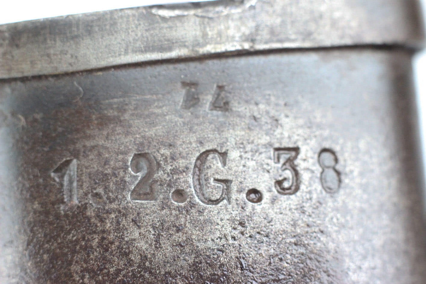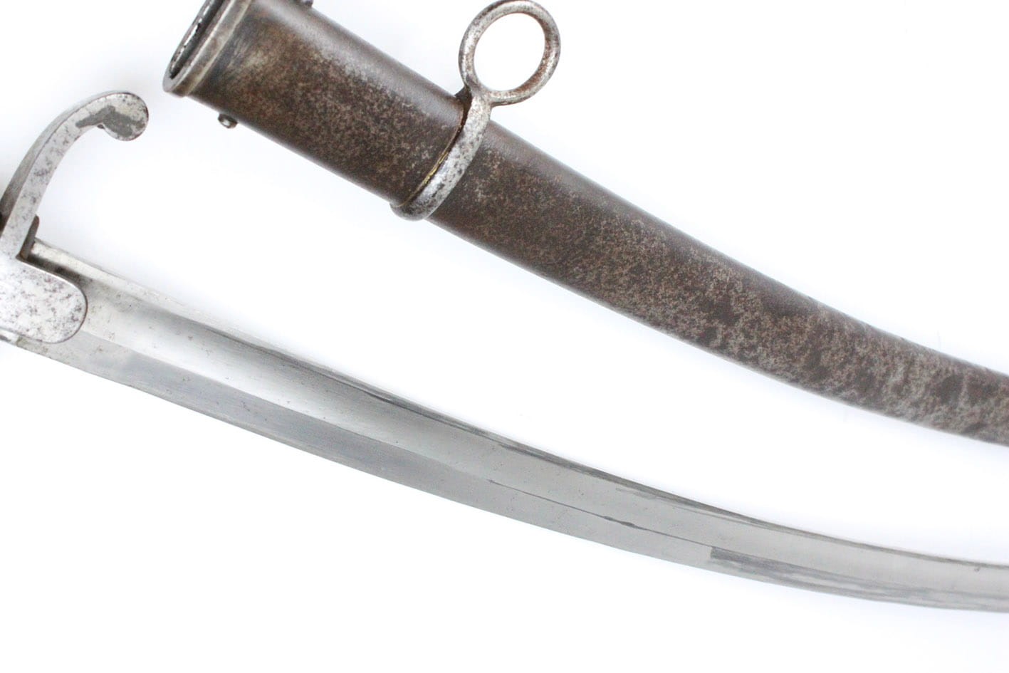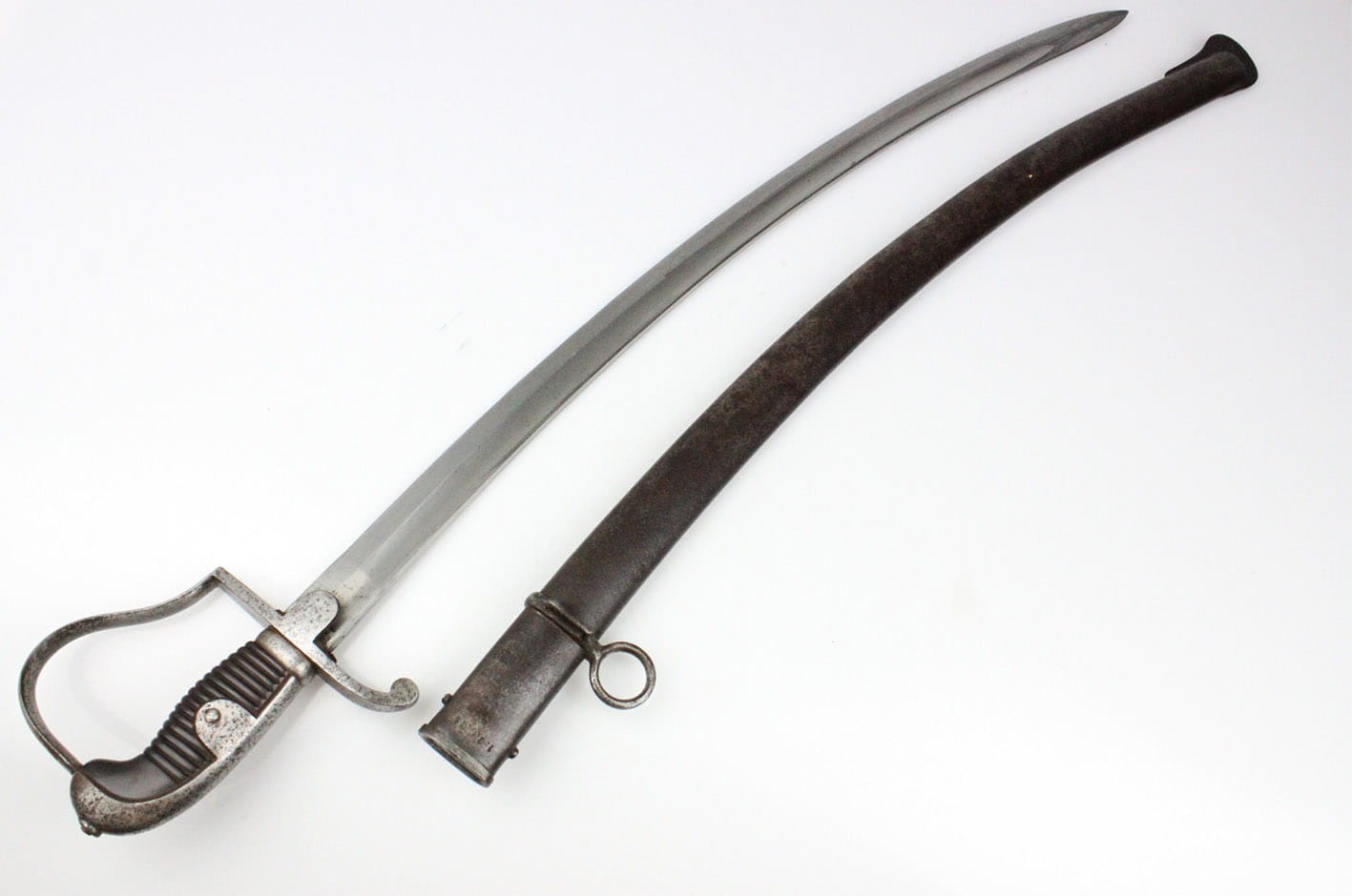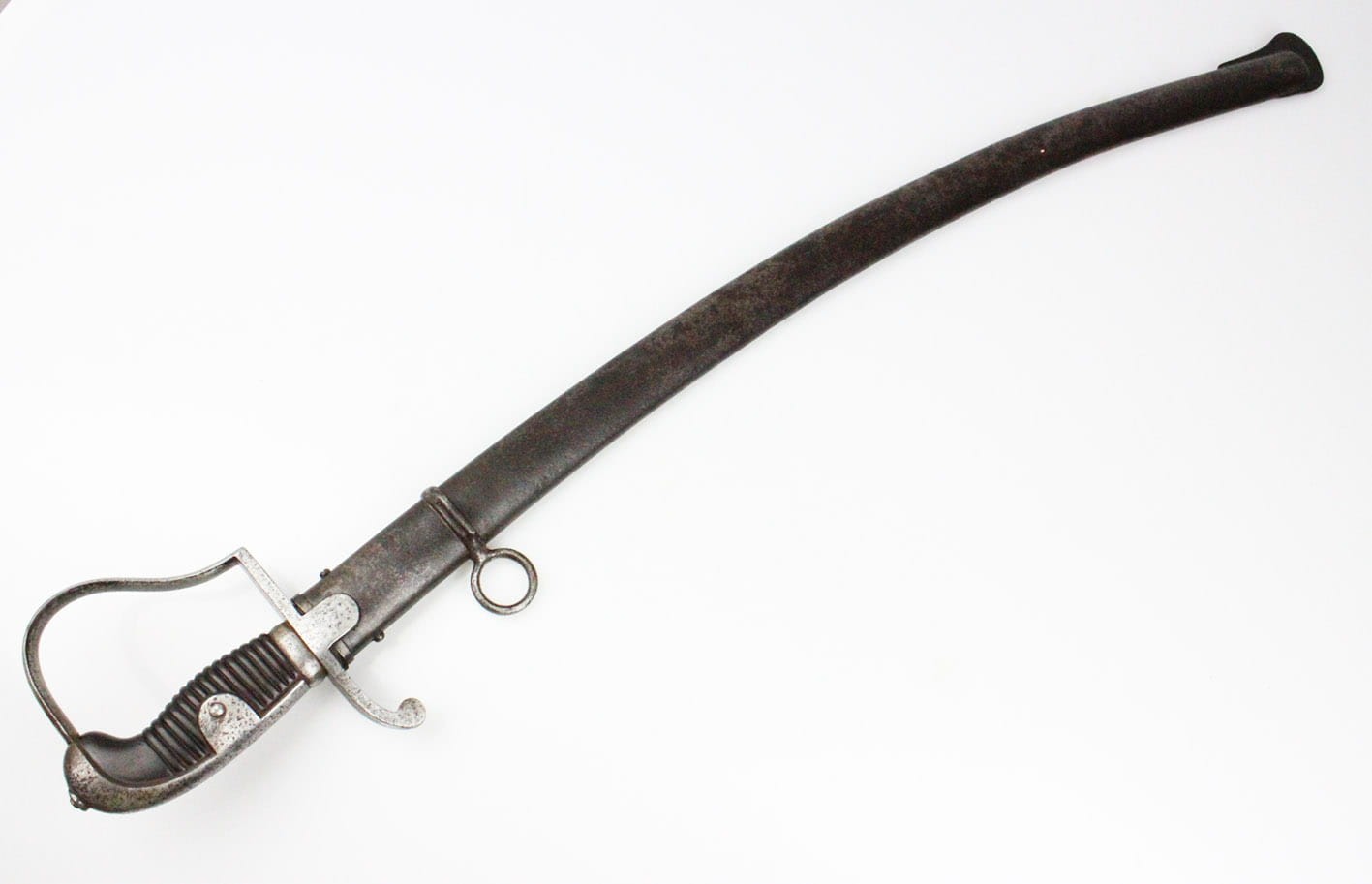 Pruska szabla artyleryjska neuer Art przyjęta na stan armii w 1915 roku a stosowana jeszcze do końca Republiki Weimarskiej. Głownie obustronnie szlifowana w jedną przygrzbietową bruzdę. Na progu nasady pod wąsem wybita marka firmy CLEMEN & JUNG SOLINGEN. Na grzbiecie nasady wybite W pod koroną ( Wilhelm II), cyfra 15 ( oznaczenie przyjęcia na stan armi w 1915 roku), oraz cecha kontroli technicznej. Rękojeść stalowa jednokabłąkowa. Po stronie zewnętrznej kabłąka rękojeści wybite oznaczenie 1920, wskazujące że szabla została zinwentaryzowana na mocy traktatu wersalskiego i po 1920 r. przyjęta do Weimarskiej Reichswehry. Uchwyt z ciemnobrązowego bakielitu. Pochwa z blachy stalowej z nieruchomym kółkiem nośnym i prostokątną antybabką. Szyjka pochwy zakończona kołnierzem i zabezpieczona po obu stronach wkrętami. Na szyjce pochwy wybite oznaczenie pułkowe 1.2.G.38.Pochwa i rękojeść w strychowym stanie zachowania z delikatną kaszką. Głownia pięknie zachowana, prosta. Dokładnie to co na fotografiach.