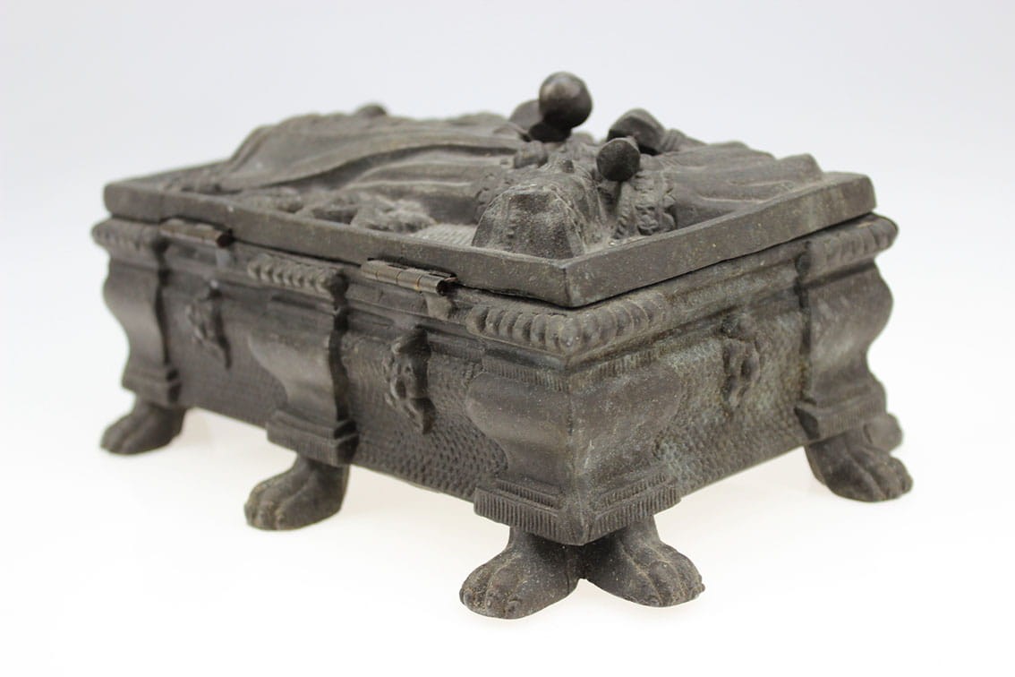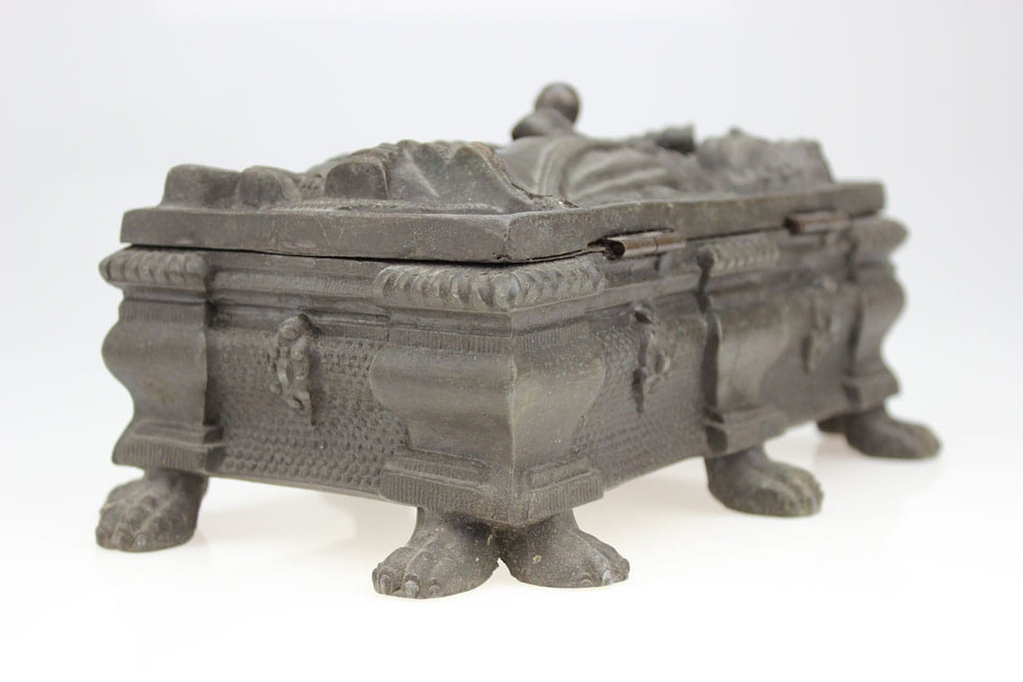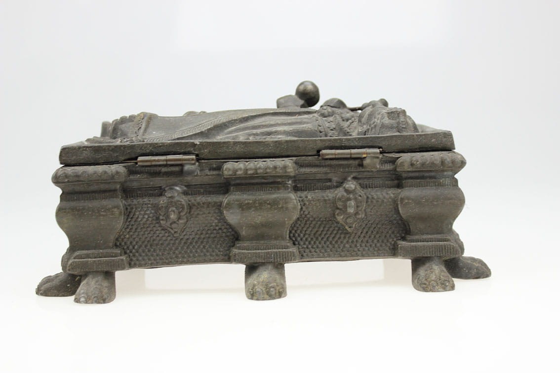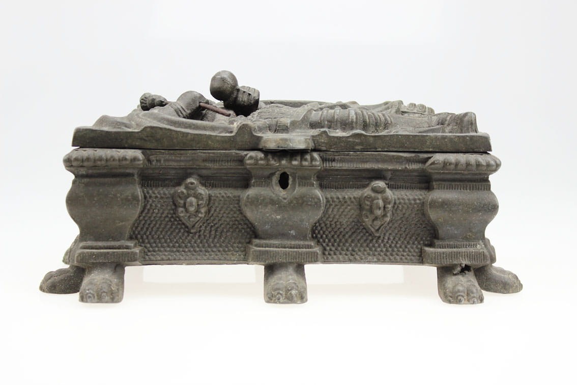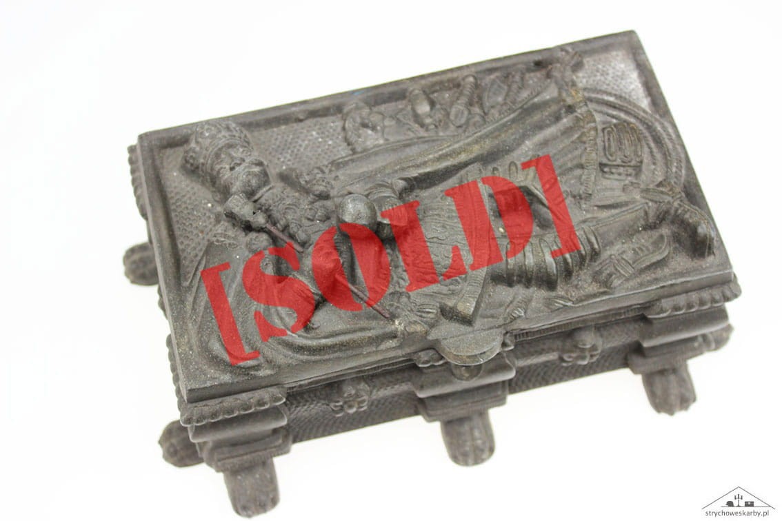 Szkatułka sarkofagowa zaprojektowana przez Kazimierza Stronczyńskiego oraz Wojciecha Święckiego wg nagrobka króla Batorego w Katedrze na Wawelu, autorstwa Santi Gucciego z 1595 roku. Przedmiot wykonany w warszawskiej fabryce Karola Mintera około 1857 roku. Korpus szkatuły osadzony na lwich łapach, boki wybrzuszone, z dekoracyjnymi okuciami. Wieko z przedstawieniem płaskorzeźby z nagrobka Stefana Batorego. Król przedstawiony w zbroi i płaszczu koronacyjnym, zgodnie z panującą w XVI w. tendencją – jako osoba żyjąca. Batory spoczywa na wznak, lecz z uniesionym torsem, wspartym na ręce. Przedmiot o wymiarach 6 x 11 x 21 cm, wykonany został ze stopu cynkowego. Szkatułka zaopatrzona jest w zawiasy i zamek.