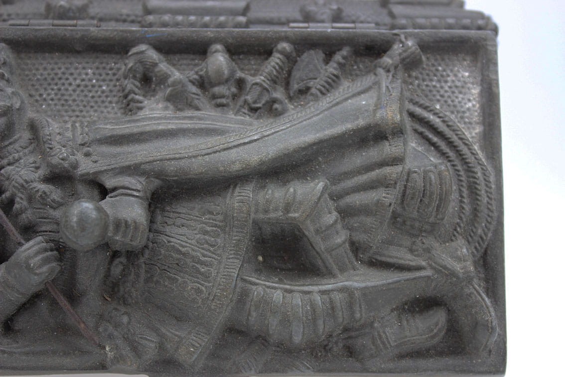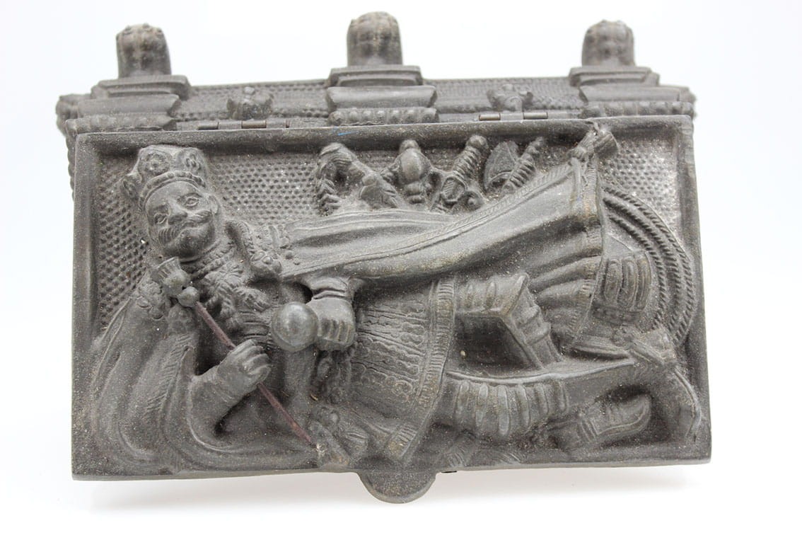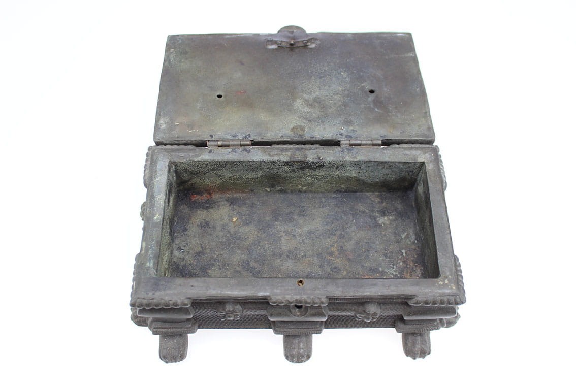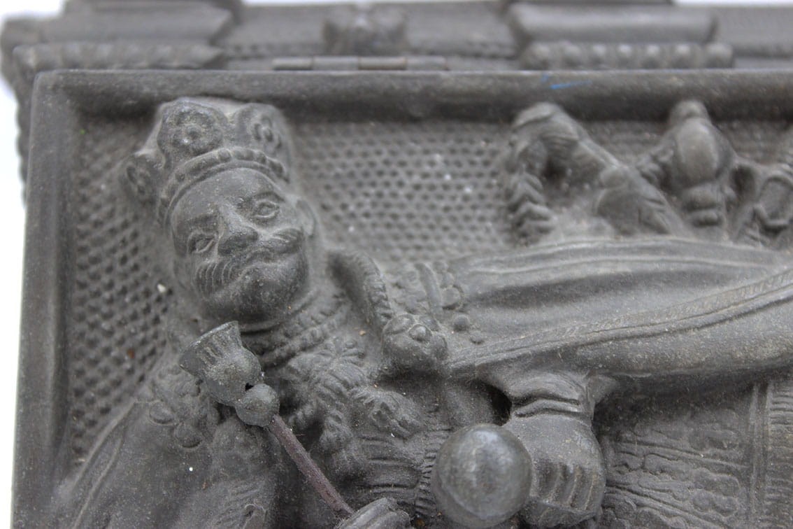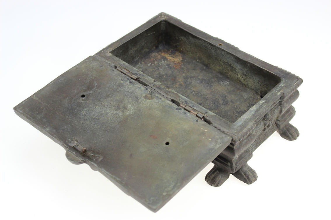 Szkatułka sarkofagowa zaprojektowana przez Kazimierza Stronczyńskiego oraz Wojciecha Święckiego wg nagrobka króla Batorego w Katedrze na Wawelu, autorstwa Santi Gucciego z 1595 roku. Przedmiot wykonany w warszawskiej fabryce Karola Mintera około 1857 roku. Korpus szkatuły osadzony na lwich łapach, boki wybrzuszone, z dekoracyjnymi okuciami. Wieko z przedstawieniem płaskorzeźby z nagrobka Stefana Batorego. Król przedstawiony w zbroi i płaszczu koronacyjnym, zgodnie z panującą w XVI w. tendencją – jako osoba żyjąca. Batory spoczywa na wznak, lecz z uniesionym torsem, wspartym na ręce. Przedmiot o wymiarach 6 x 11 x 21 cm, wykonany został ze stopu cynkowego. Szkatułka zaopatrzona jest w zawiasy i zamek.