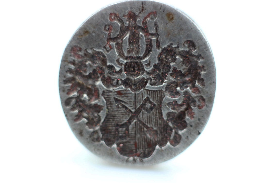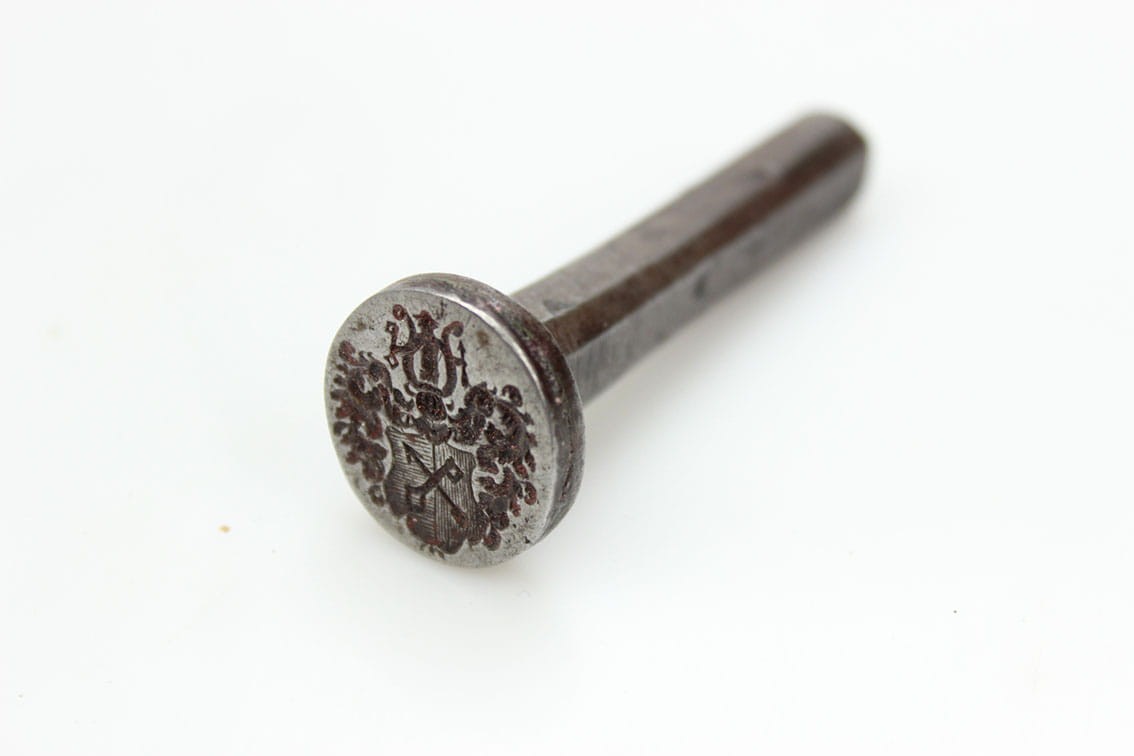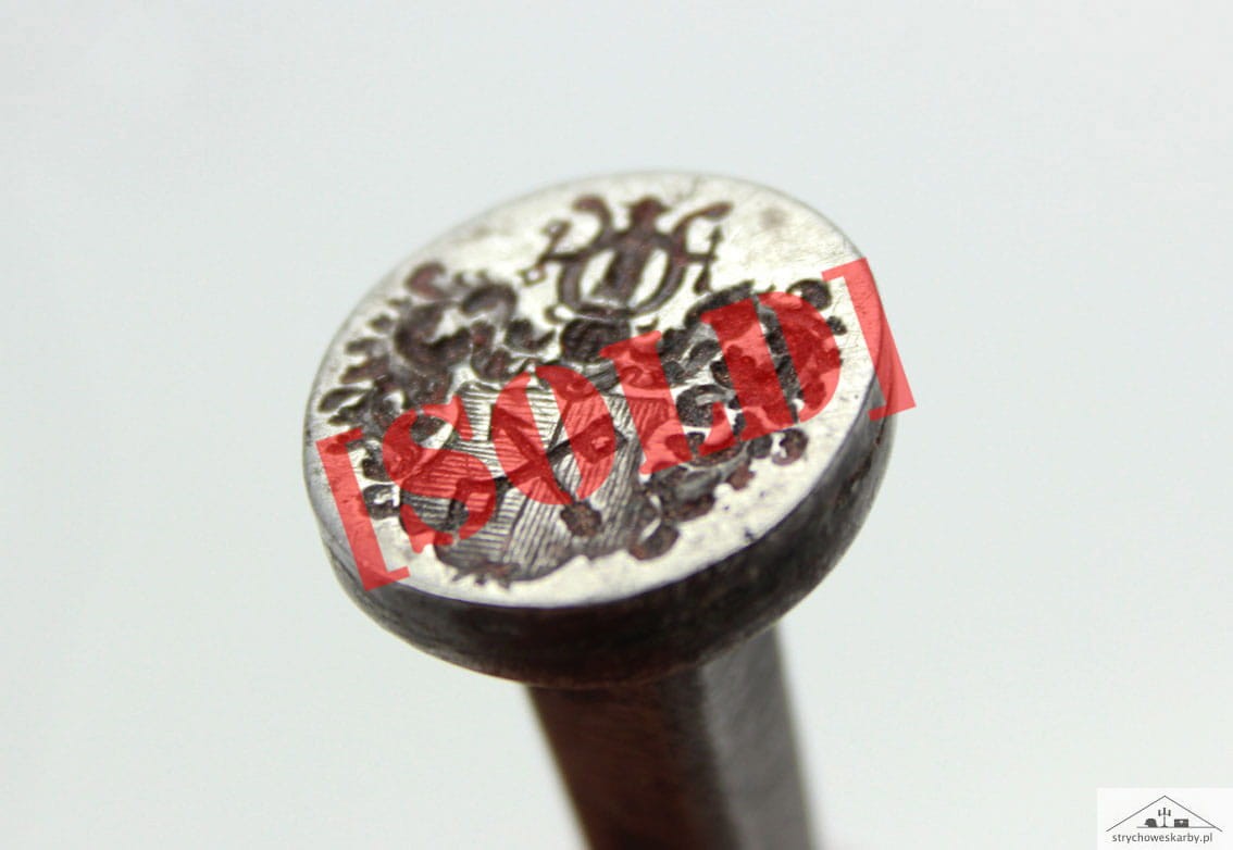 Przepięknie zachowany XVIII wieczny tłok pieczętny- pieczęć lakowa. Rewelacyjnie zachowana tarcza herbowa z dobrze widocznymi wszelkimi szczegółami. Przedmiot wykonany z żelaza.