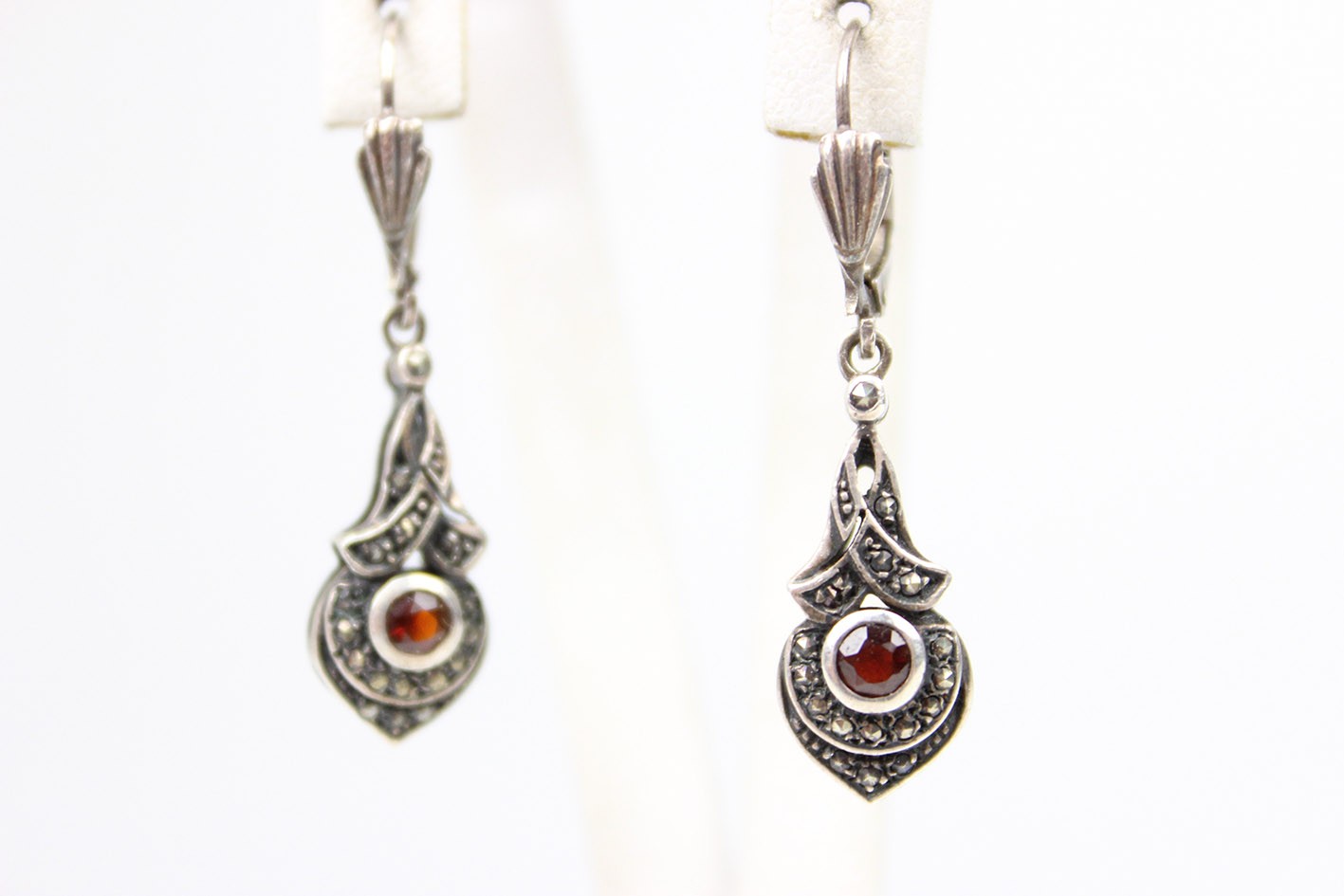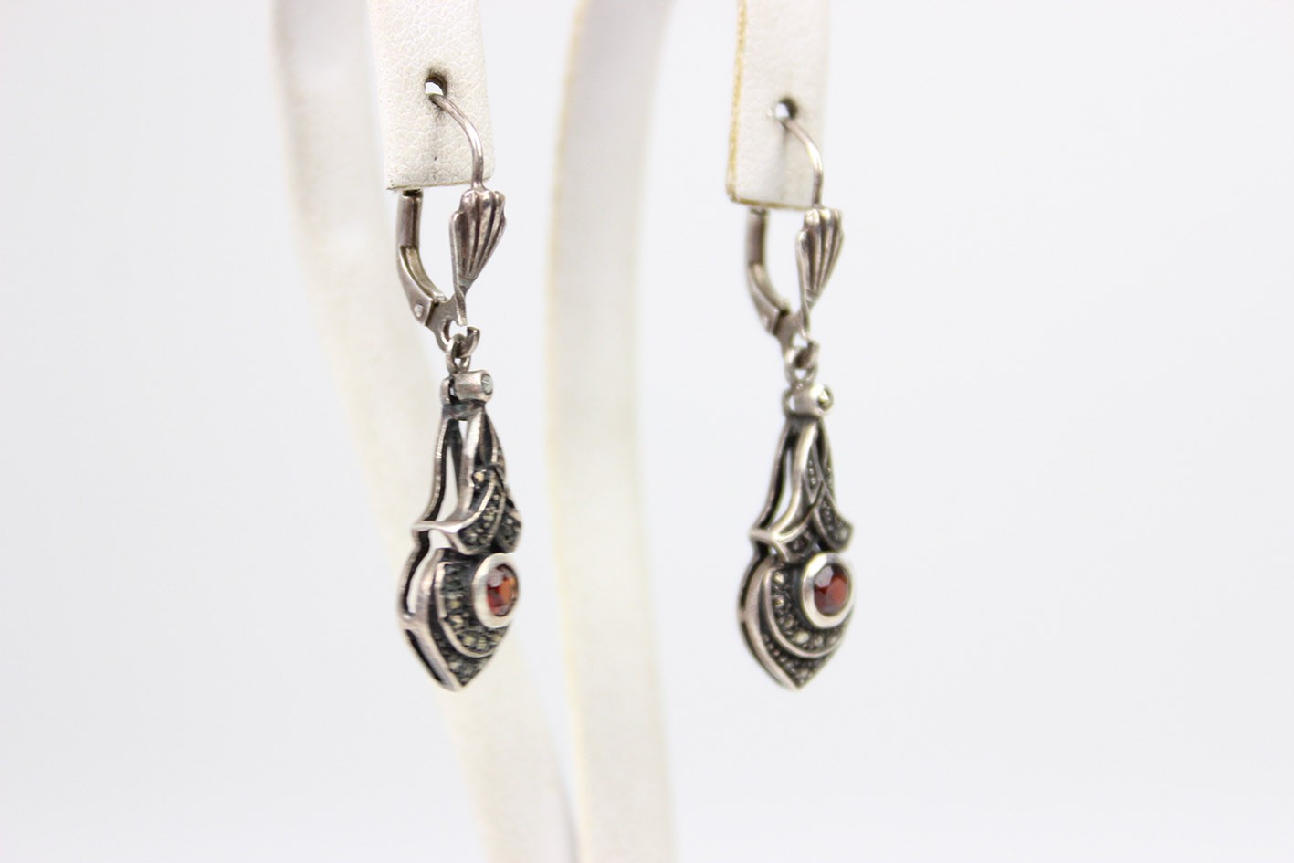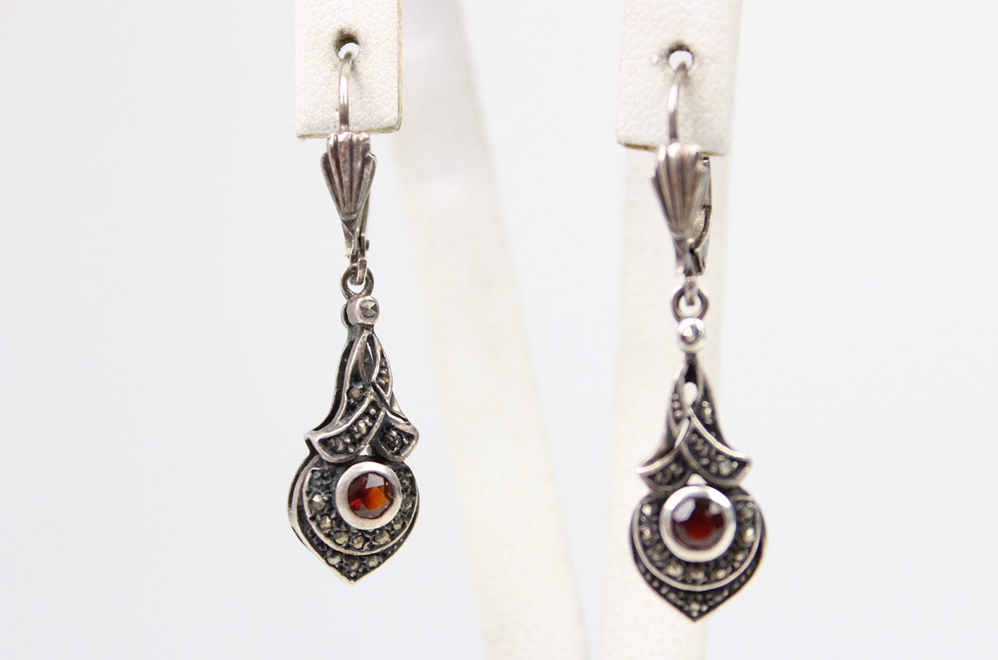 Eleganckie kolczyki z lat 80. XX wieku, stylizowane na okres Art Deco. Wyrób wykonany w srebrze próby 925, zdobiony markazytami oraz centralnie osadzonymi naturalnymi granatami o głębokiej, winnej barwie. Forma smukła, wydłużona, nawiązująca do klasycznych wzorów międzywojennych. Zapięcia typu bigle, sprawne i wygodne w użytkowaniu. Stan zachowania bardzo dobry z delikatną, naturalną patyną. Wymiary: