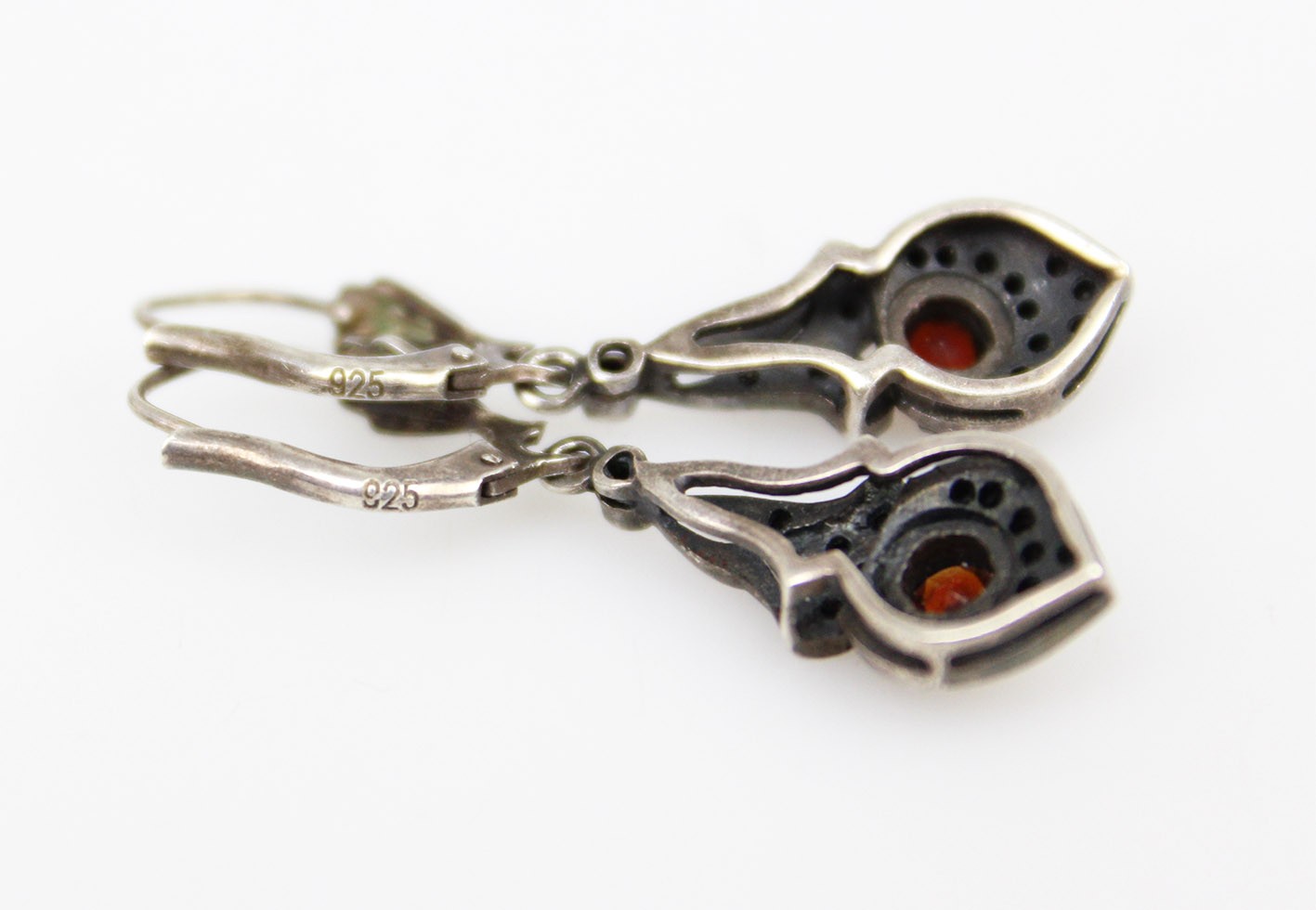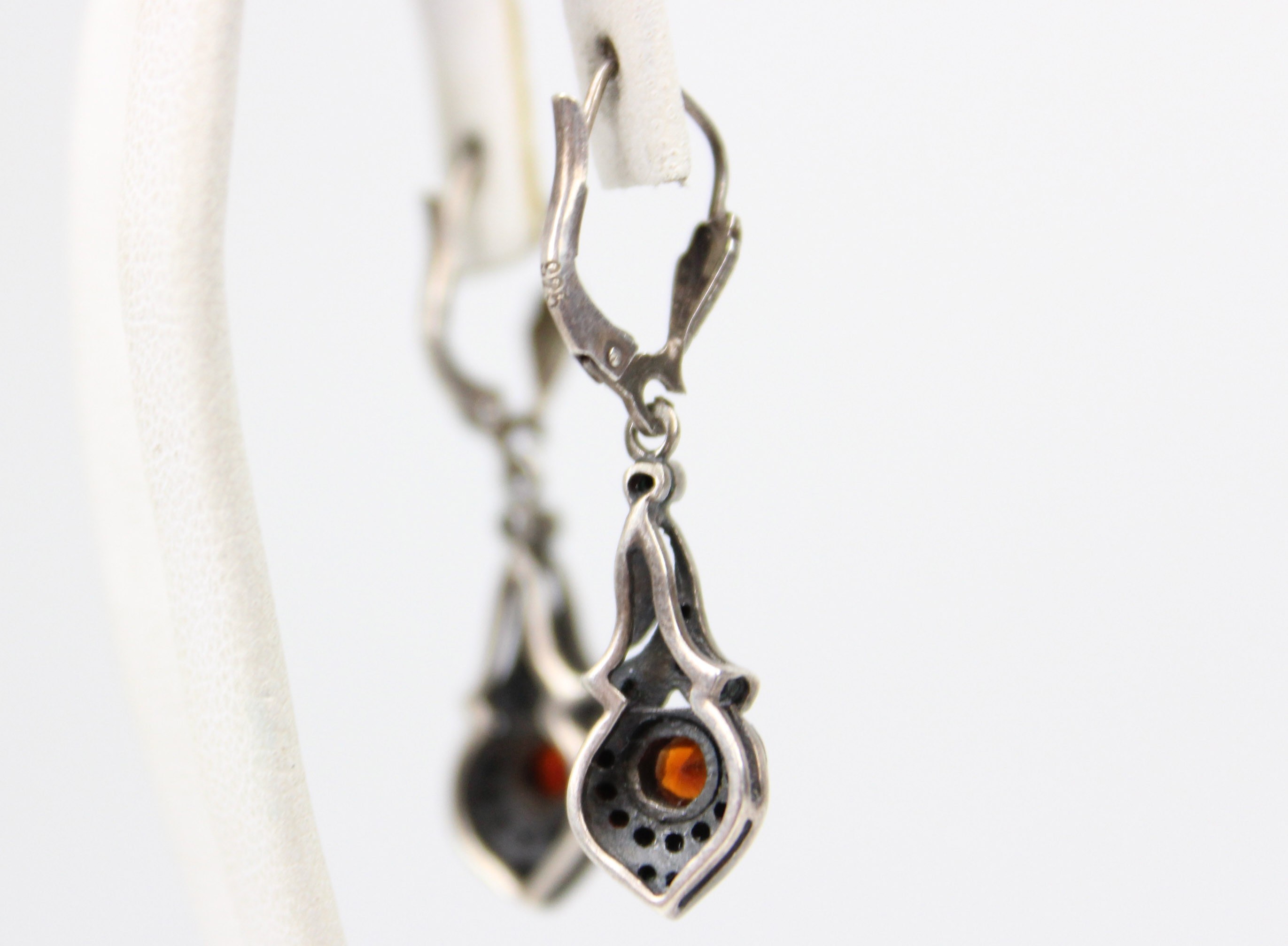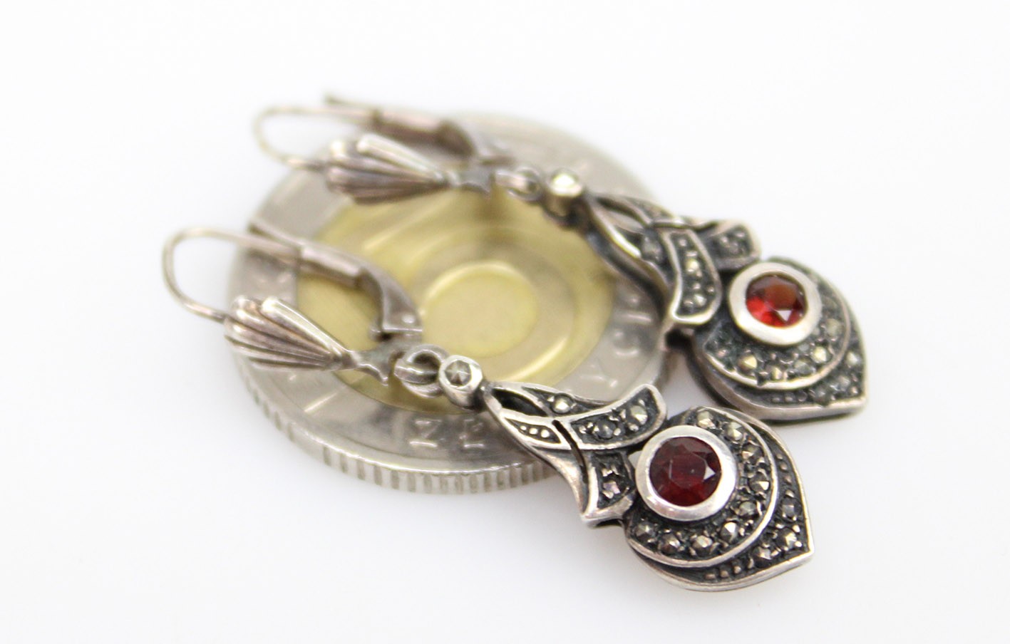 Eleganckie kolczyki z lat 80. XX wieku, stylizowane na okres Art Deco. Wyrób wykonany w srebrze próby 925, zdobiony markazytami oraz centralnie osadzonymi naturalnymi granatami o głębokiej, winnej barwie. Forma smukła, wydłużona, nawiązująca do klasycznych wzorów międzywojennych. Zapięcia typu bigle, sprawne i wygodne w użytkowaniu. Stan zachowania bardzo dobry z delikatną, naturalną patyną. Wymiary: