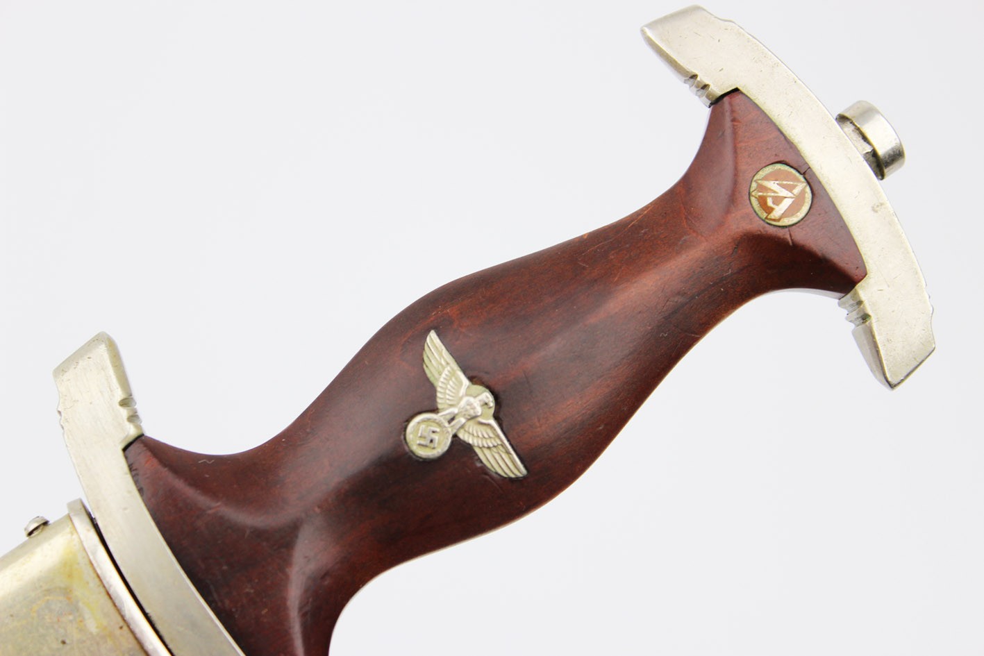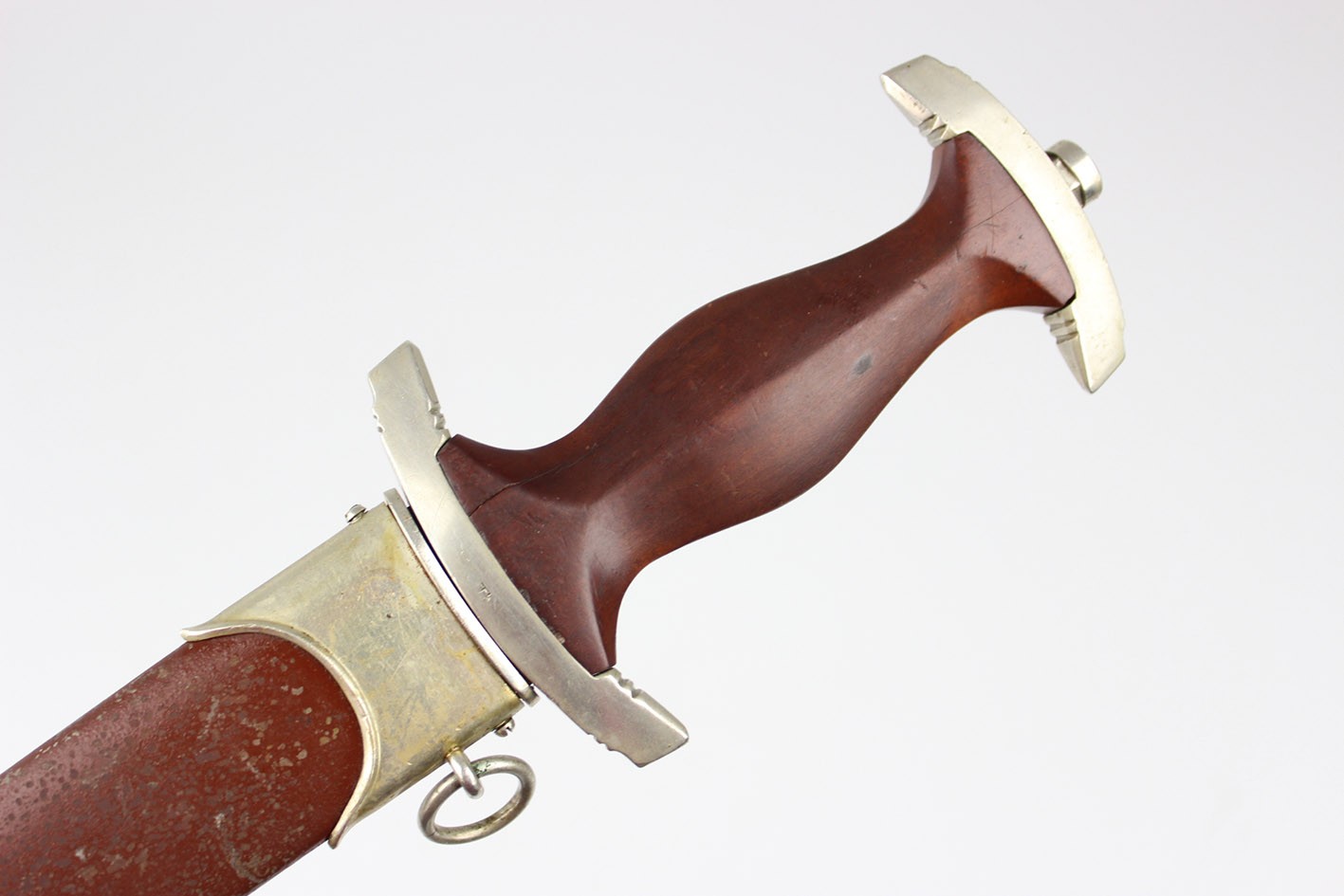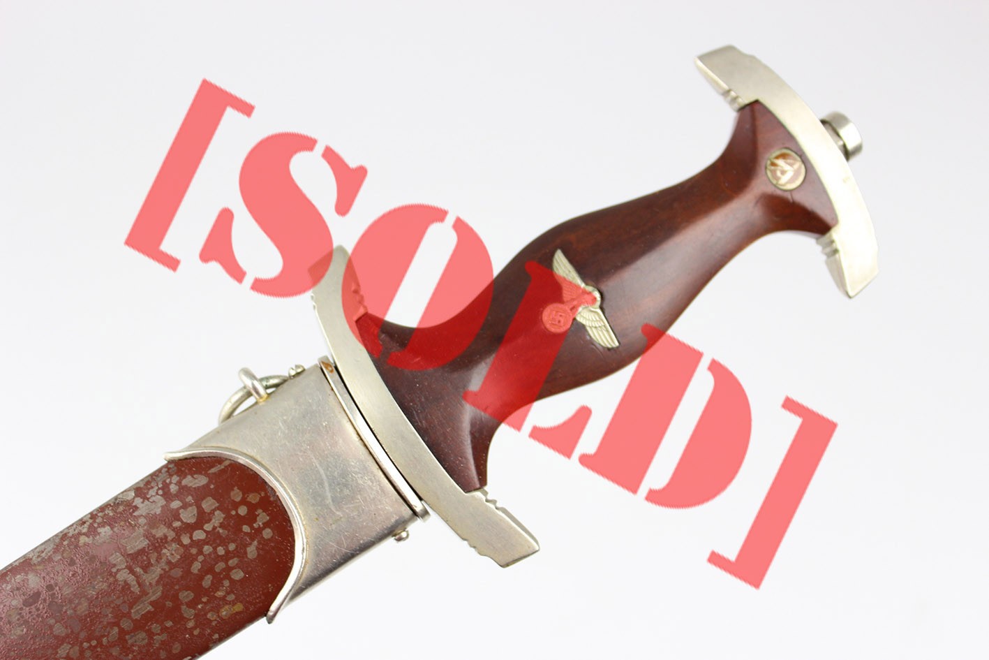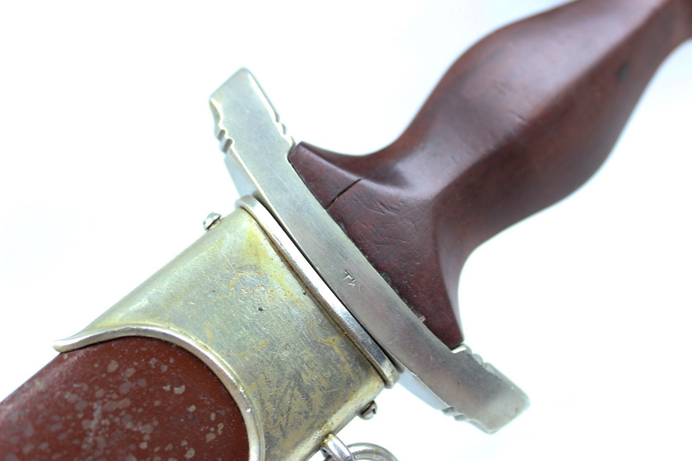 Ten wyjątkowy egzemplarz zachowany w pierwotnym stanie, bez jakiejkolwiek ingerencji. Wszystkie elementy stanowią nierozerwalny komplet. Pochwa wykonana ze stali, wyposażona w alpakowe okucia ( lekko wgięta kulka końcowa) z kompletem oryginalnych śrub, zachowała swój charakterystyczny wygląd. Oryginalna brązowa farba, mimo drobnych śladów powierzchniowej rdzy, całkiem dobrze się prezentuje. Dławik jest solidny, stabilny i trzyma mocno. Głownia kordzika z dobrym stanem zachowania. Napis "Alles für Deutschland" jest wyraźny i głęboko wyeksponowany. Trawienie producenta jest czytelne. Jelce, orzełek, pin oraz śrubę mocującą wykonano z alpaki, a dolny jelec zgodnie z charakterystyką wczesnych modeli nosi sygnaturę przynależności do grupy SA – w tym przypadku "Th" (Thuringen). Wszystkie elementy są idealnie dopasowane i pochodzą z tego samego kordzika.