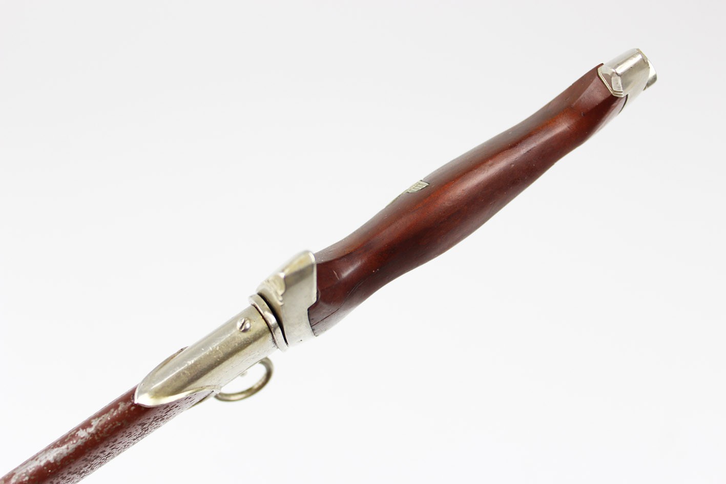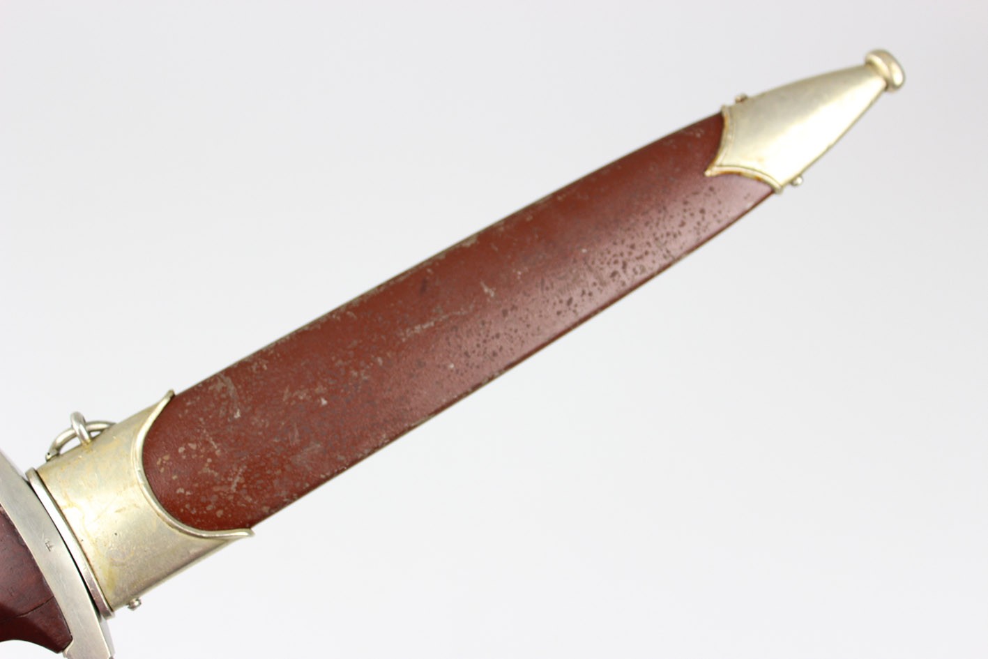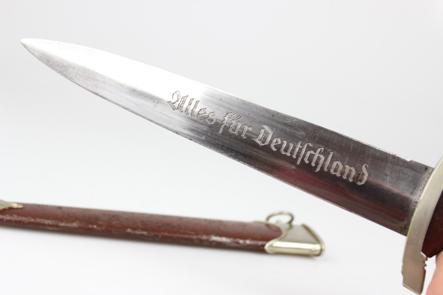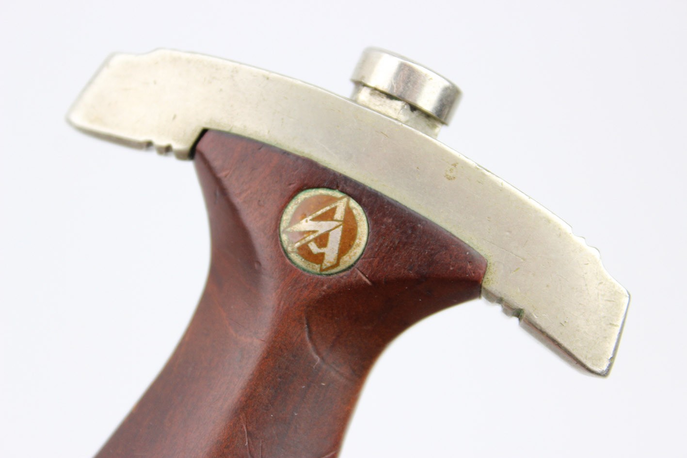 Ten wyjątkowy egzemplarz zachowany w pierwotnym stanie, bez jakiejkolwiek ingerencji. Wszystkie elementy stanowią nierozerwalny komplet. Pochwa wykonana ze stali, wyposażona w alpakowe okucia ( lekko wgięta kulka końcowa) z kompletem oryginalnych śrub, zachowała swój charakterystyczny wygląd. Oryginalna brązowa farba, mimo drobnych śladów powierzchniowej rdzy, całkiem dobrze się prezentuje. Dławik jest solidny, stabilny i trzyma mocno. Głownia kordzika z dobrym stanem zachowania. Napis "Alles für Deutschland" jest wyraźny i głęboko wyeksponowany. Trawienie producenta jest czytelne. Jelce, orzełek, pin oraz śrubę mocującą wykonano z alpaki, a dolny jelec zgodnie z charakterystyką wczesnych modeli nosi sygnaturę przynależności do grupy SA – w tym przypadku "Th" (Thuringen). Wszystkie elementy są idealnie dopasowane i pochodzą z tego samego kordzika.