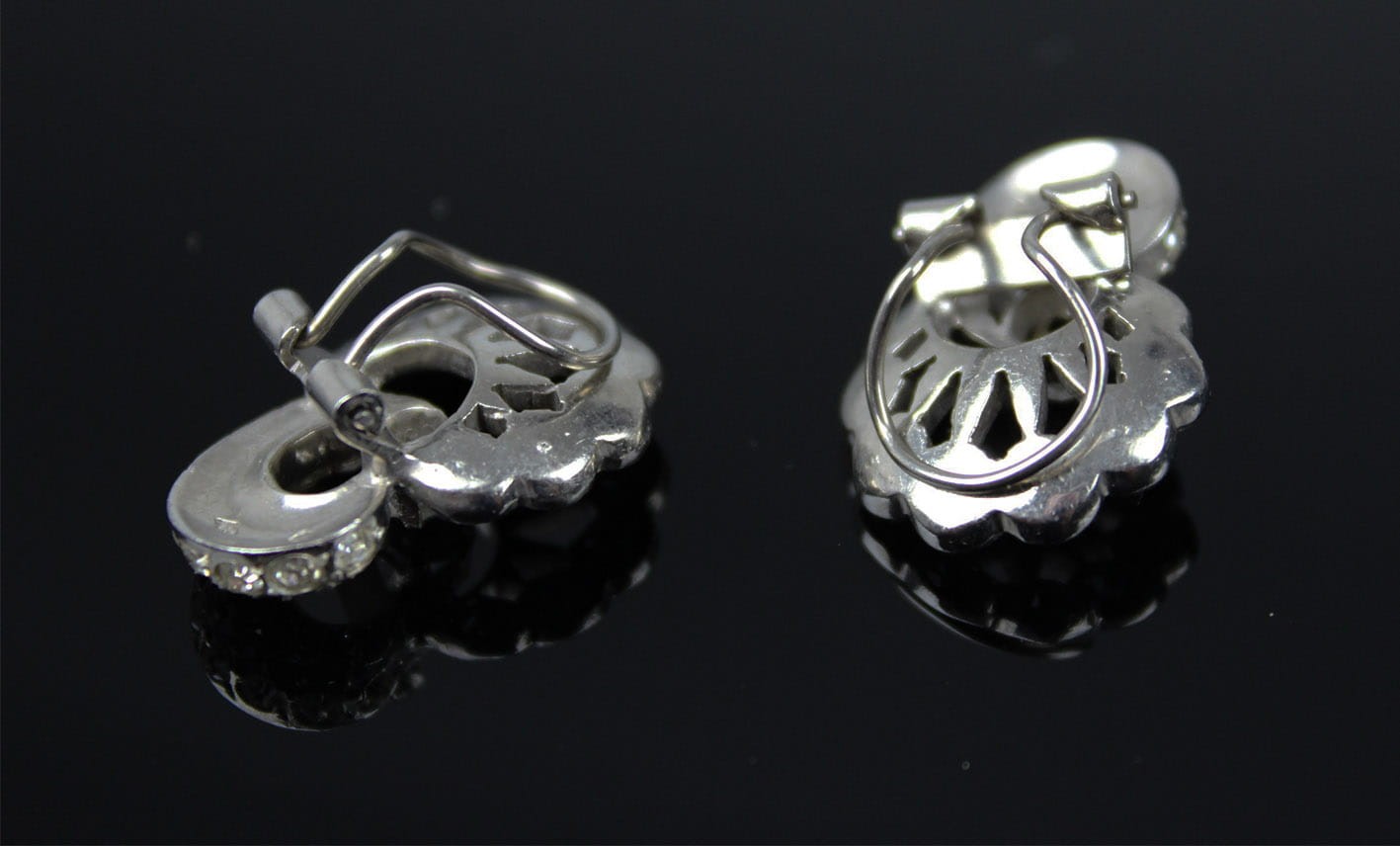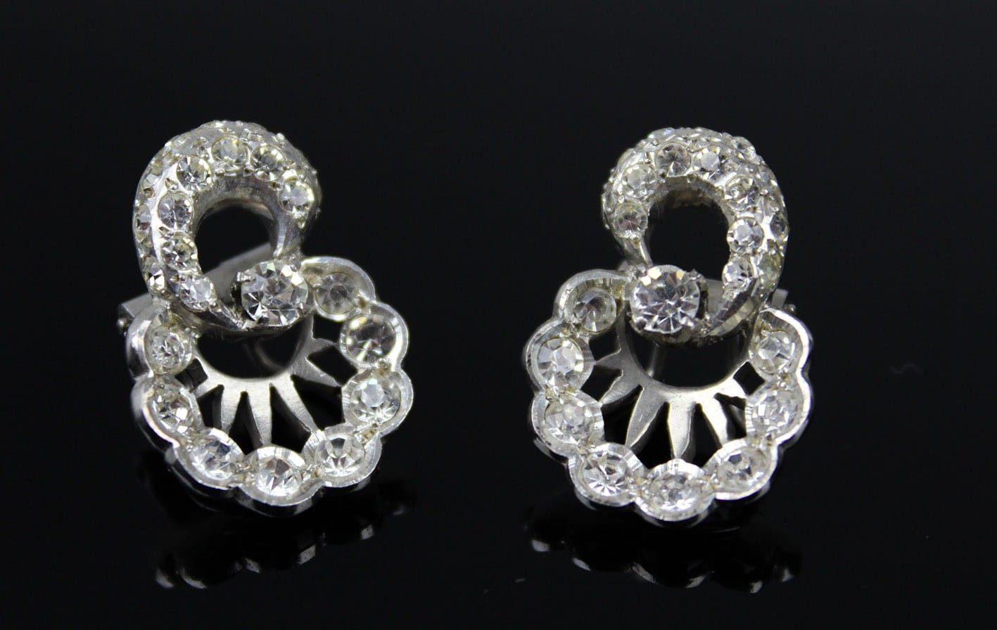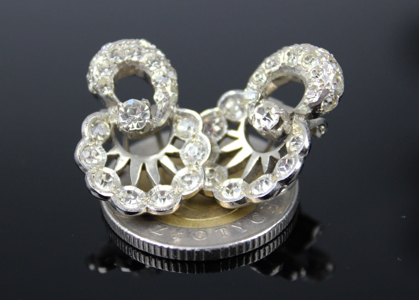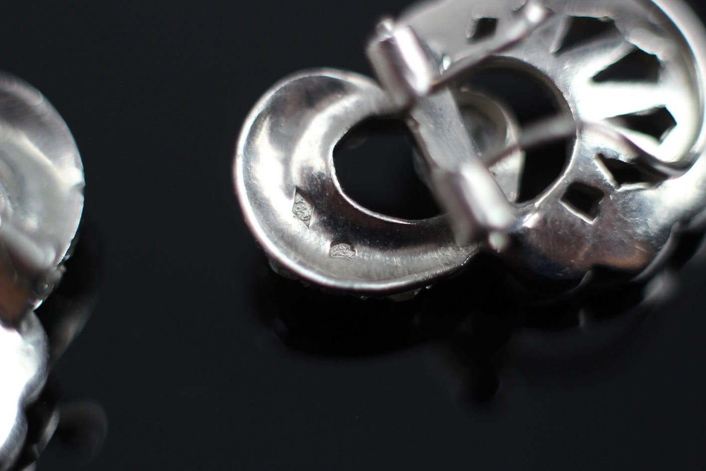 Klipsy z okresu Art Deco, epoki która zachwycała nowoczesnym podejściem do formy, elegancją i geometrycznymi liniami. Wykonane z chromowanego srebra, sygnowane na rewersie francuskimi puncami probierczymi dla srebra próby 800. Te klipsy wyróżniają się subtelnym, ale efektownym designem. Zdobione fasetowanym strasem, który wspaniale odbija światło, doskonale imituje brylanty. Ażurowy wzór nadaje im lekkości i wyrafinowanego charakteru, będącego cechą rozpoznawczą stylu Art Deco. Wymiary: