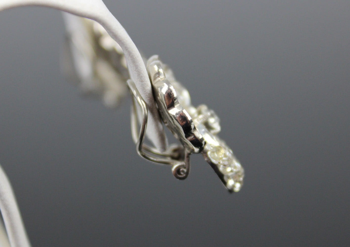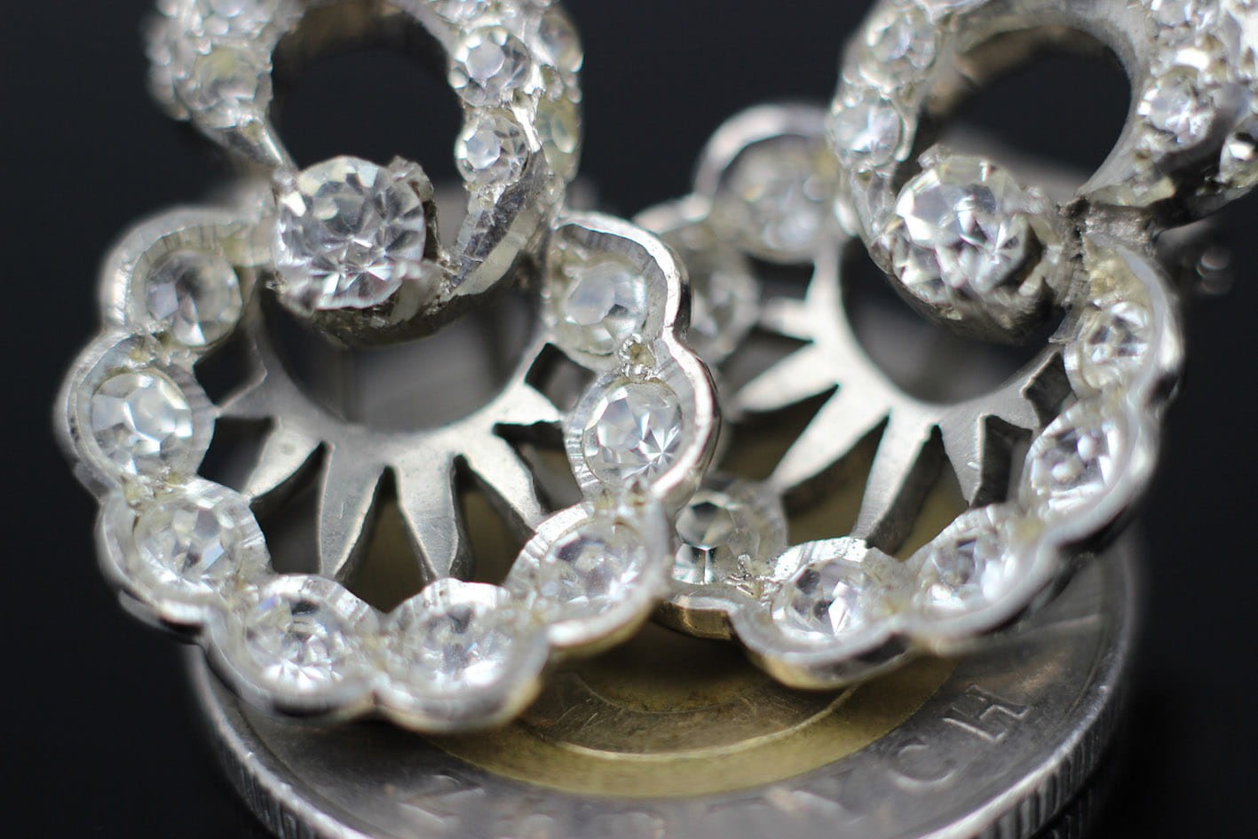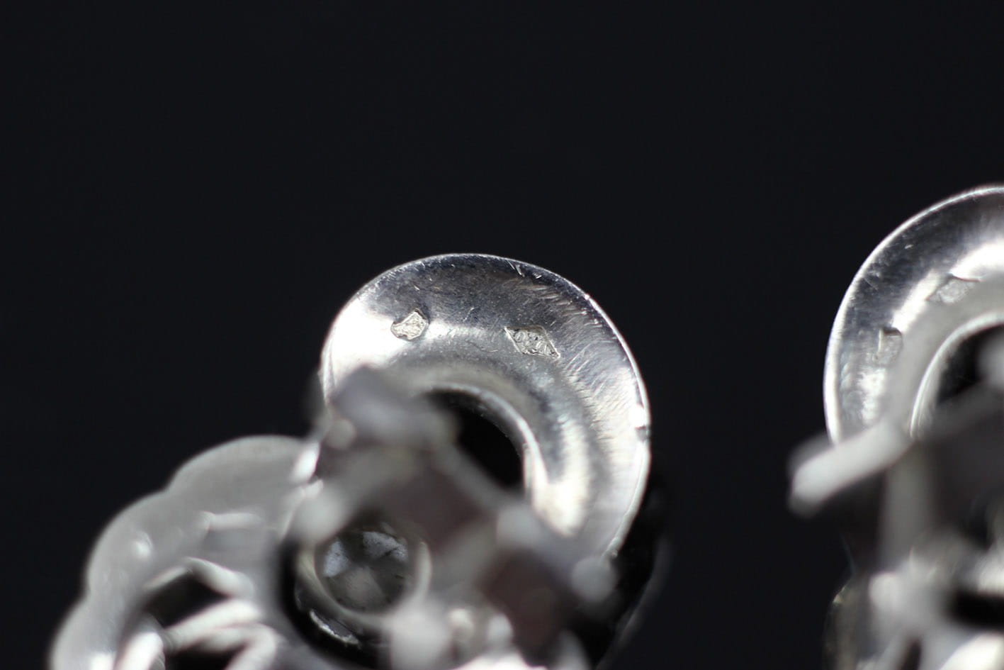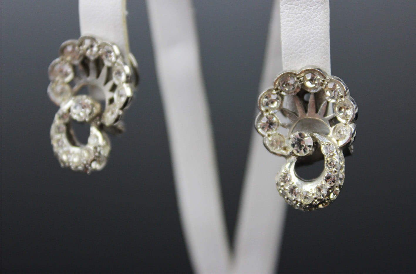 Klipsy z okresu Art Deco, epoki która zachwycała nowoczesnym podejściem do formy, elegancją i geometrycznymi liniami. Wykonane z chromowanego srebra, sygnowane na rewersie francuskimi puncami probierczymi dla srebra próby 800. Te klipsy wyróżniają się subtelnym, ale efektownym designem. Zdobione fasetowanym strasem, który wspaniale odbija światło, doskonale imituje brylanty. Ażurowy wzór nadaje im lekkości i wyrafinowanego charakteru, będącego cechą rozpoznawczą stylu Art Deco. Wymiary:
