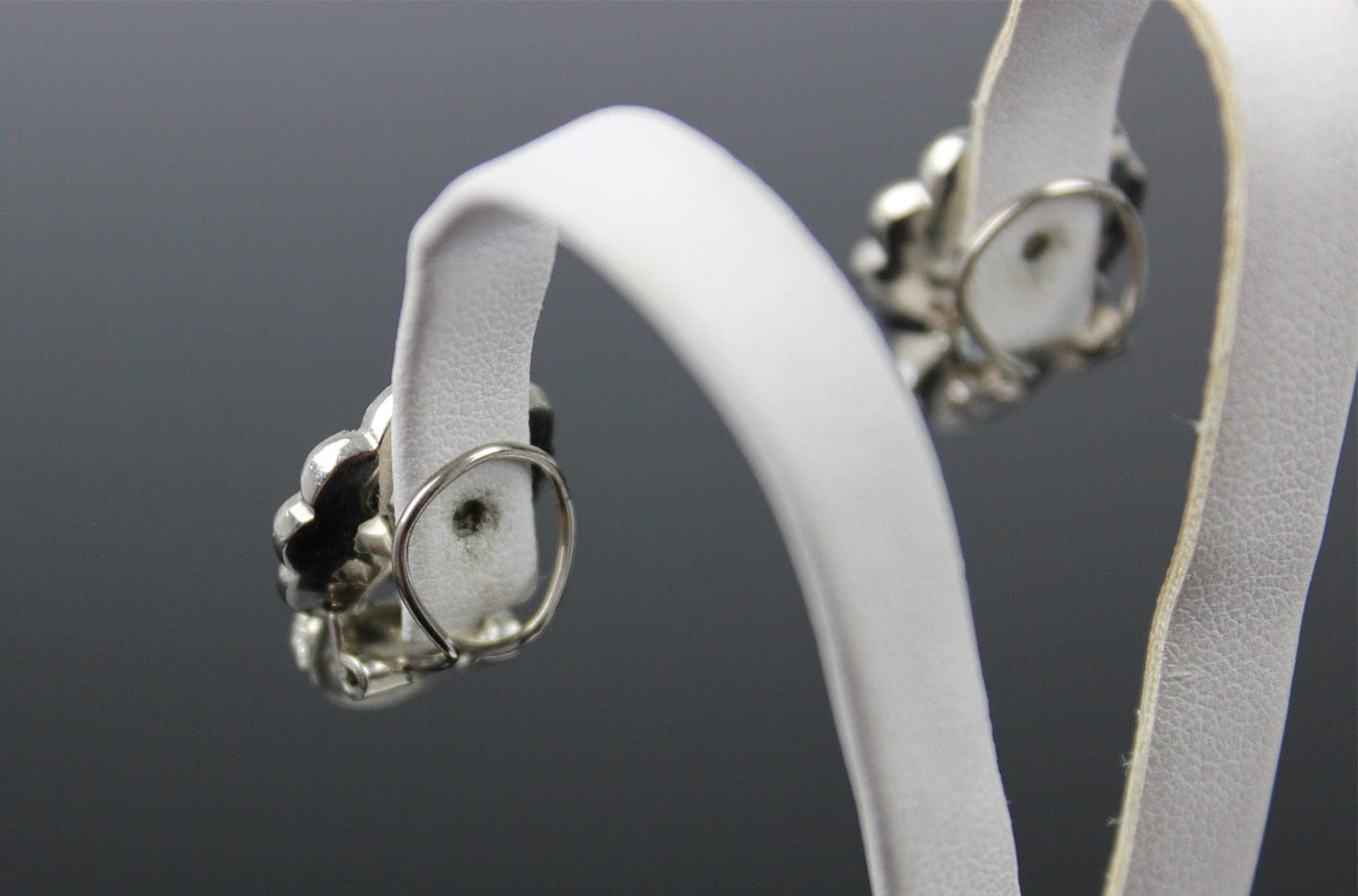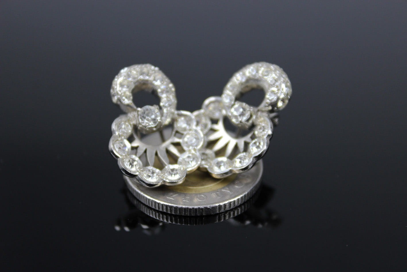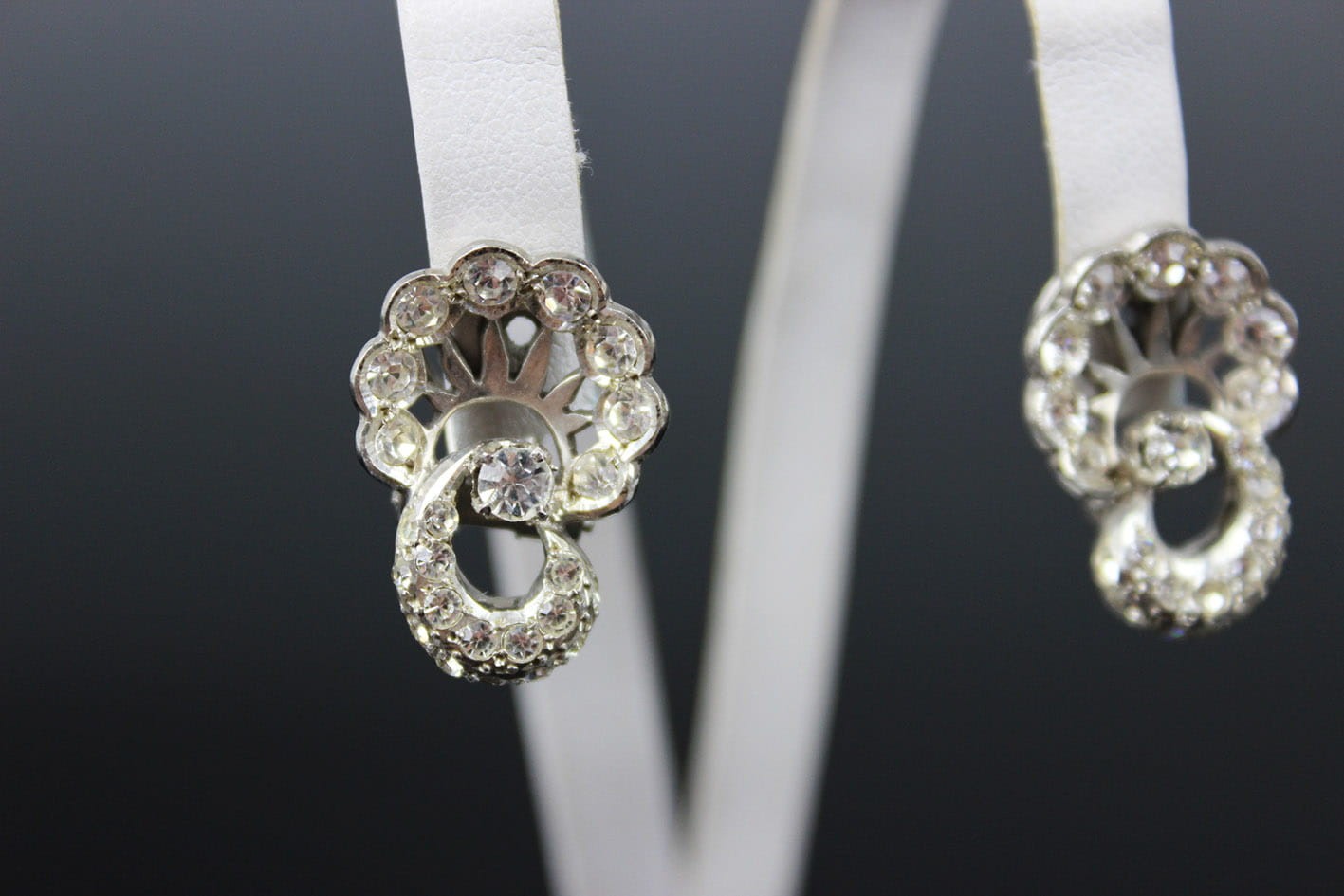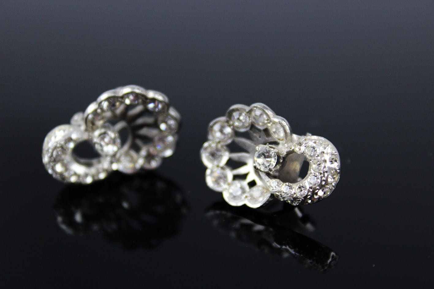 Klipsy z okresu Art Deco, epoki która zachwycała nowoczesnym podejściem do formy, elegancją i geometrycznymi liniami. Wykonane z chromowanego srebra, sygnowane na rewersie francuskimi puncami probierczymi dla srebra próby 800. Te klipsy wyróżniają się subtelnym, ale efektownym designem. Zdobione fasetowanym strasem, który wspaniale odbija światło, doskonale imituje brylanty. Ażurowy wzór nadaje im lekkości i wyrafinowanego charakteru, będącego cechą rozpoznawczą stylu Art Deco. Wymiary: