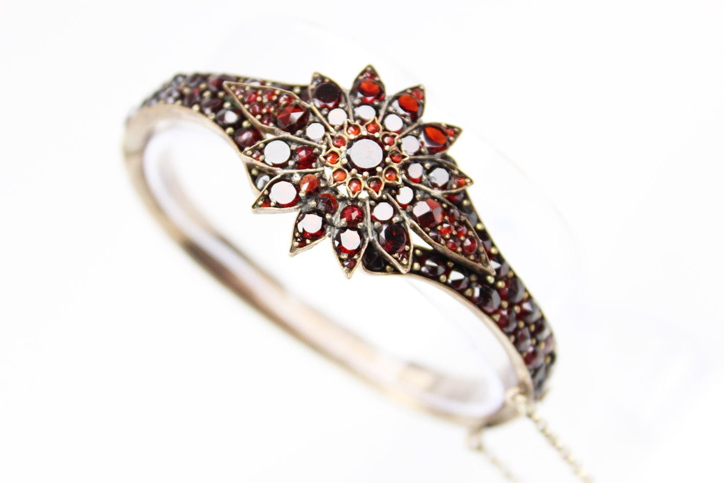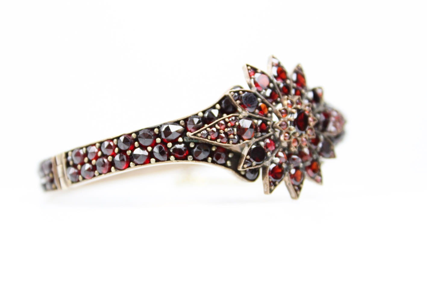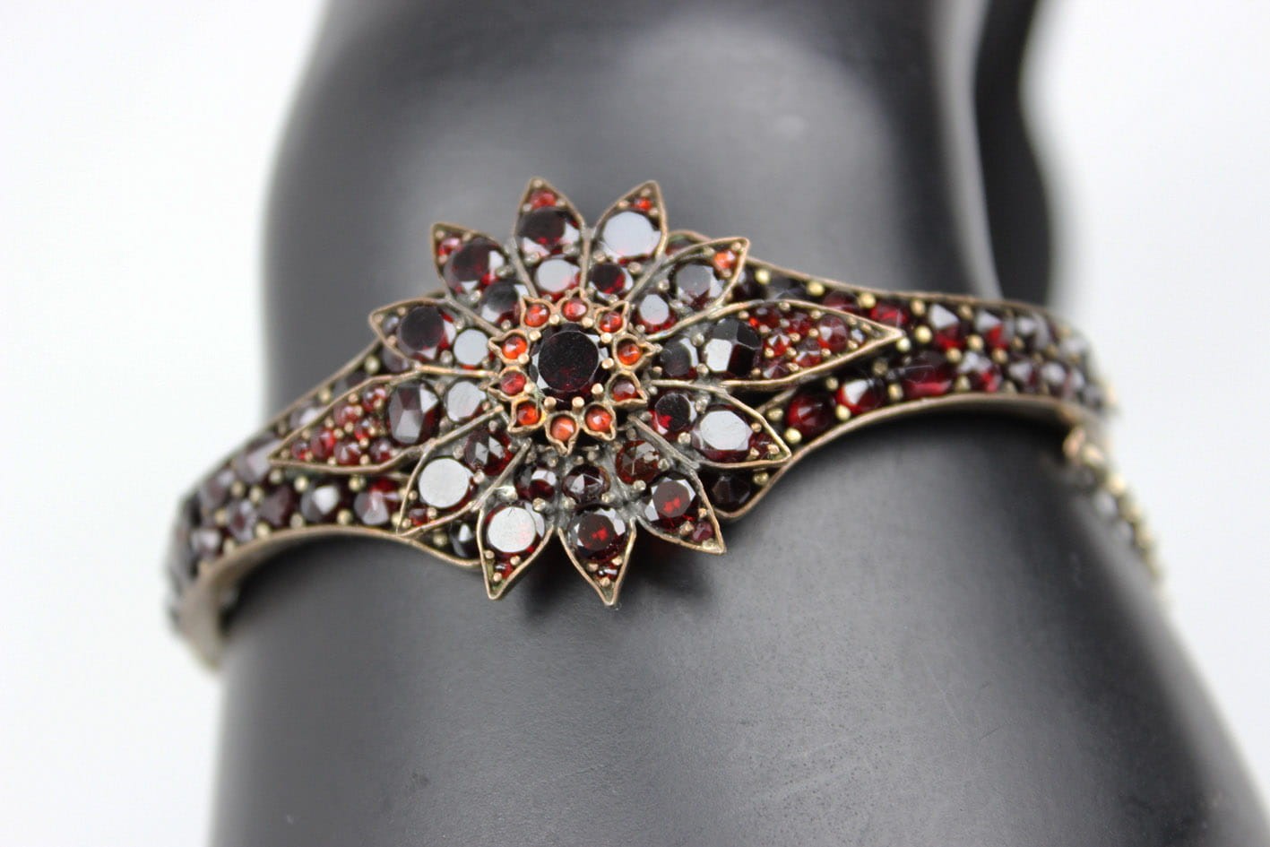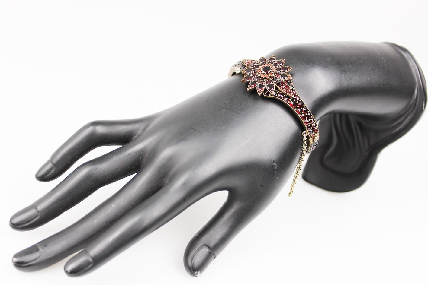 Wiktoriańska bransoletka pochodząca z przełomu XIX i XX wieku. Dwudzielna obręcz łączona zawiasem i zapinana na zamek szufladkowy z łańcuszkiem zabezpieczającym. Górna półobręcz rozdziela się przytrzymując dwupoziomową szeroką rozetę. Podstawa w złoconym mosiądzu wykonana techniką złocenia double. Całość kameryzowana różniej wielkości naturalnymi granatami w szlifie rozetowym oraz szlifie płaskim. Bransoletka w bardzo dobrym stanie zachowania, jedynie delikatne wgniecenie na wewnętrznej części dolnej połówki oraz delikatne przetarcia złocenia na krawędzi. Wymiary: