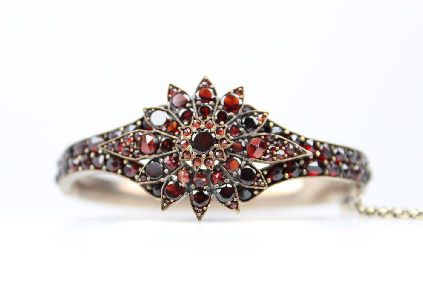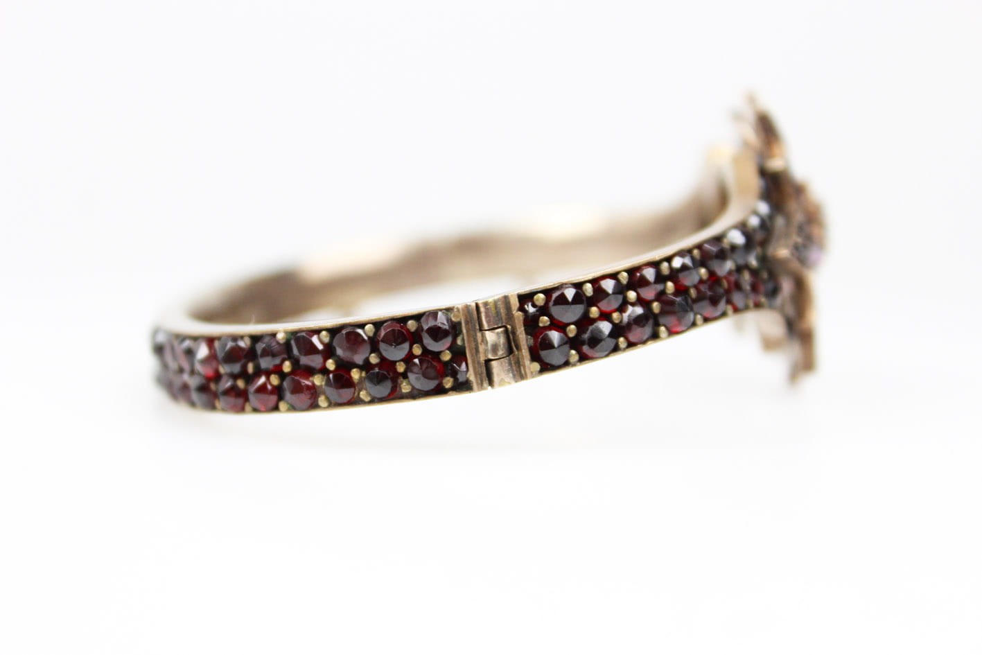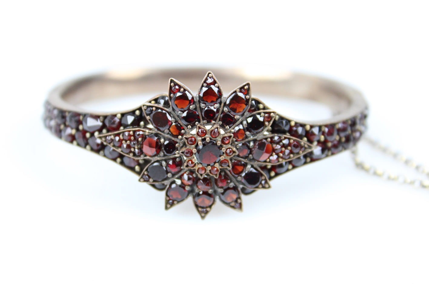 Wiktoriańska bransoletka pochodząca z przełomu XIX i XX wieku. Dwudzielna obręcz łączona zawiasem i zapinana na zamek szufladkowy z łańcuszkiem zabezpieczającym. Górna półobręcz rozdziela się przytrzymując dwupoziomową szeroką rozetę. Podstawa w złoconym mosiądzu wykonana techniką złocenia double. Całość kameryzowana różniej wielkości naturalnymi granatami w szlifie rozetowym oraz szlifie płaskim. Bransoletka w bardzo dobrym stanie zachowania, jedynie delikatne wgniecenie na wewnętrznej części dolnej połówki oraz delikatne przetarcia złocenia na krawędzi. Wymiary: