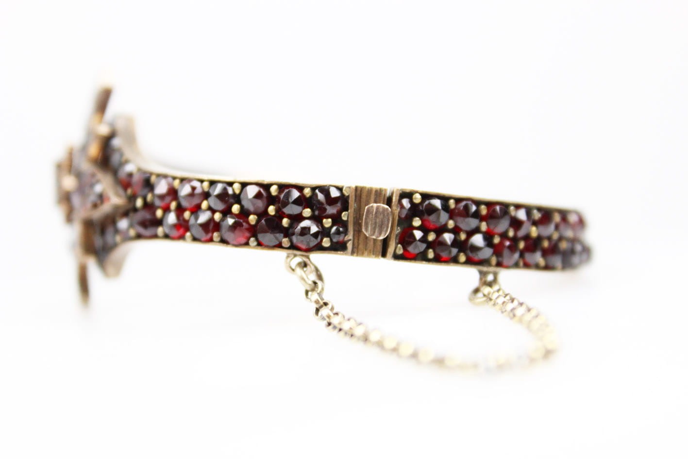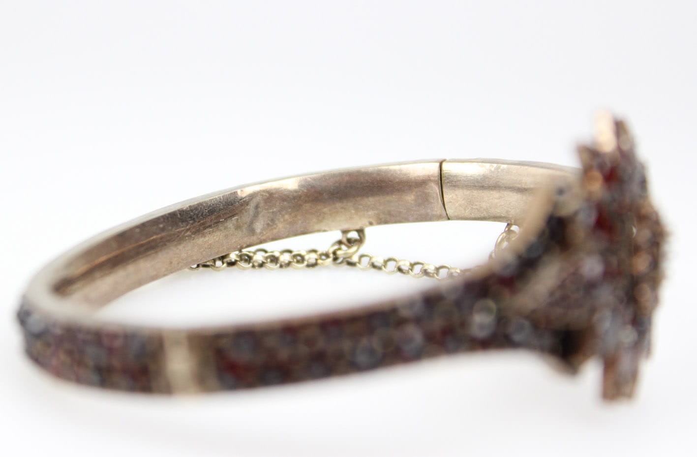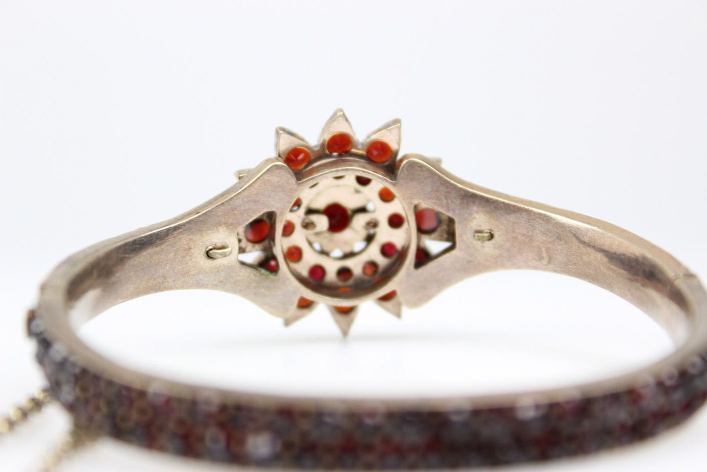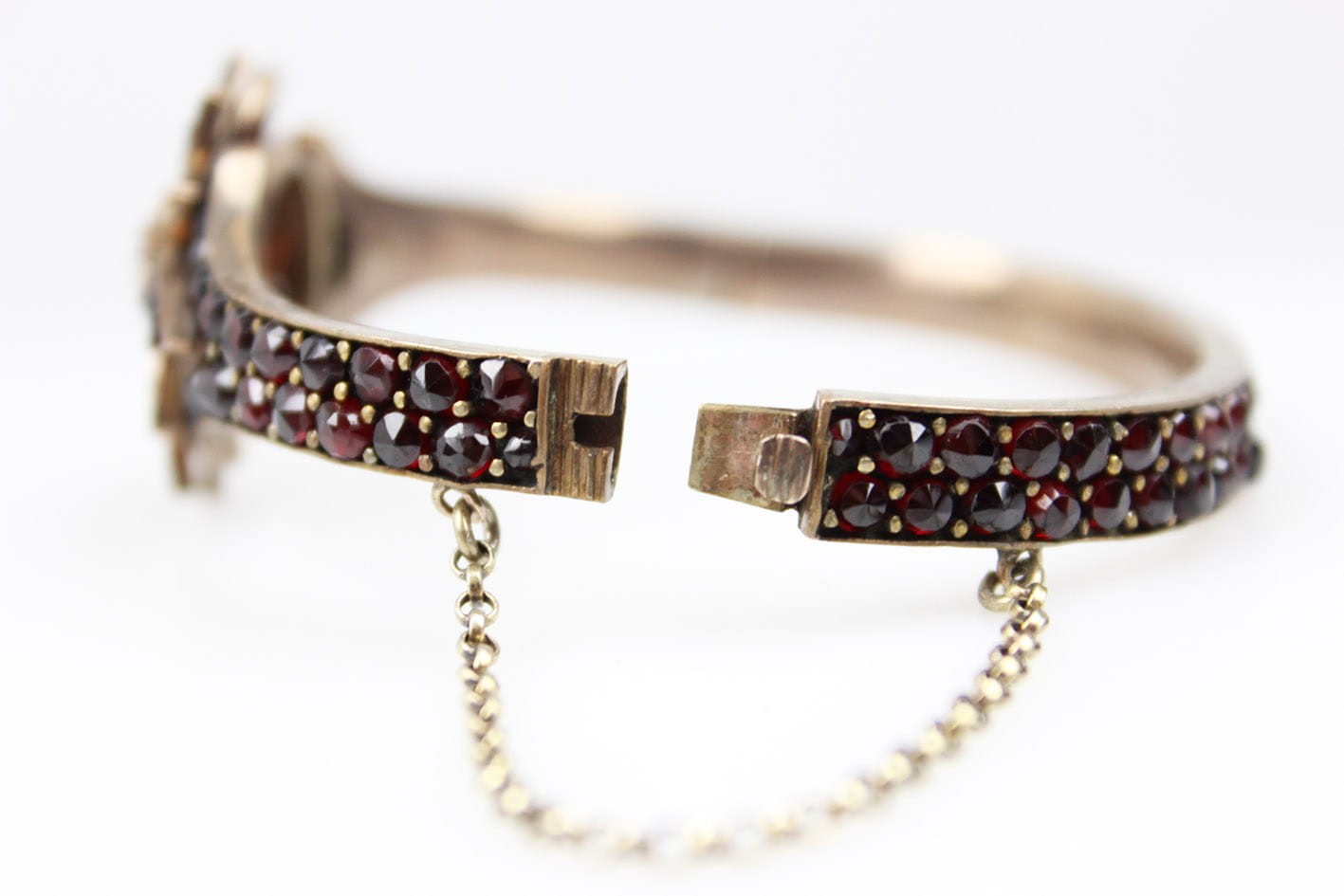 Wiktoriańska bransoletka pochodząca z przełomu XIX i XX wieku. Dwudzielna obręcz łączona zawiasem i zapinana na zamek szufladkowy z łańcuszkiem zabezpieczającym. Górna półobręcz rozdziela się przytrzymując dwupoziomową szeroką rozetę. Podstawa w złoconym mosiądzu wykonana techniką złocenia double. Całość kameryzowana różniej wielkości naturalnymi granatami w szlifie rozetowym oraz szlifie płaskim. Bransoletka w bardzo dobrym stanie zachowania, jedynie delikatne wgniecenie na wewnętrznej części dolnej połówki oraz delikatne przetarcia złocenia na krawędzi. Wymiary: