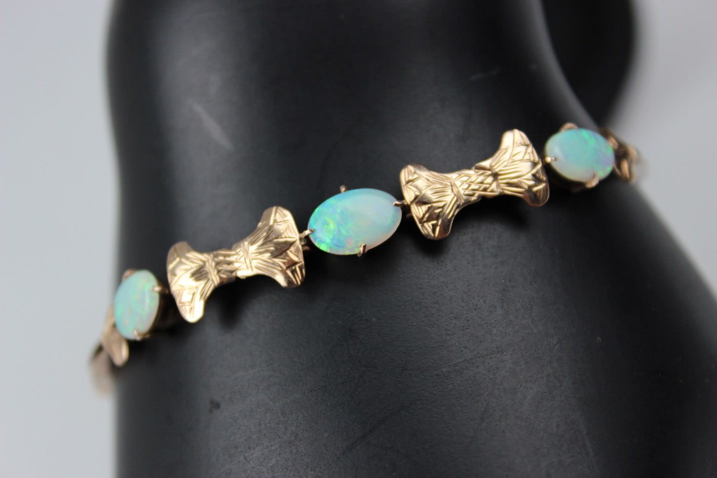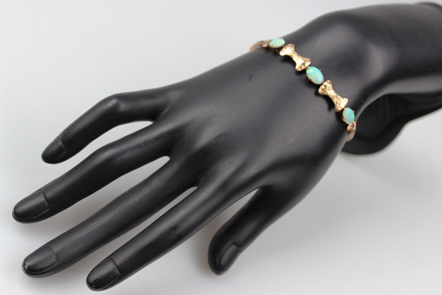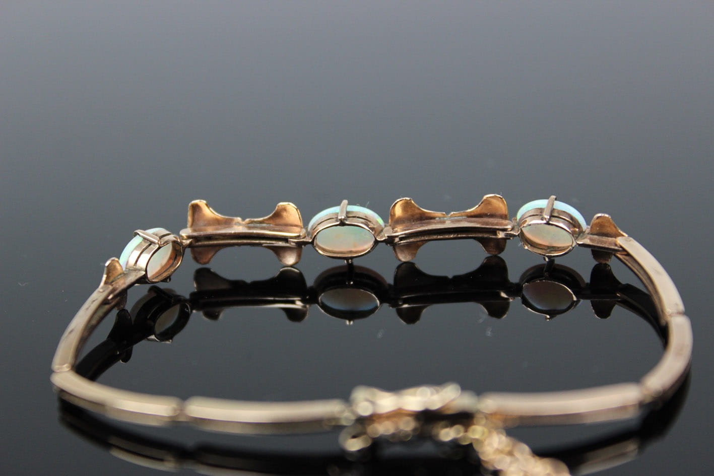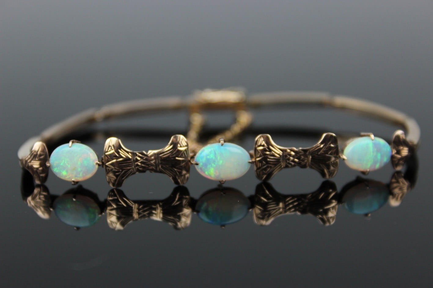 Delikatna bransoletka segmentowa pochodząca z początków XX wieku. Wyrób wykonany w złocie 9 karatowym zdobiony trzema owalnymi opalami o przepięknej barwie. Zapięcie szufladkowe z dodatkowym zabezpieczeniem w postaci łańcuszka. Całość w bardzo dobrym stanie zachowania. Wymiary: