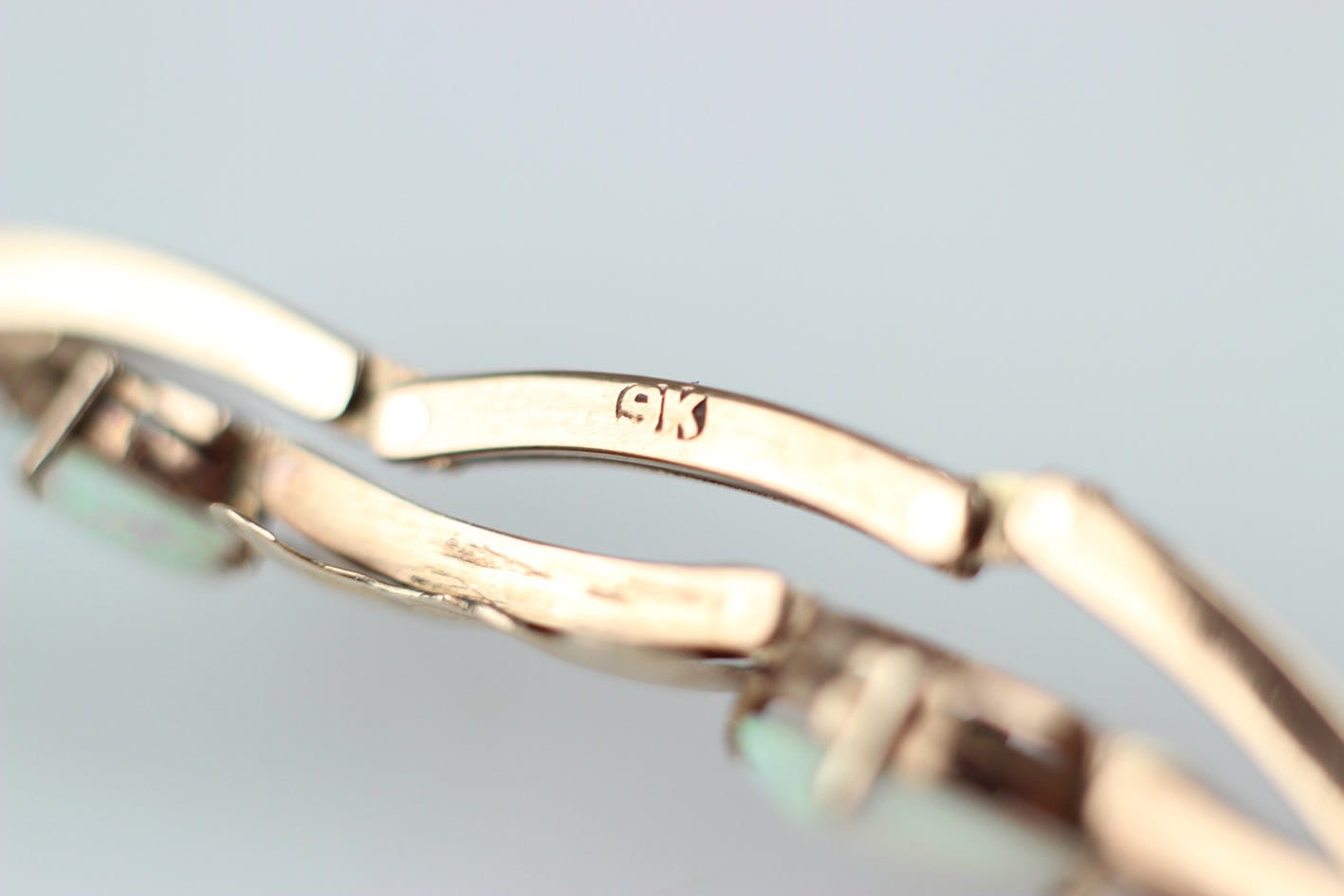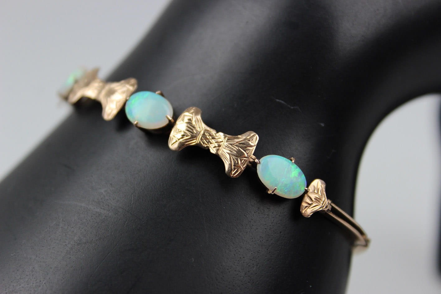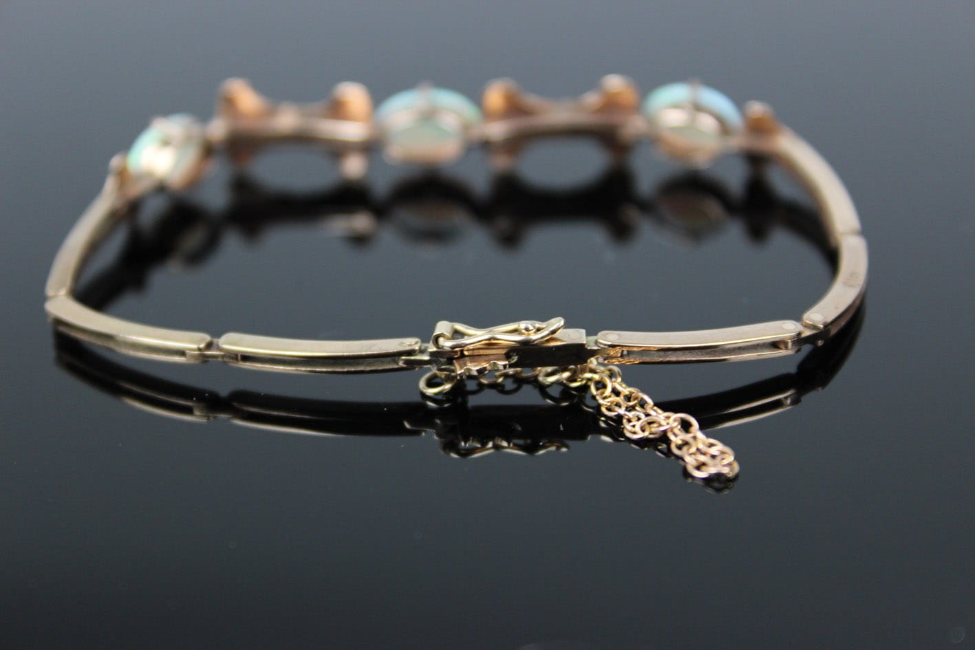 Delikatna bransoletka segmentowa pochodząca z początków XX wieku. Wyrób wykonany w złocie 9 karatowym zdobiony trzema owalnymi opalami o przepięknej barwie. Zapięcie szufladkowe z dodatkowym zabezpieczeniem w postaci łańcuszka. Całość w bardzo dobrym stanie zachowania. Wymiary: