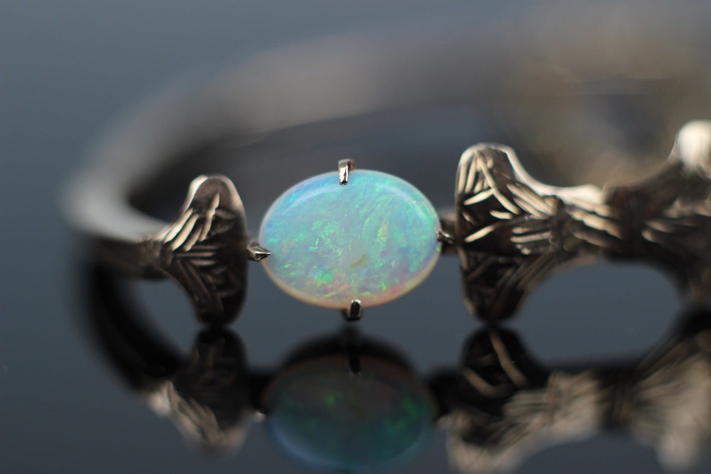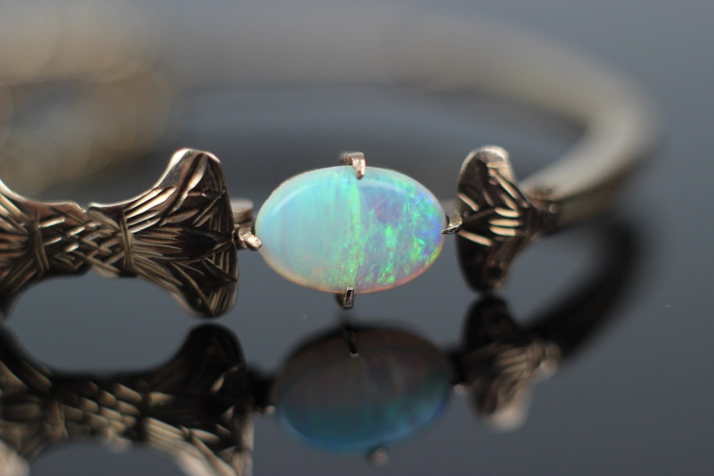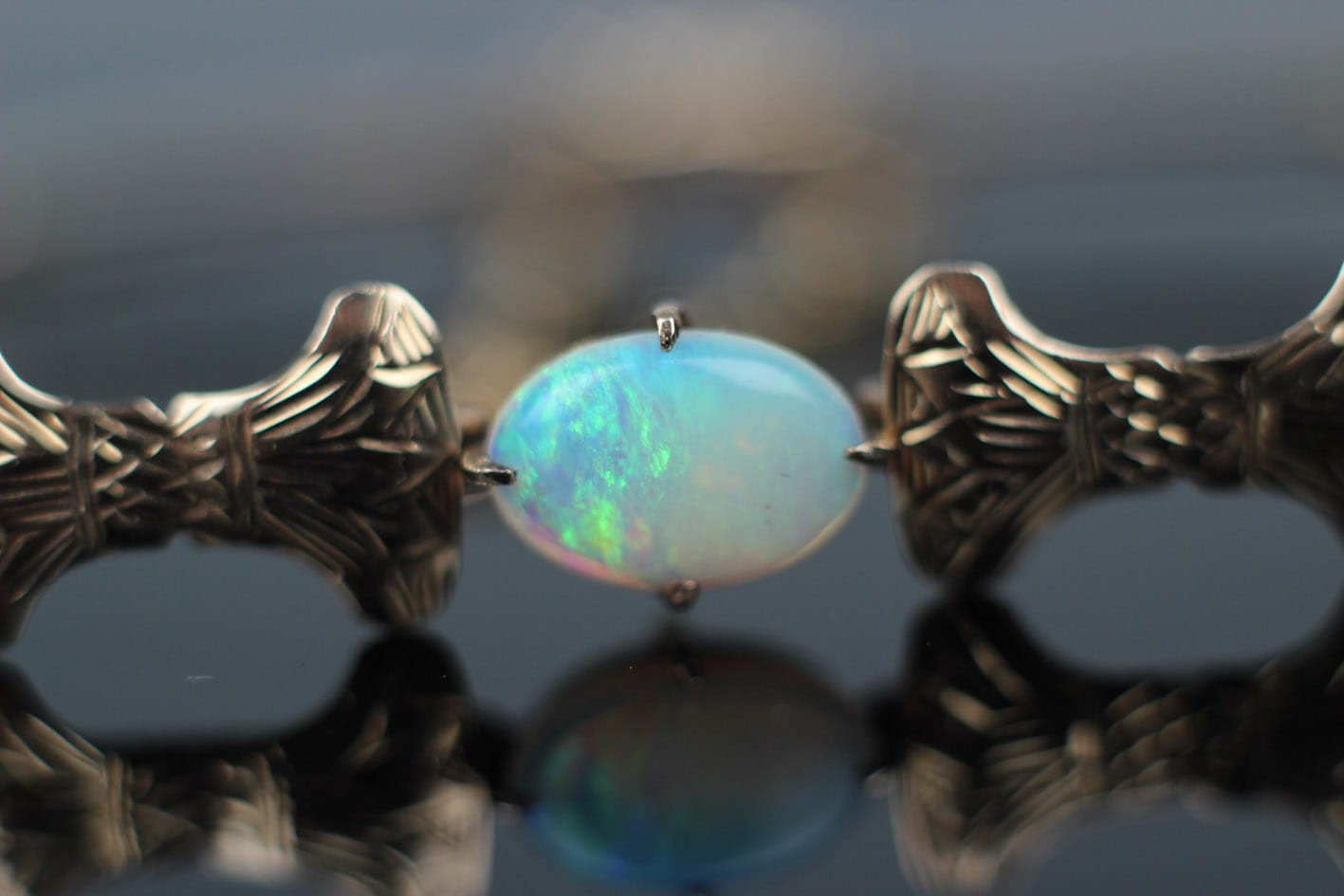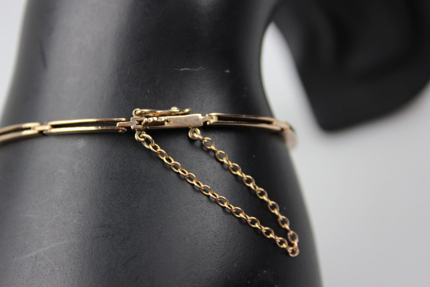Delikatna bransoletka segmentowa pochodząca z początków XX wieku. Wyrób wykonany w złocie 9 karatowym zdobiony trzema owalnymi opalami o przepięknej barwie. Zapięcie szufladkowe z dodatkowym zabezpieczeniem w postaci łańcuszka. Całość w bardzo dobrym stanie zachowania. Wymiary: