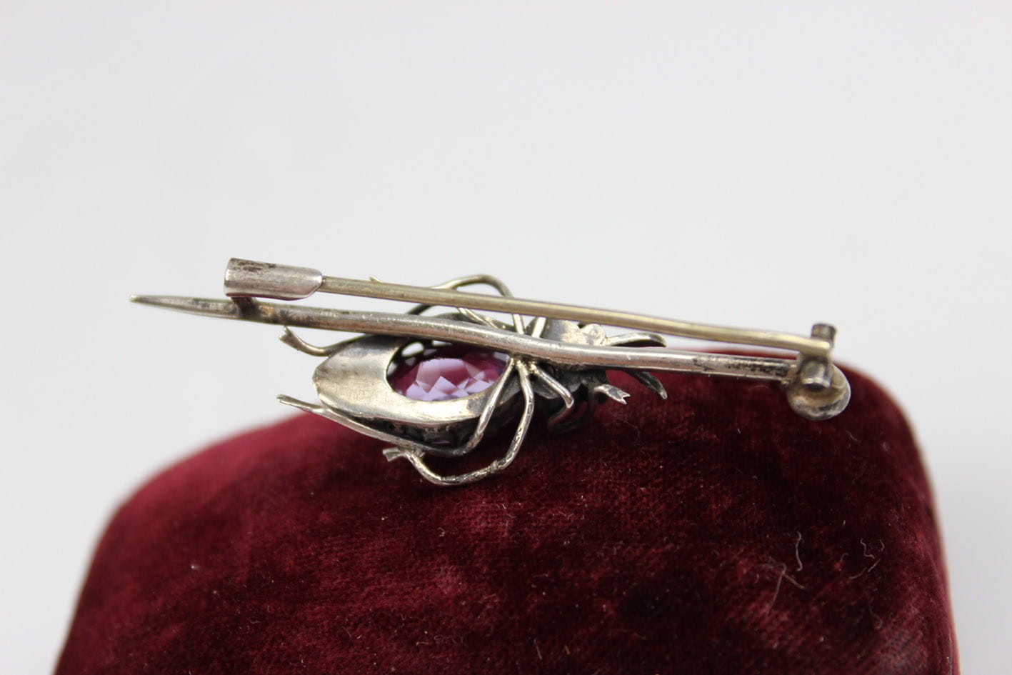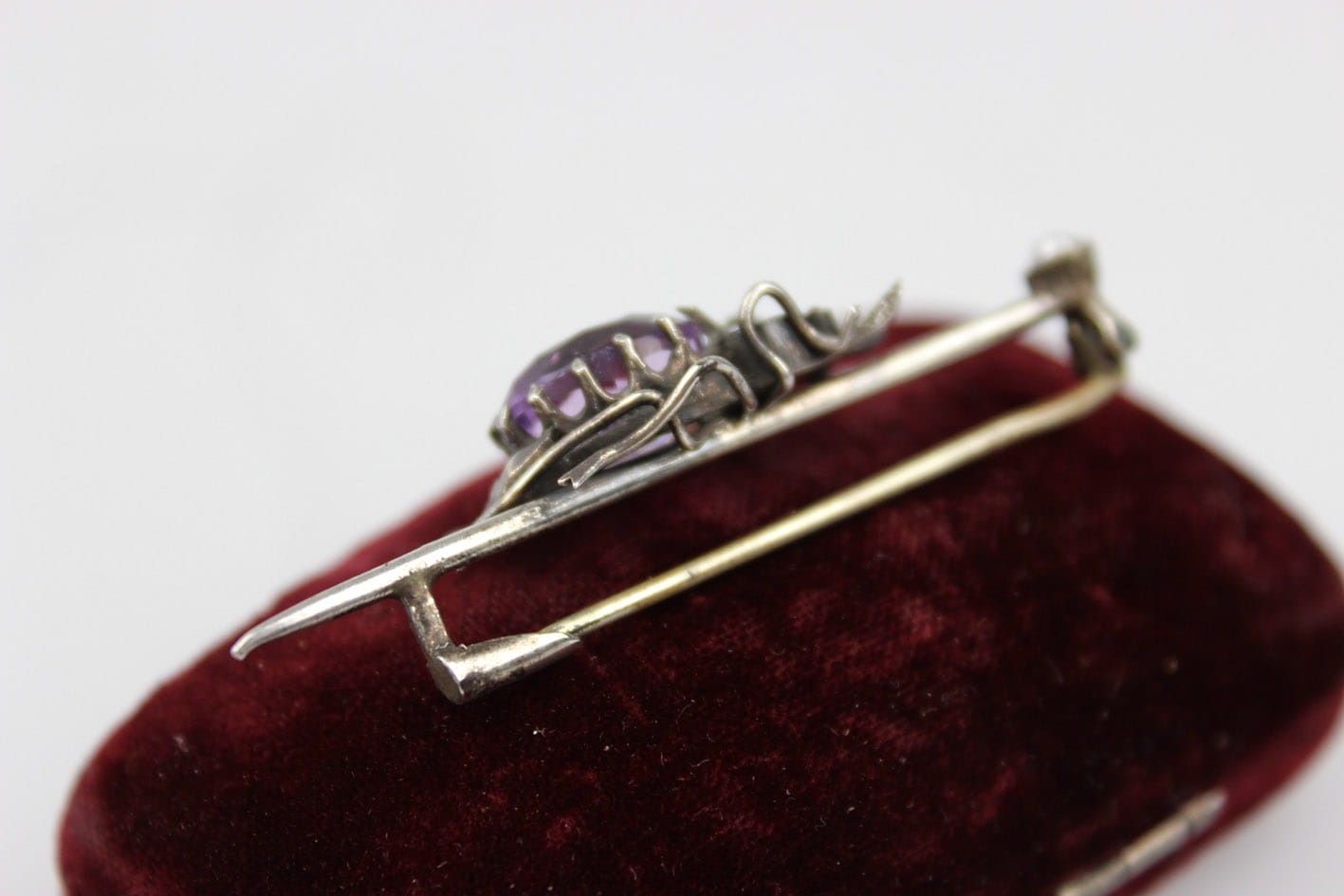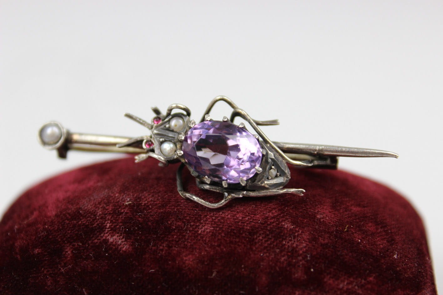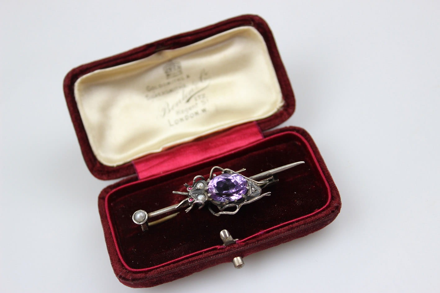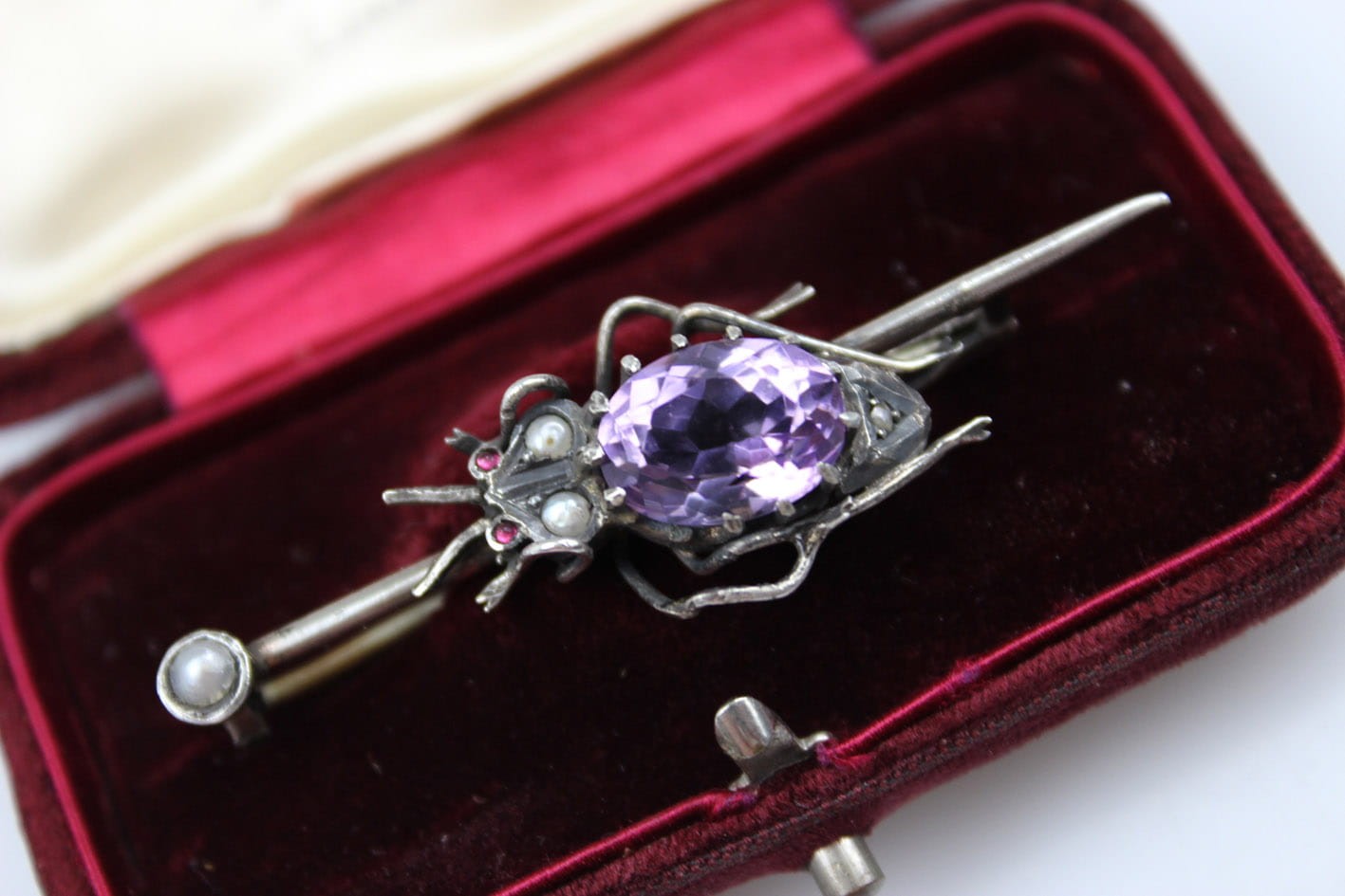 Przepiękna broszka z II połowy XIX wieku w formie owada. Broszka wykonana w srebrze próby ok. 800( brak punc badanie kwasowe), kameryzowana naturalnym ametystem, półperłami oraz granatami. Szpila alpakowa. W komplecie oryginalne opakowanie z epoki. Broszka w dobrym stanie zachowania, jedynym mankamentem jest brak jednej łapki trzymającej ametyst. Jest to jednak defekt, który nie rzuca się w oczy ani też nie ma wpływu na umocowanie kamienia. Całość w oryginalnej wiekowej patynce. Wymiary: