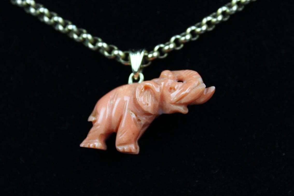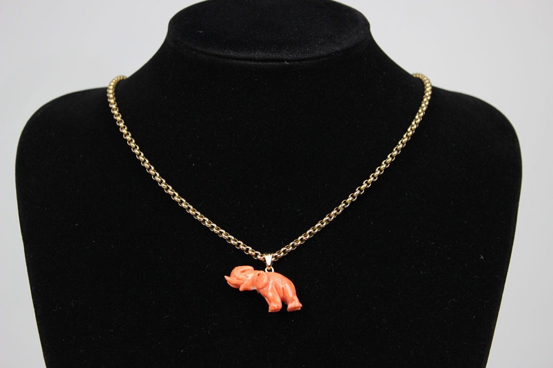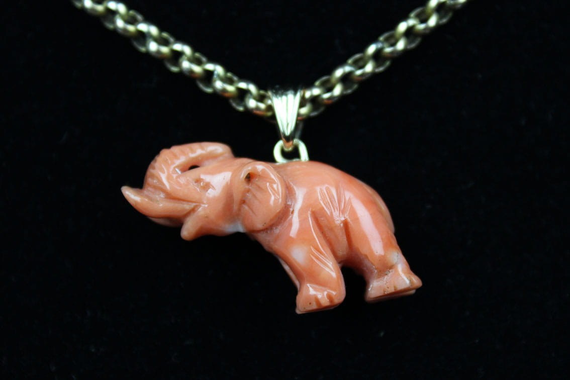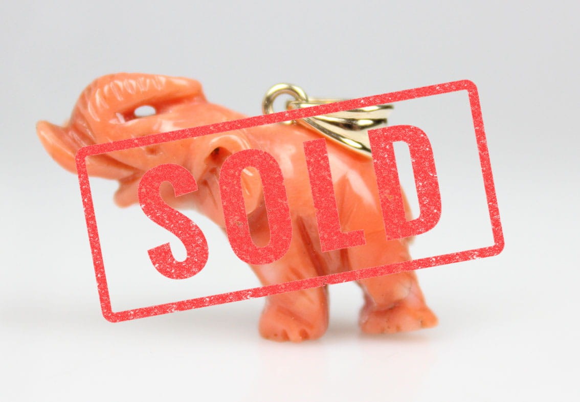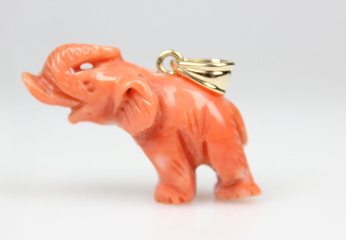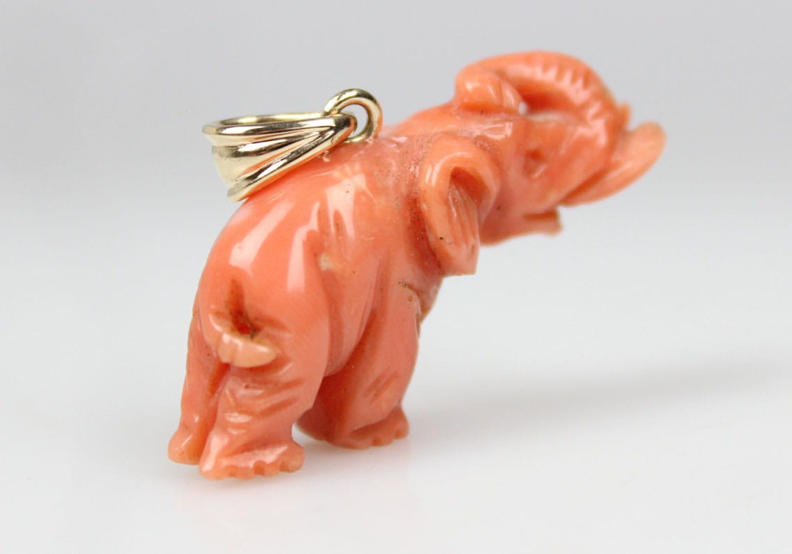 Wiktoriańska zawieszka z przełomu XIX i XX wieku w kształcie słonia z podniesioną trąbą. Rzeźbiona w naturalnym koralu figurka była amuletem chroniącym od złych mocy i przynoszącym szczęście. Figurka wyrzeźbiona została z troską o szczegóły z zachowaniem proporcji zwierzęcia. Elementy zaczepu jak i krawatki wykonane zostały w złocie 14 karatowym. Sygnatura 585. Stan zachowania bardzo dobry. Wymiary: