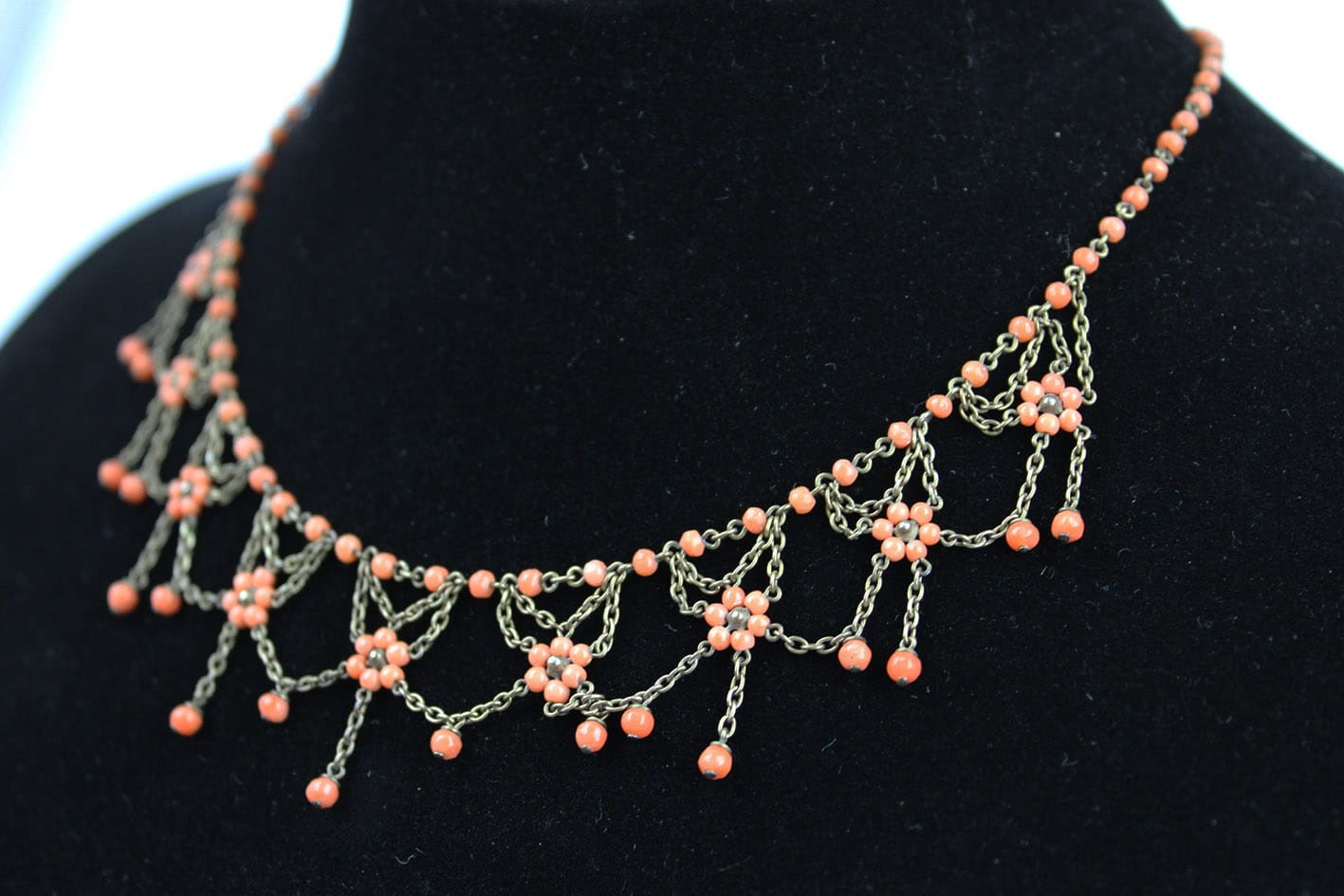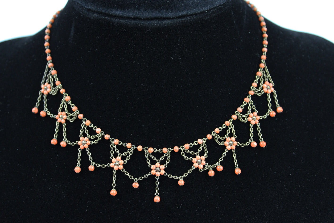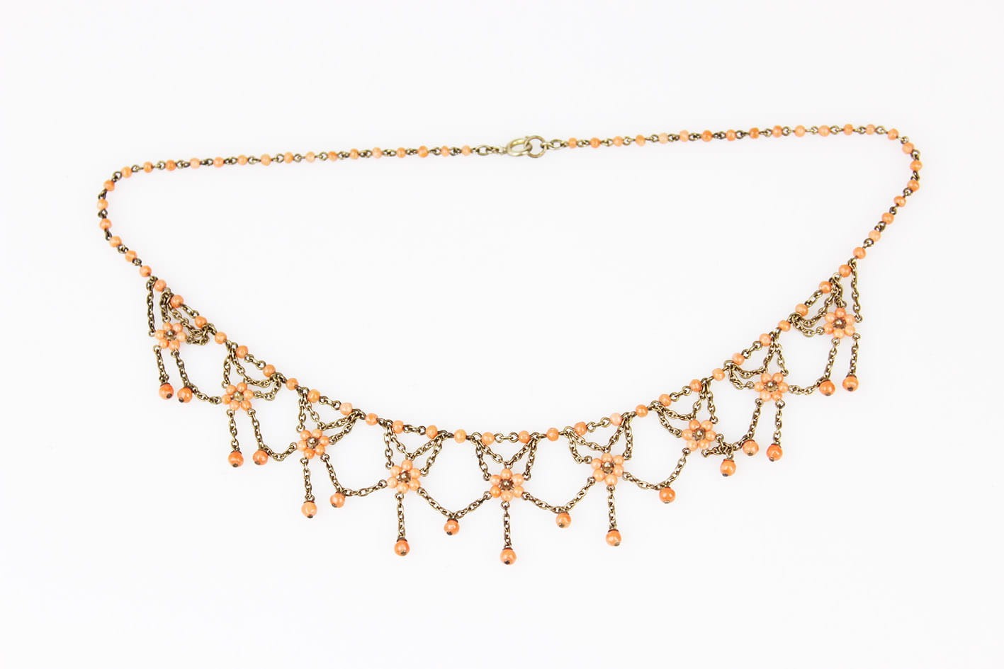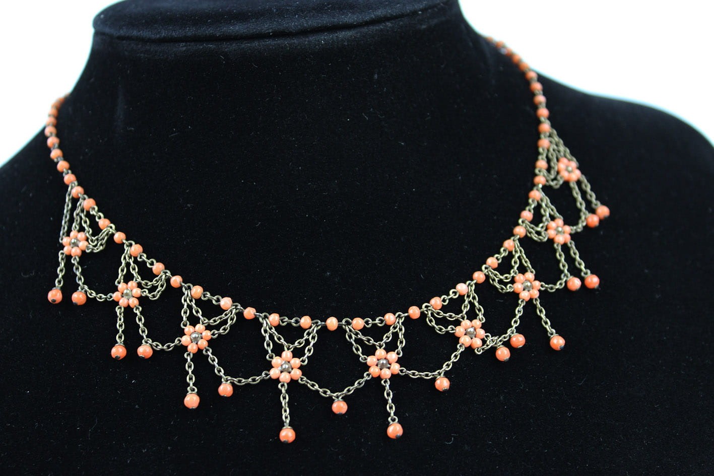Zachwycający naszyjnik z epoki wiktoriańskiej, wykonany ze złoconego srebra, ozdobiony drobnymi kuleczkami z naturalnego koralu szlachetnego. Delikatna kompozycja w formie kwiatowych motywów i ażurowych zawieszek tworzy elegancki, romantyczny charakter charakterystyczny dla biżuterii końca XIX wieku. Misternie splecione łańcuszki i staranne wykonanie świadczą o wysokiej jakości rzemiosła jubilerskiego z tamtego okresu. Całość w delikatnej wiekowej patynce. Wymiary: