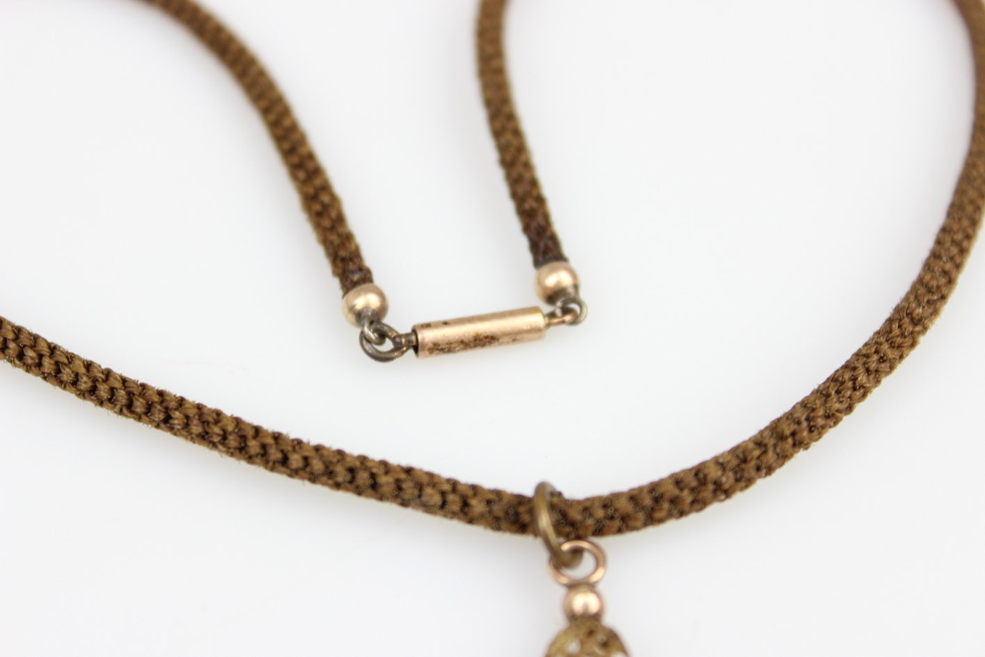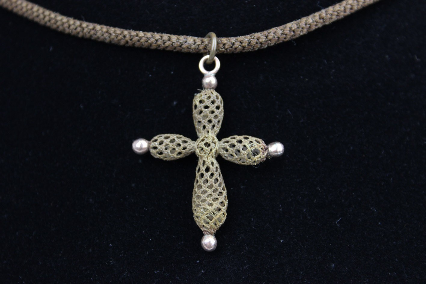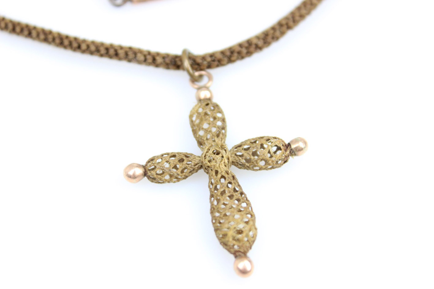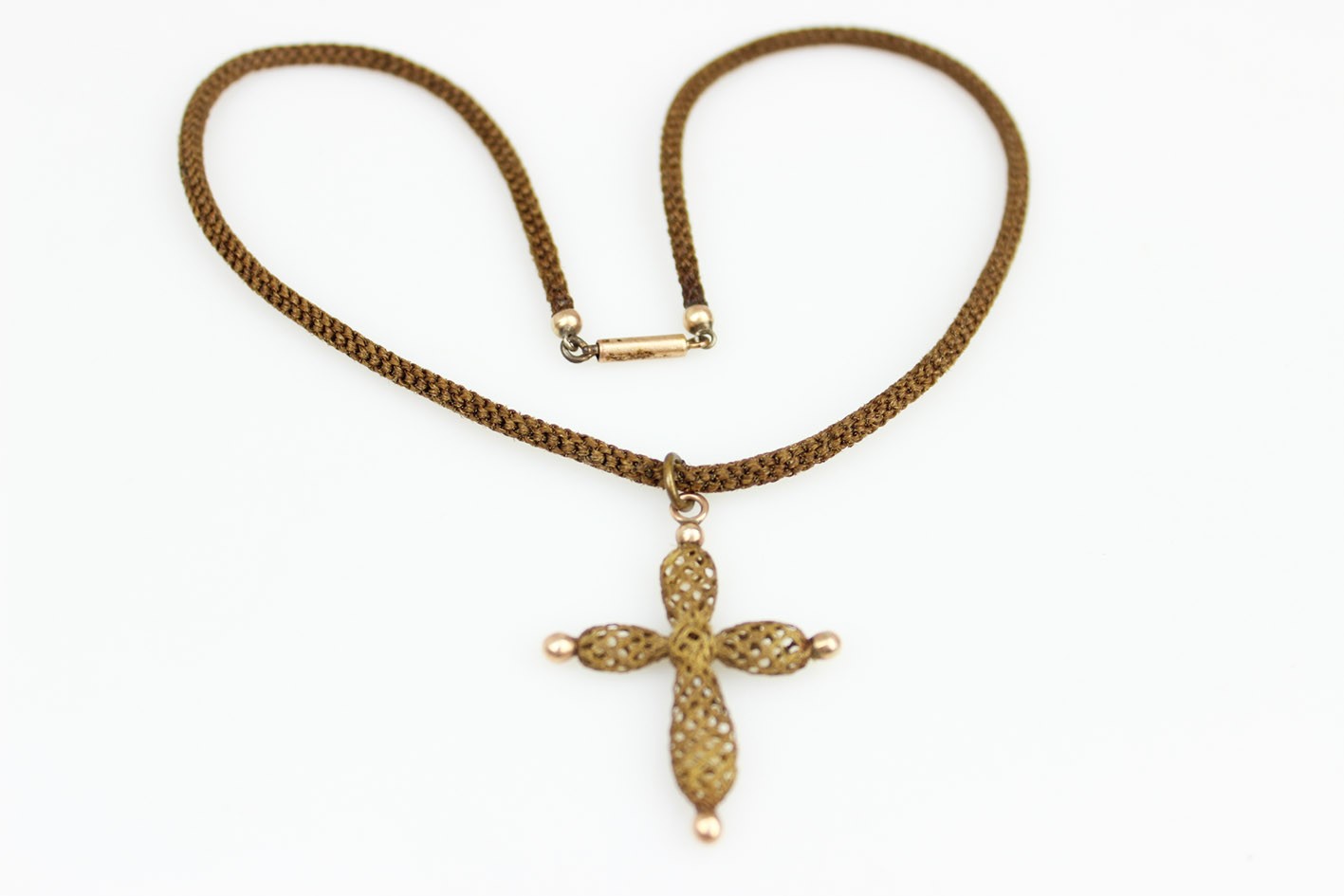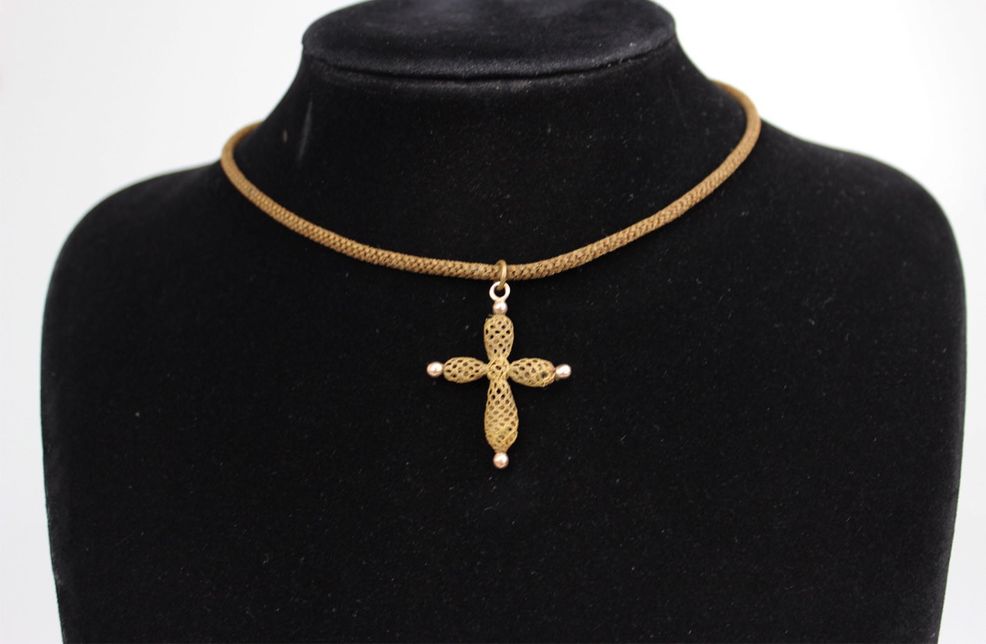 Wiktoriański krzyż z włosia wraz z łańcuszkiem – biżuteria sentymentalna z II połowy XIX w. Krzyżyk o miękkiej, wrzecionowatej linii ramion, splecionych ażurowo w technice hair-work – klasyczny motyw sentymentalnej biżuterii epoki Wiktorii. Zarówno zawieszka jak i sznur-naszyjnik wykonane są z misternie plecionego włosia końskiego. Końcówki ramion akcentują kulki metalowe, a zawieszkę i zapięcie uzupełniają elementy z mosiądzu złoconego w technice double. Sznur zamykany zapięciem szufladkowym (również mosiądz złocony double), wygodnym i pewnym w użytkowaniu. Stan zachowania bardzo dobry: sploty sprężyste, bez przerwań; lokalnie drobne, naturalne zmechacenia włosia przy jednym zakończeniu. Wymiary: