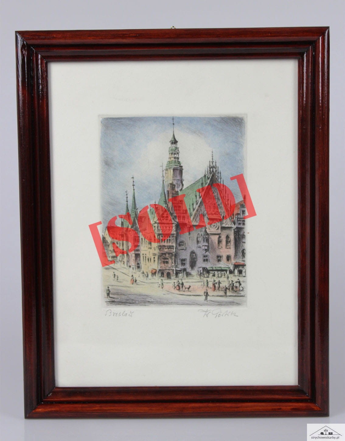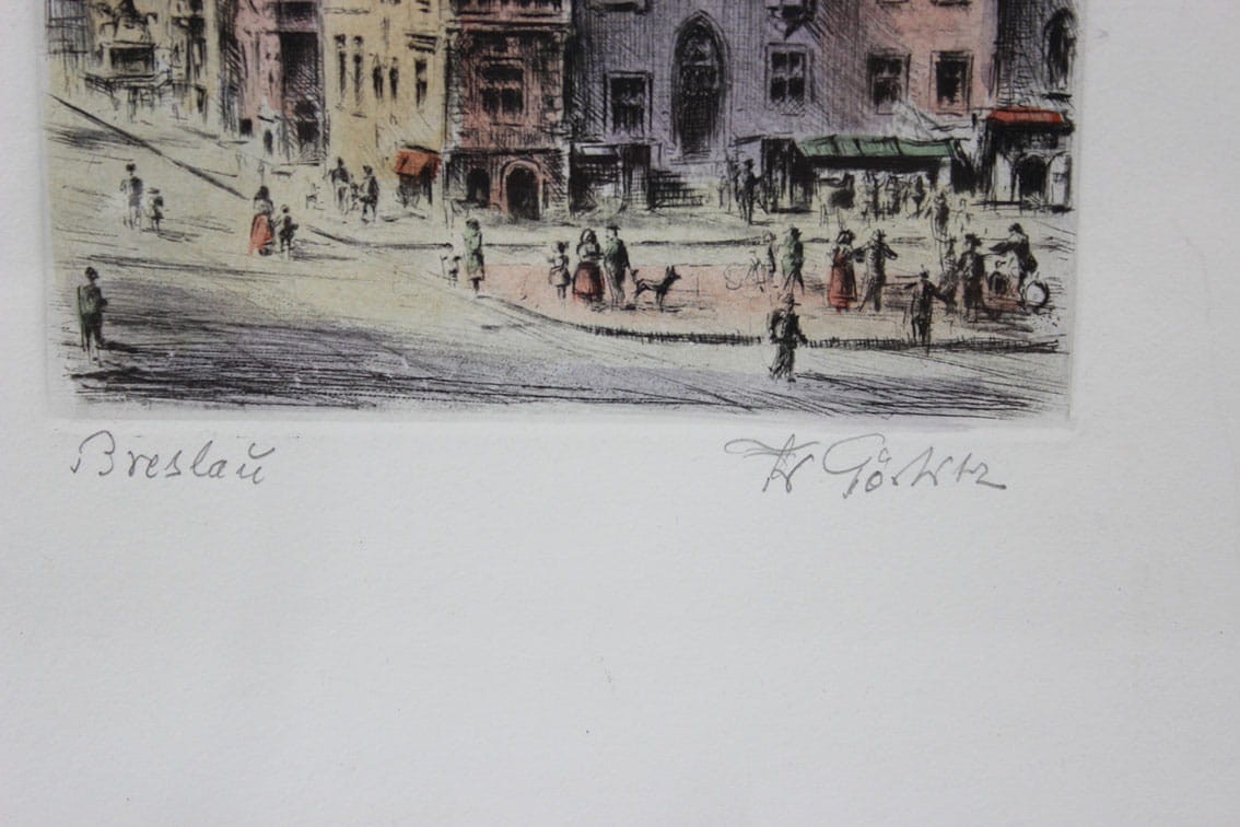 Podkolorowana, przedwojenna akwaforta niemieckiego artysty Friedricha Görlitz ( 1896-1980) przedstawiająca ratusz we Wrocławiu. Sygnowana odręcznie przez artystę Fr.Görlitz. Całość za szkłem w drewnianej ramie. Wymiary: