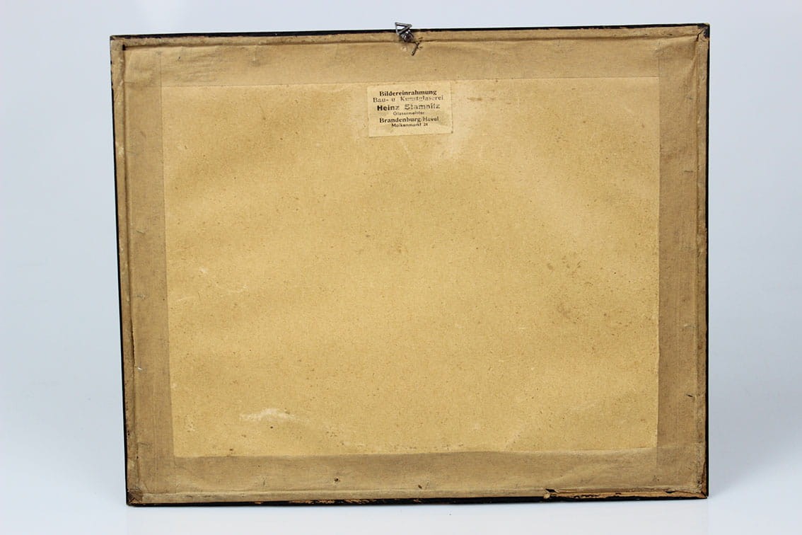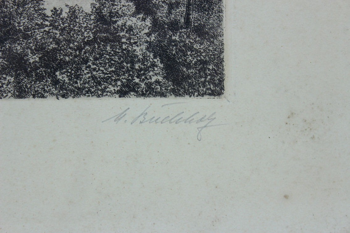 Przedwojenna akwaforta z widokiem Wzgórza Liebicha (obecnie Wzgórze Partyzantów) sygn. ołówkiem na dole z prawej strony .: M Bucklech. Całość za szkłem w drewnianej ramie. Wymiary: