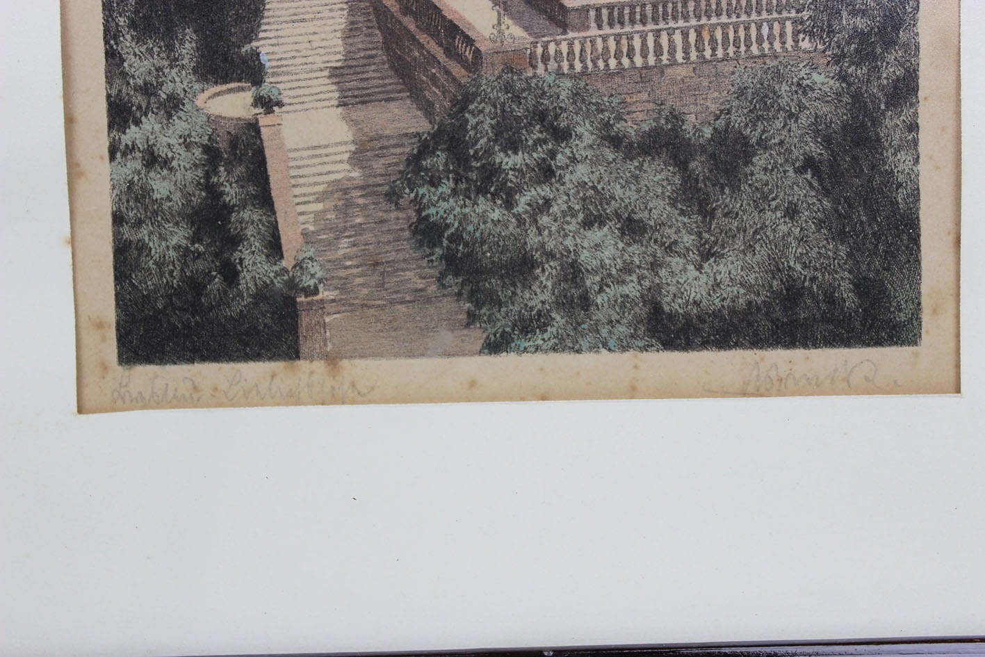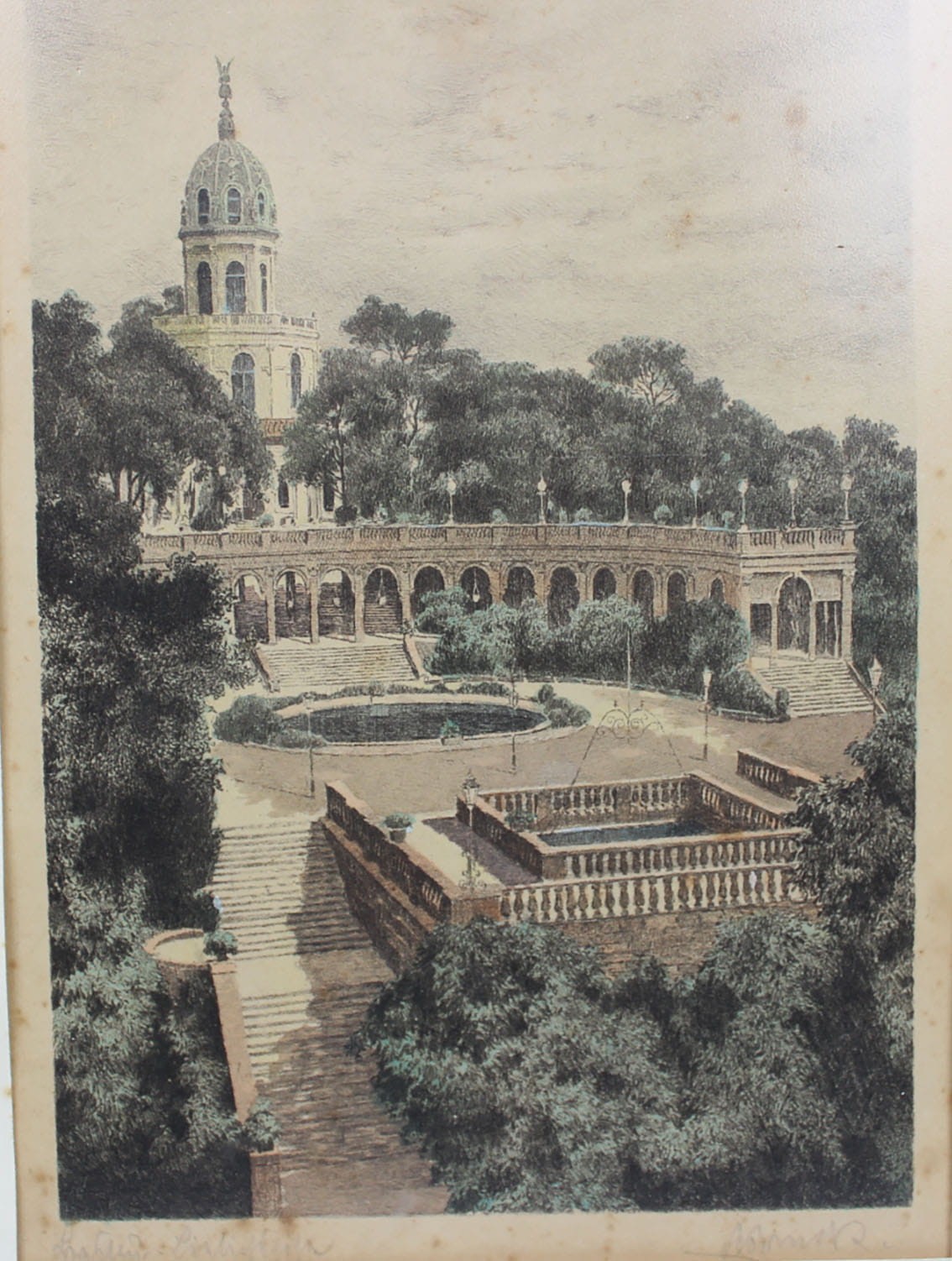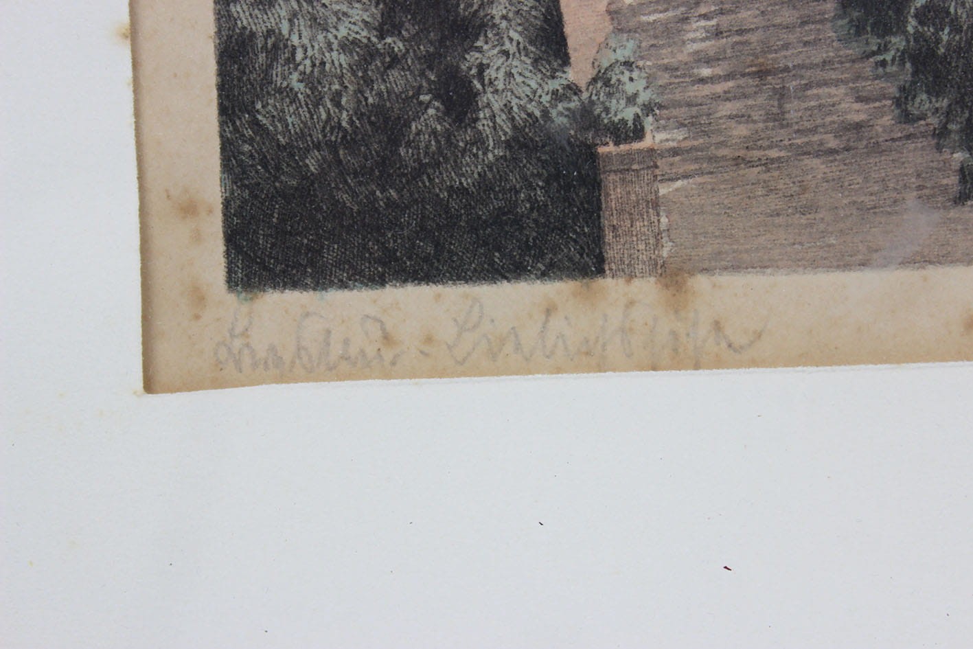Przedwojenna podkolorowywana akwaforta z widokiem Wzgórza Liebicha (obecnie Wzgórze Partyzantów) sygn. ołówkiem na dole z prawej strony. Całość za szkłem antyrefleksyjnym w drewnianej ramie. Wymiary: