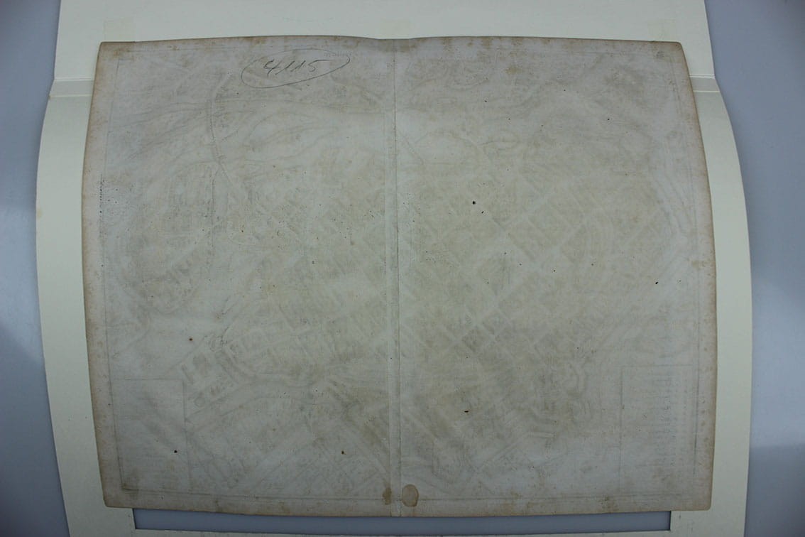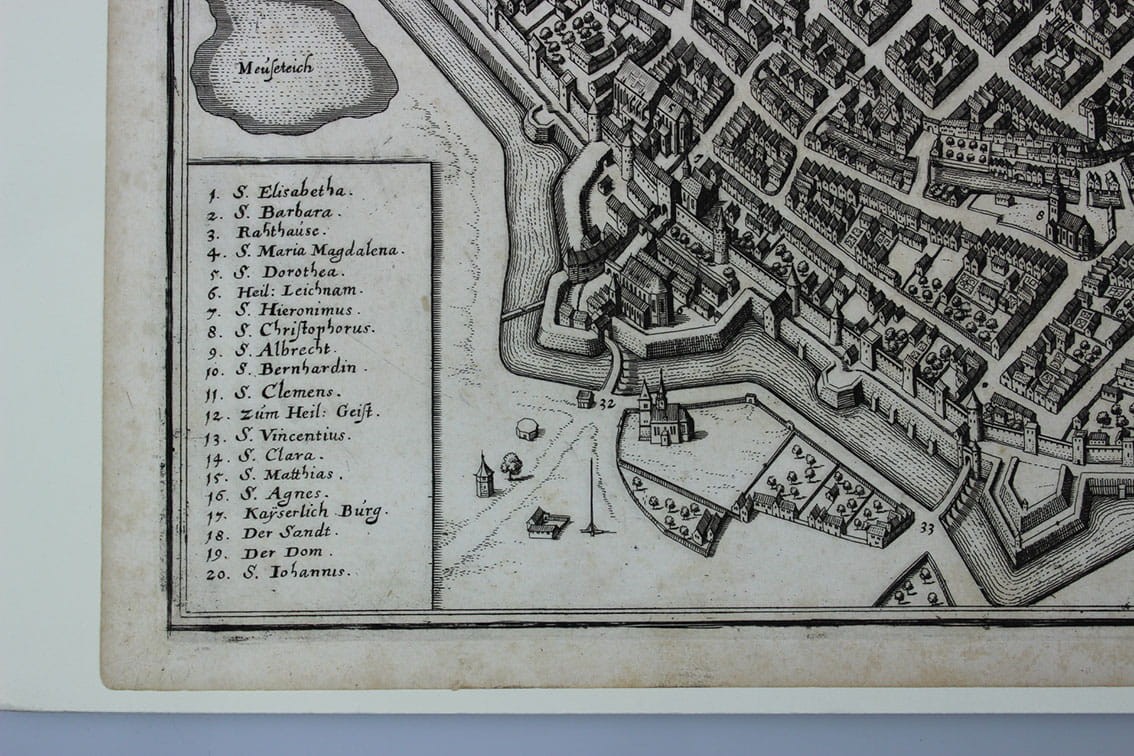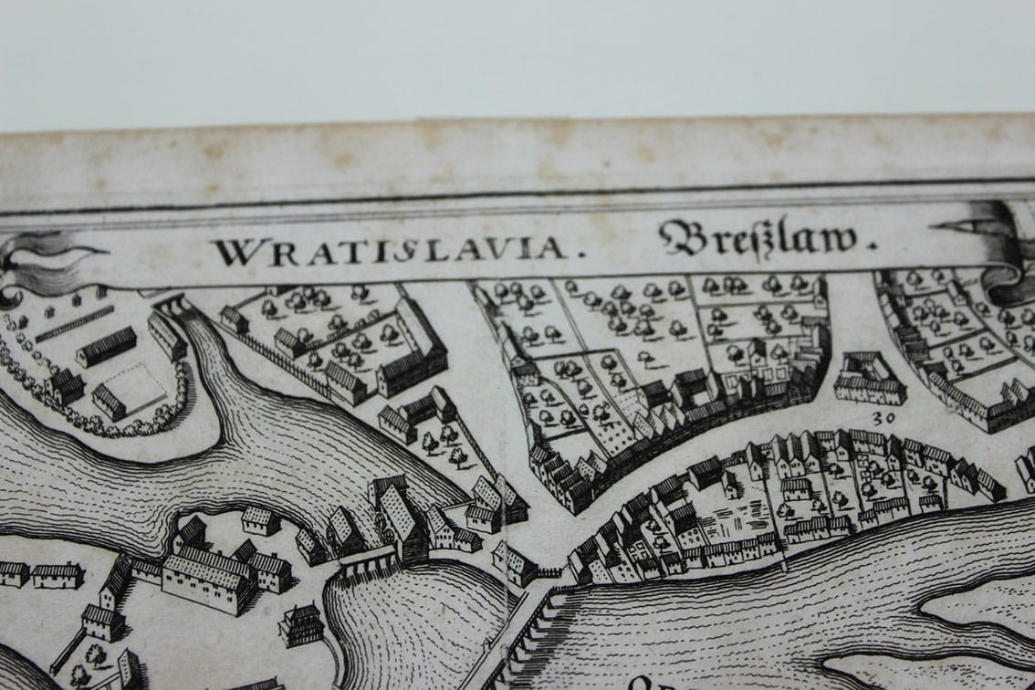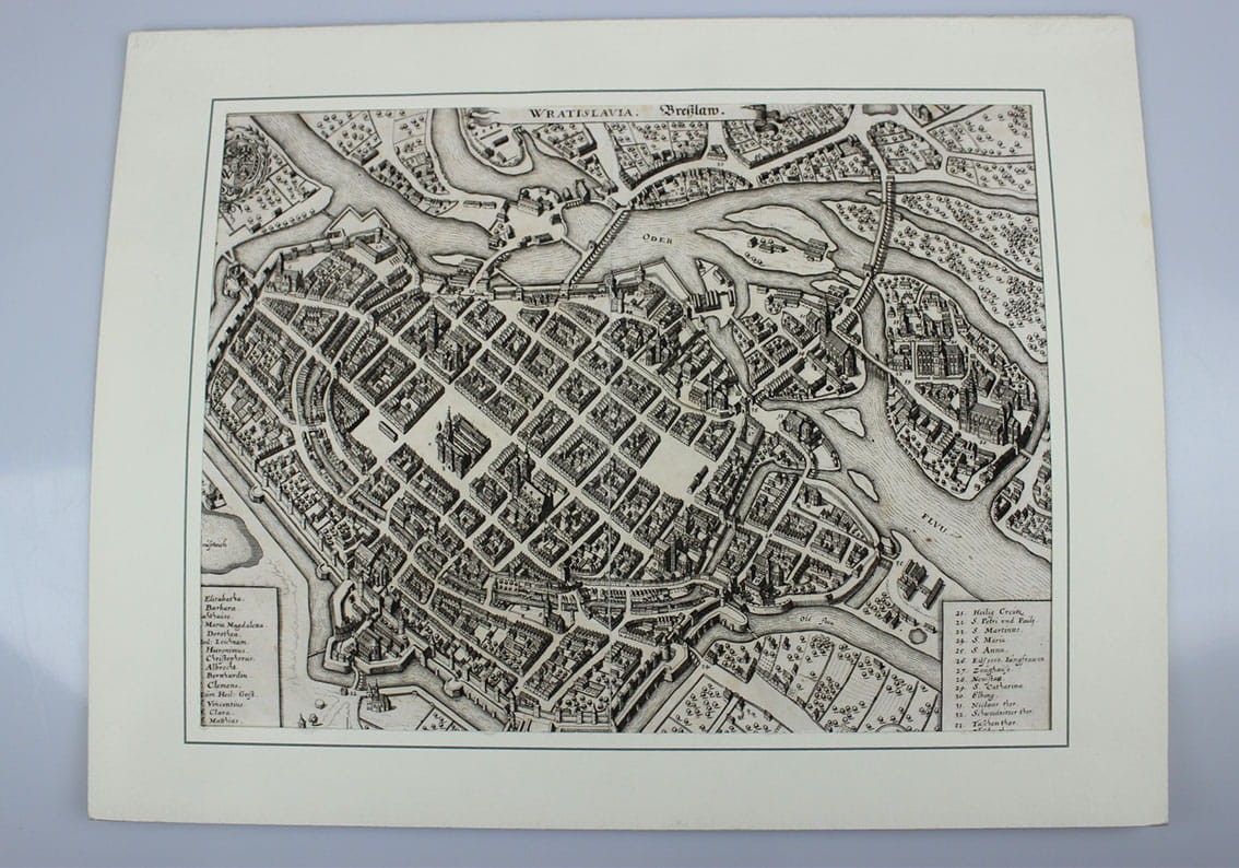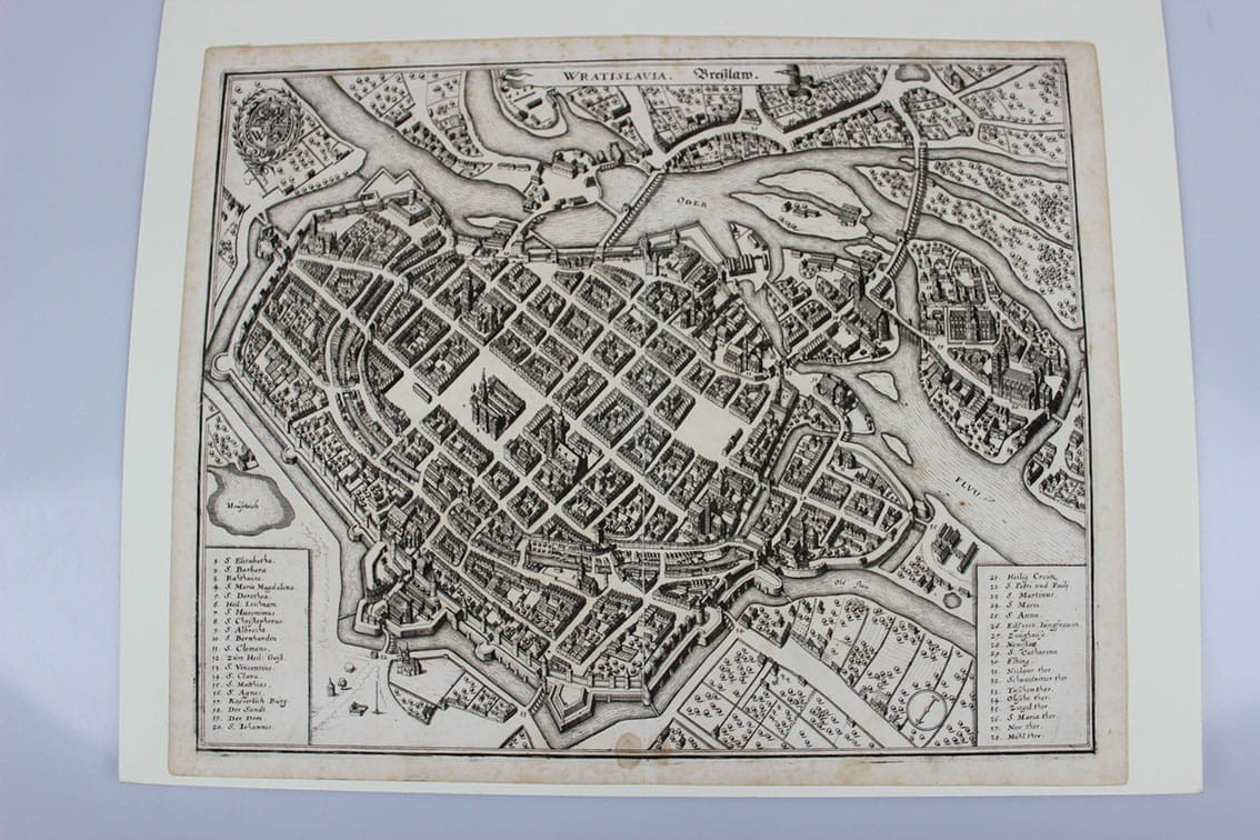 Perspektywiczny plan miasta, ryt. Wenzel Hollar (?), wyd. Matthäus Merian, Frankfurt n. Menem 1641; plan miasta wzorowany na oprac. Brauna / Hogenberga, zamieszczony w kilku dziełach wydawanych przez Meriana w latach 1641-1650 (m.in. Topographia Bohemiae, Moraviae et Silesiae); miedzioryt . wymiary płyty: 367x295 mm; tyt. w górze, na falującej wstędze: WRATISLAVIA. Breßlaw. Odbitka na dwóch połączonych arkuszach papieru. Całość w passe partout.