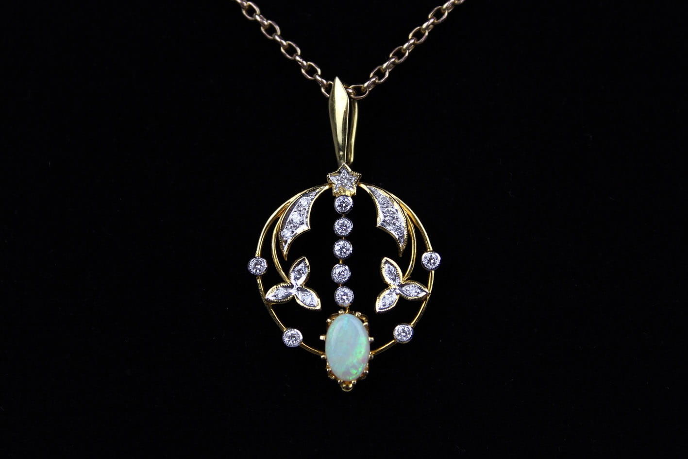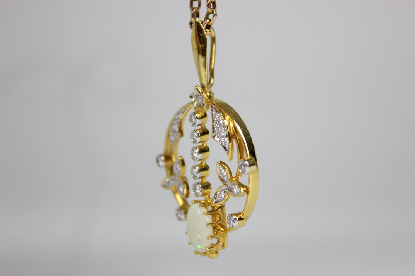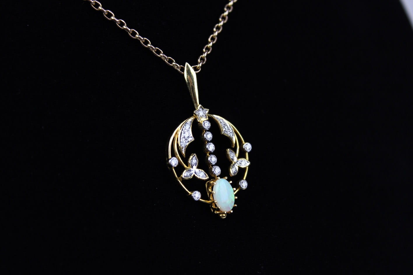Okazała, ażurowa zawieszka z początków XX wieku. Wyrób wykonany w złocie próby 750 ( 18 karatów), kameryzowany 22 diamentami w szlifie brylantowym o czystości VS ( bardzo małe inkluzje) i barwie F ( delikatna biel ). Kamienie o łącznej masie 0,75 karata. Dodatkowo centralną część wisiora zdobi okazały opal mleczny w szlifie kaboszonowym. W zestawie certyfikat rzeczoznawcy gemmologa. Wymiary: