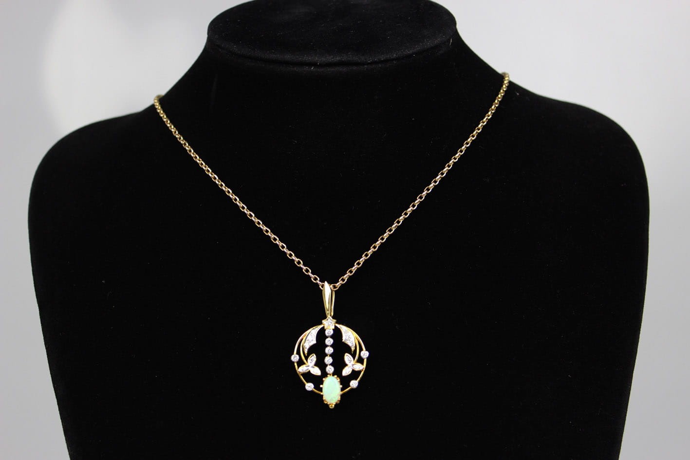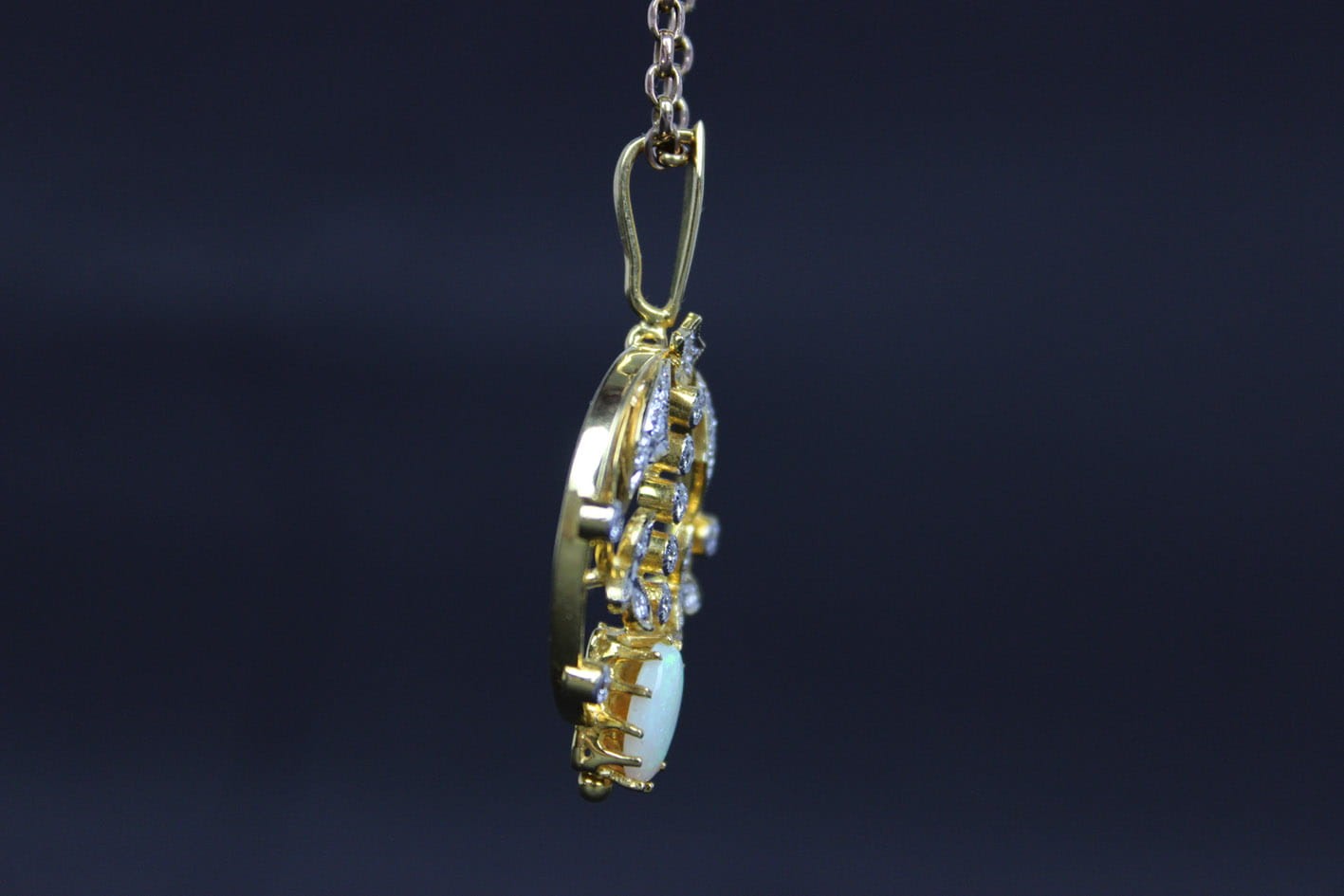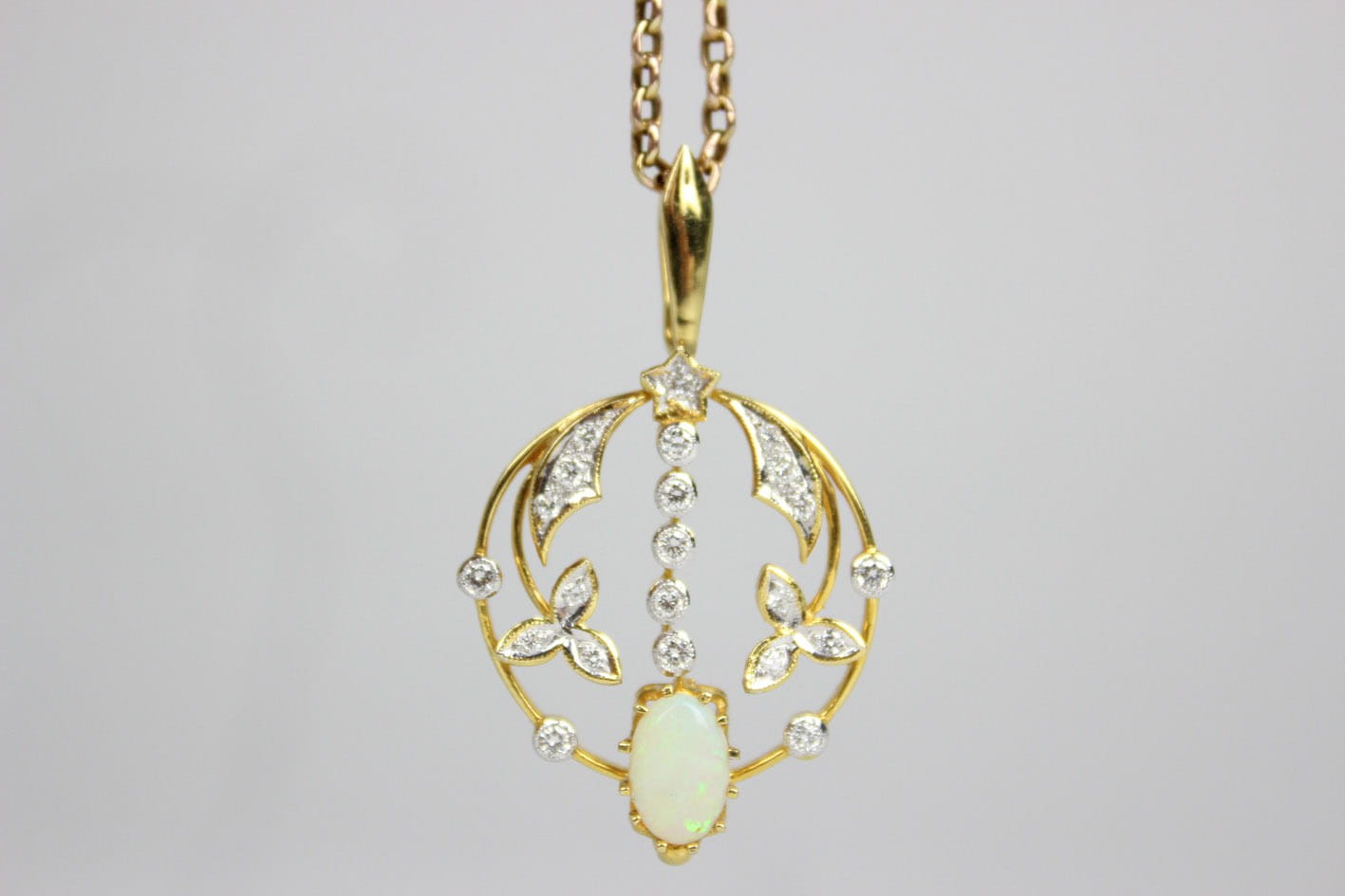 Okazała, ażurowa zawieszka z początków XX wieku. Wyrób wykonany w złocie próby 750 ( 18 karatów), kameryzowany 22 diamentami w szlifie brylantowym o czystości VS ( bardzo małe inkluzje) i barwie F ( delikatna biel ). Kamienie o łącznej masie 0,75 karata. Dodatkowo centralną część wisiora zdobi okazały opal mleczny w szlifie kaboszonowym. W zestawie certyfikat rzeczoznawcy gemmologa. Wymiary: