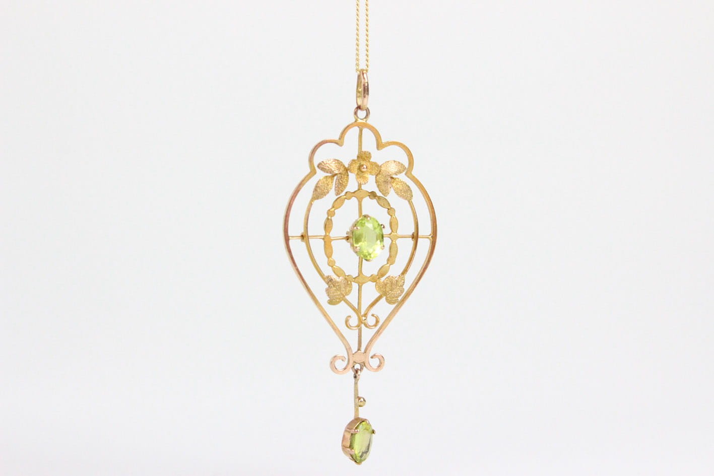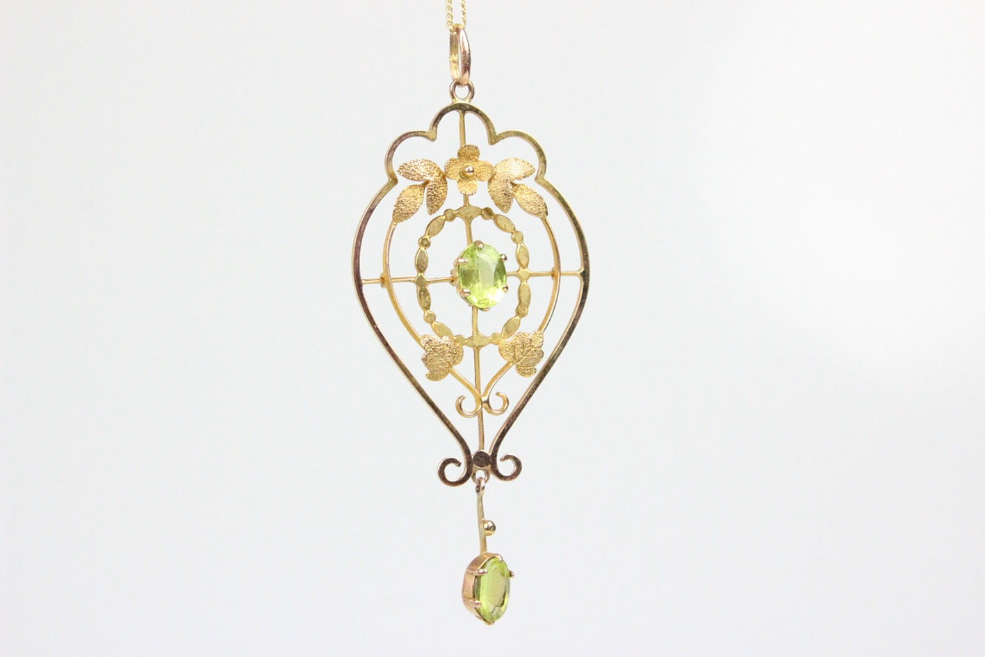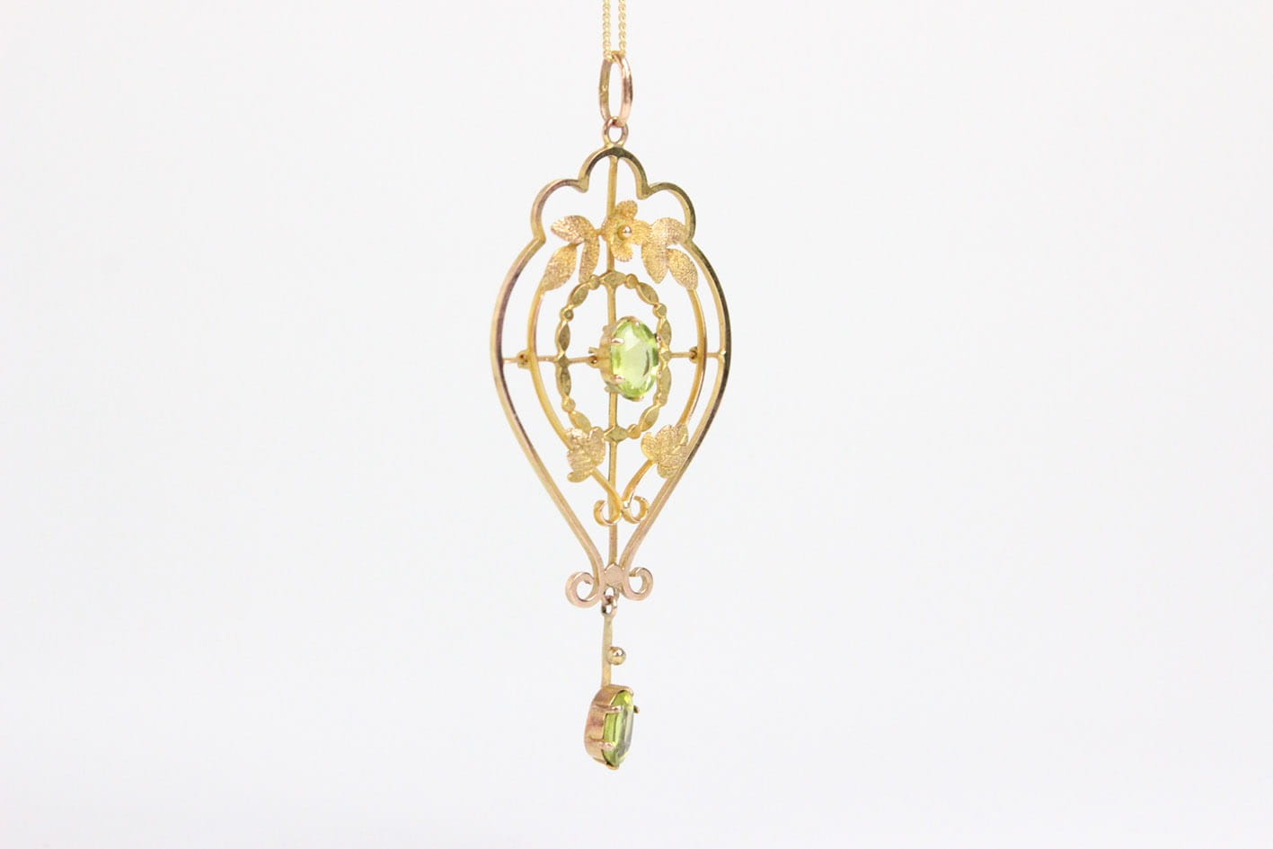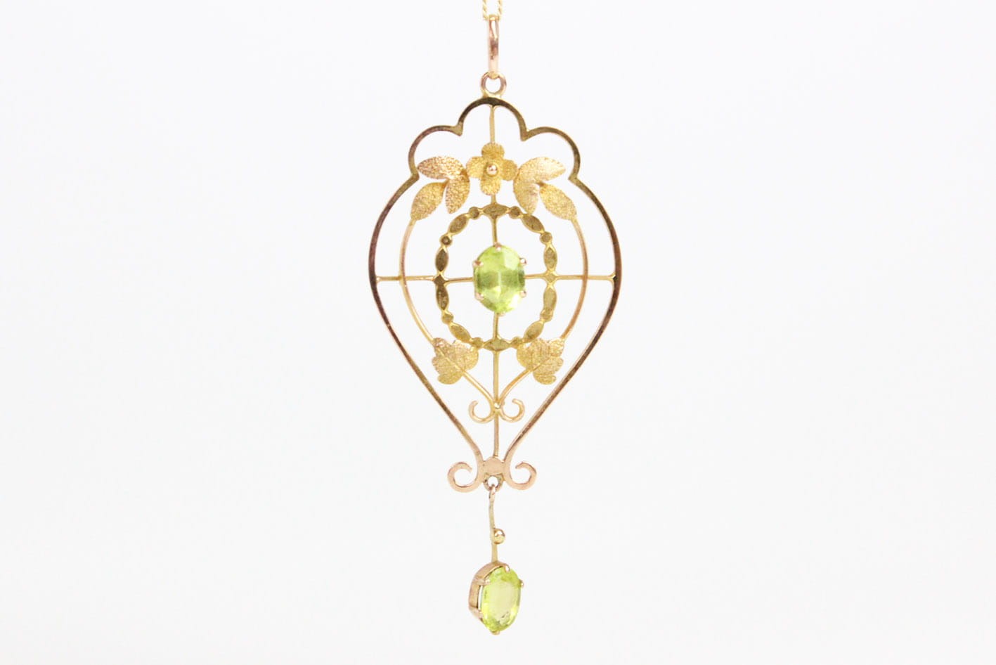 Przepiękna zawieszka z epoki edwardiańskiej, misternie wykonana w złocie próby 375 (9 karatów, punca na wewnętrznej części przywieszki). Ten elegancki wyrób pochodzi z Wielkiej Brytanii i zachwyca bogatym zdobieniem. Zawieszka kameryzowana peridotami, które wspaniale współgrają z ciepłym blaskiem złota, nadając jej niepowtarzalnego uroku. W komplecie znajduje się łańcuszek wykonany również w złocie próby 375. Stan zachowania bardzo dobry.