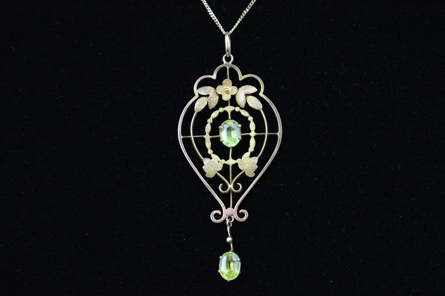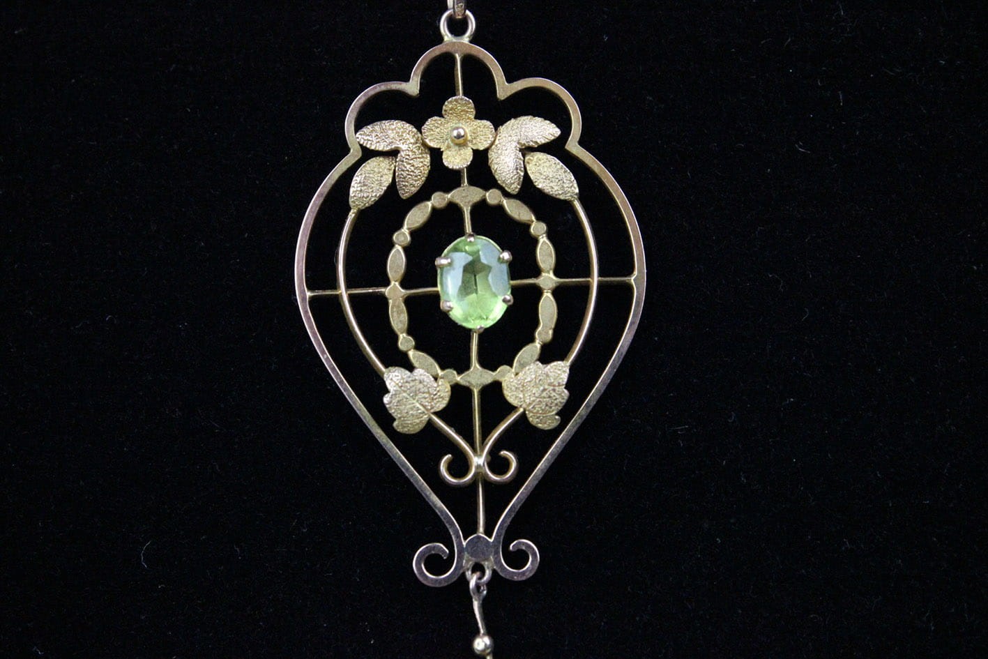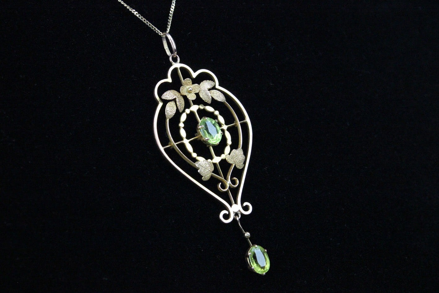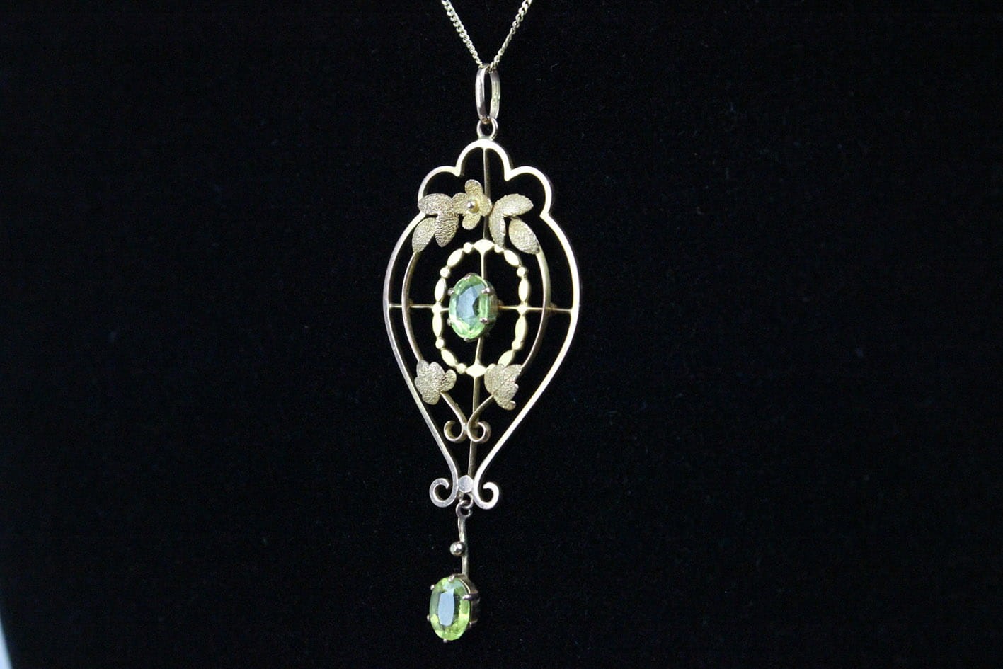 Przepiękna zawieszka z epoki edwardiańskiej, misternie wykonana w złocie próby 375 (9 karatów, punca na wewnętrznej części przywieszki). Ten elegancki wyrób pochodzi z Wielkiej Brytanii i zachwyca bogatym zdobieniem. Zawieszka kameryzowana peridotami, które wspaniale współgrają z ciepłym blaskiem złota, nadając jej niepowtarzalnego uroku. W komplecie znajduje się łańcuszek wykonany również w złocie próby 375. Stan zachowania bardzo dobry.