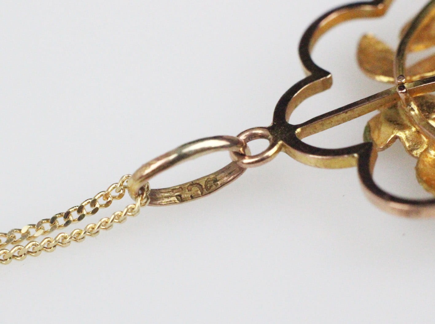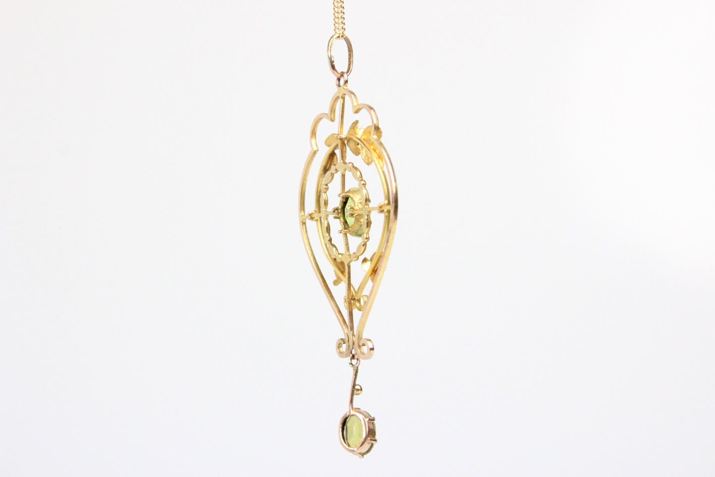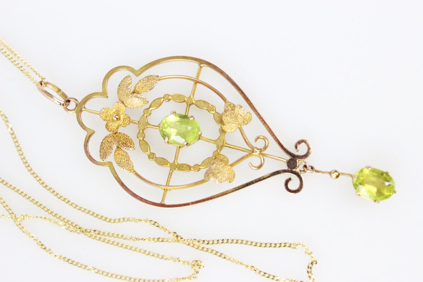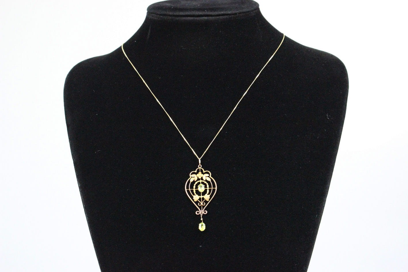 Przepiękna zawieszka z epoki edwardiańskiej, misternie wykonana w złocie próby 375 (9 karatów, punca na wewnętrznej części przywieszki). Ten elegancki wyrób pochodzi z Wielkiej Brytanii i zachwyca bogatym zdobieniem. Zawieszka kameryzowana peridotami, które wspaniale współgrają z ciepłym blaskiem złota, nadając jej niepowtarzalnego uroku. W komplecie znajduje się łańcuszek wykonany również w złocie próby 375. Stan zachowania bardzo dobry.