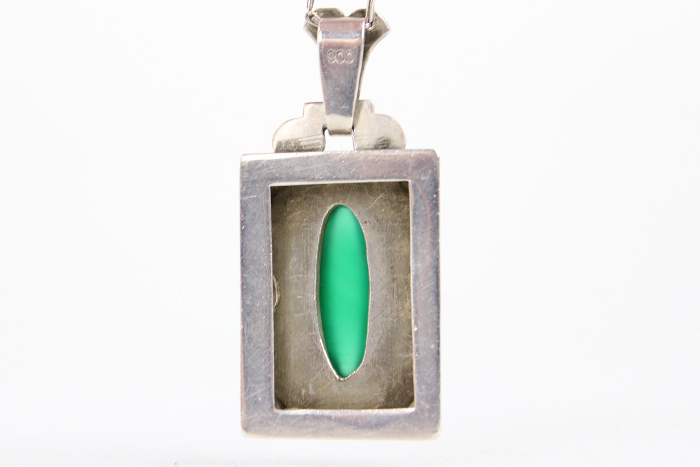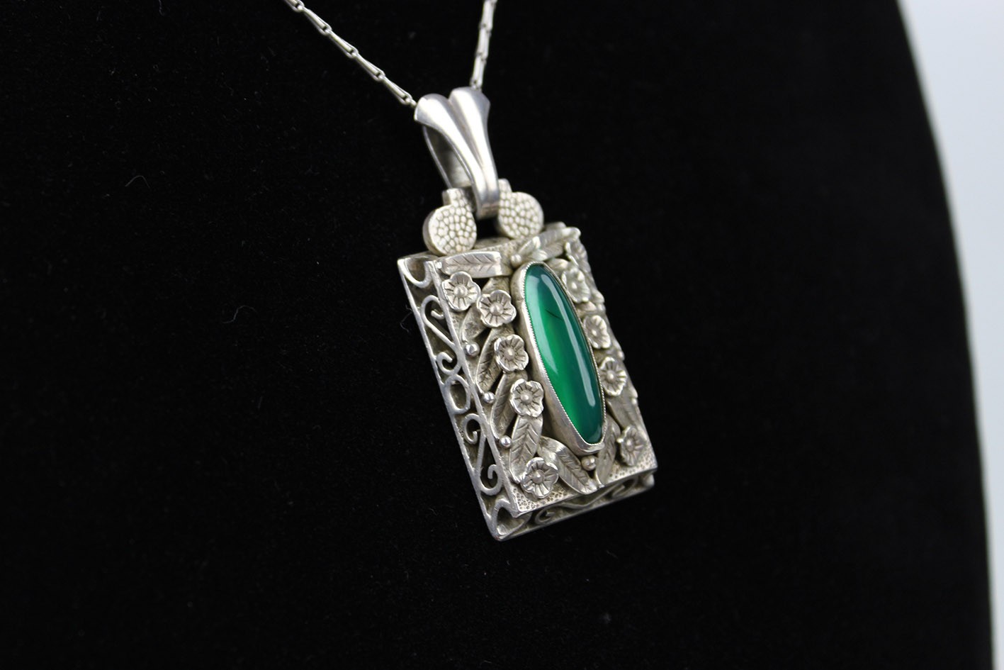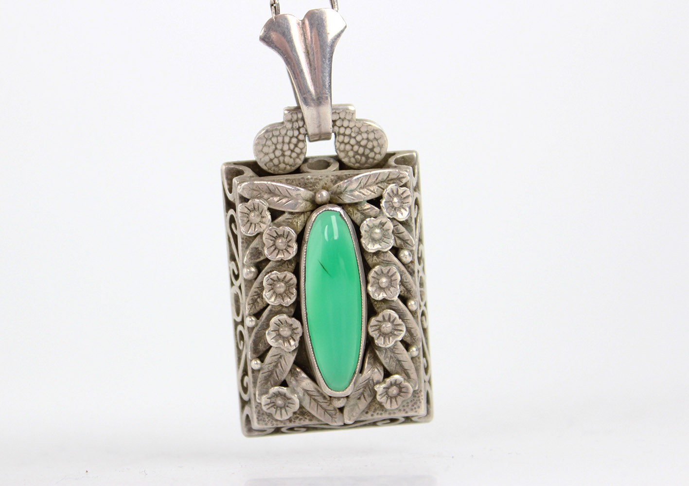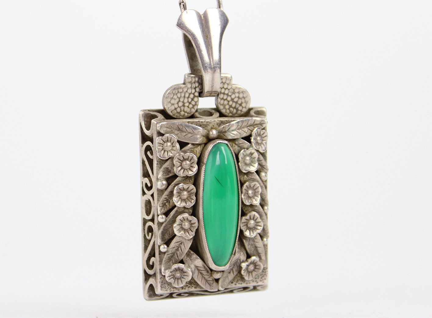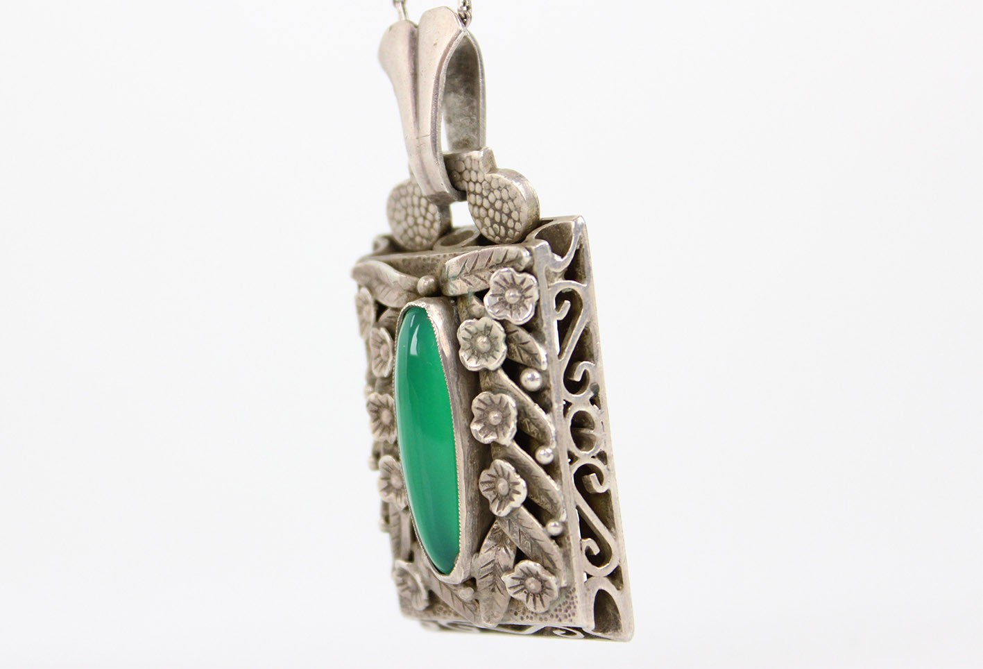 Szczególnym elementem dekoracyjnym są ażurowe boki zawieszki, które nadają konstrukcji lekkości i przestrzenności. Dzięki temu światło swobodnie przenika przez formę przedmiotu, podkreślając zarówno rzeźbiarski charakter ornamentu, jak i głębię zielonego kamienia. Całość wieńczy dekoracyjny uchwyt utrzymany w stylistyce spójnej z resztą kompozycji.