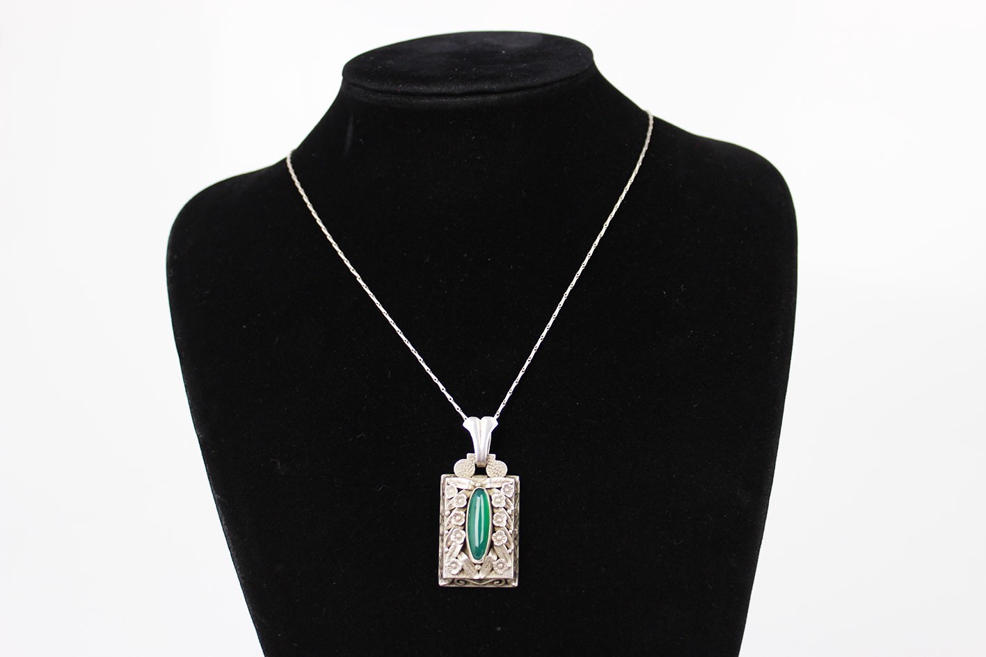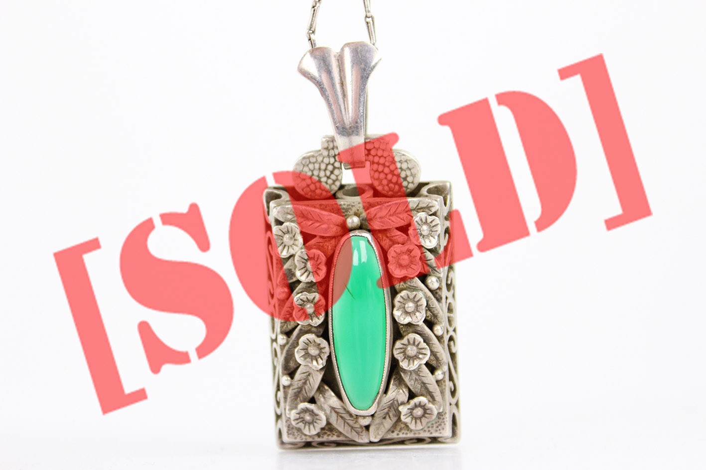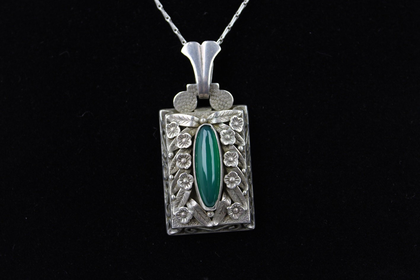 Elegancka zawieszka pochodząca z okresu przejściowego między schyłkiem secesji a wczesnym Art Deco, wykonana w srebrze próby 900. Forma przedmiotu łączy jeszcze dekoracyjność i inspiracje światem natury charakterystyczne dla secesji z coraz wyraźniej pojawiającą się symetrią i uporządkowaną kompozycją, które zapowiadają już estetykę Art Deco.