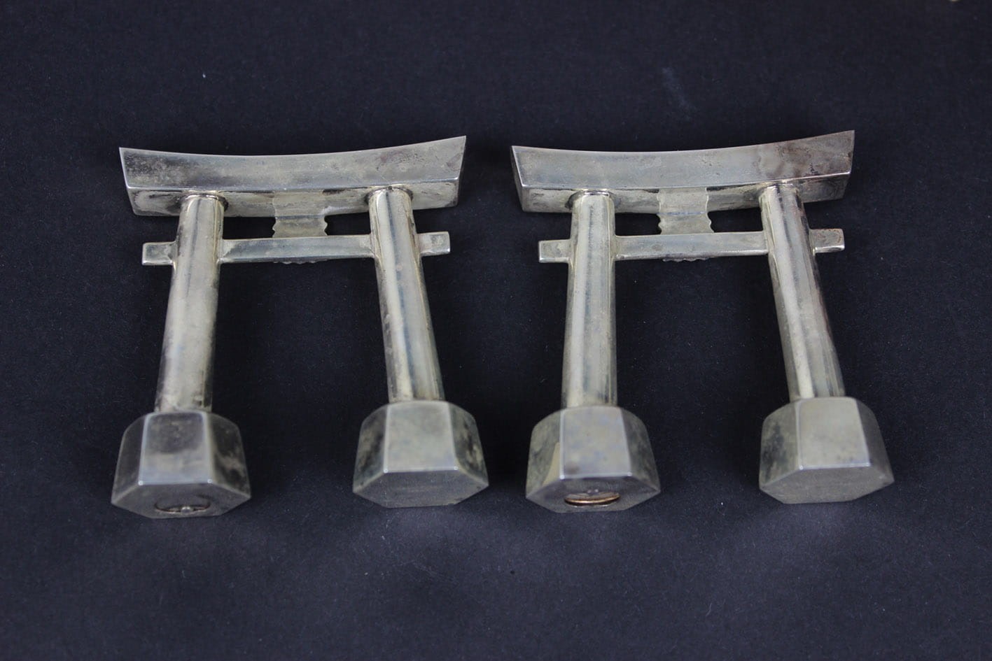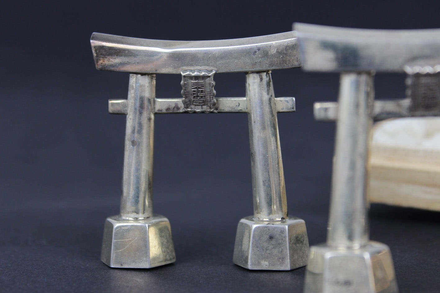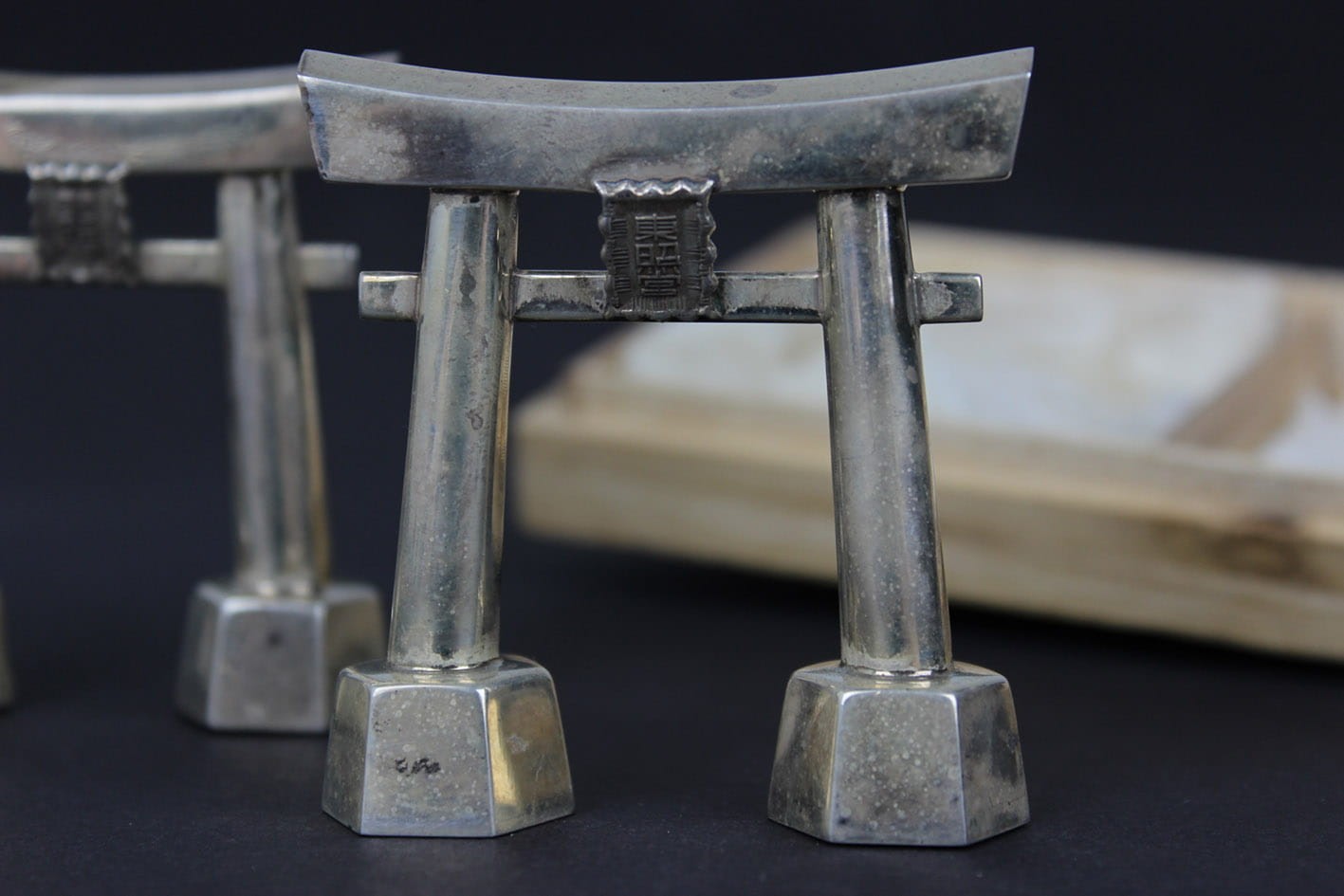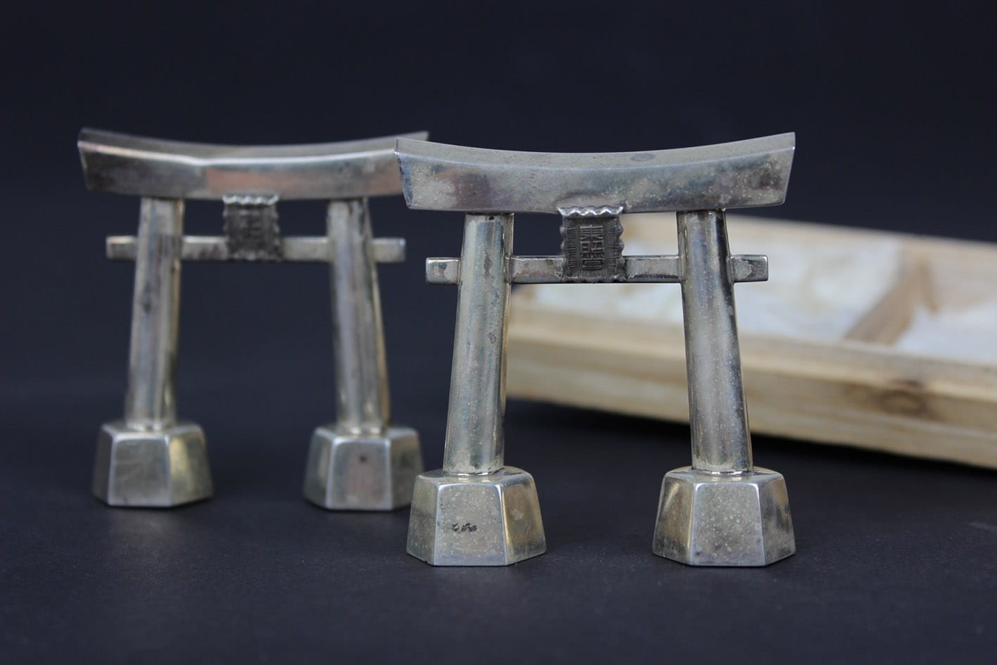 Przepięknie zachowany japoński zestaw do przypraw z połowy lat 50-tych XX wieku. Pieprzniczka i solniczka w formie symbolicznej bramy Tori prowadzącej do świętego obszaru chramów. Zestaw wykonany w srebrze próby 950 sygnowany puncą JAPAN STERLING 950. Całość w oryginalnym drewnianym opakowaniu z papierową wyściółką. Stan zachowania zestawu bardzo dobry z wiekową patynką. Jedynie pudełko posiada pęknięcie na wieczku. Wymiary: