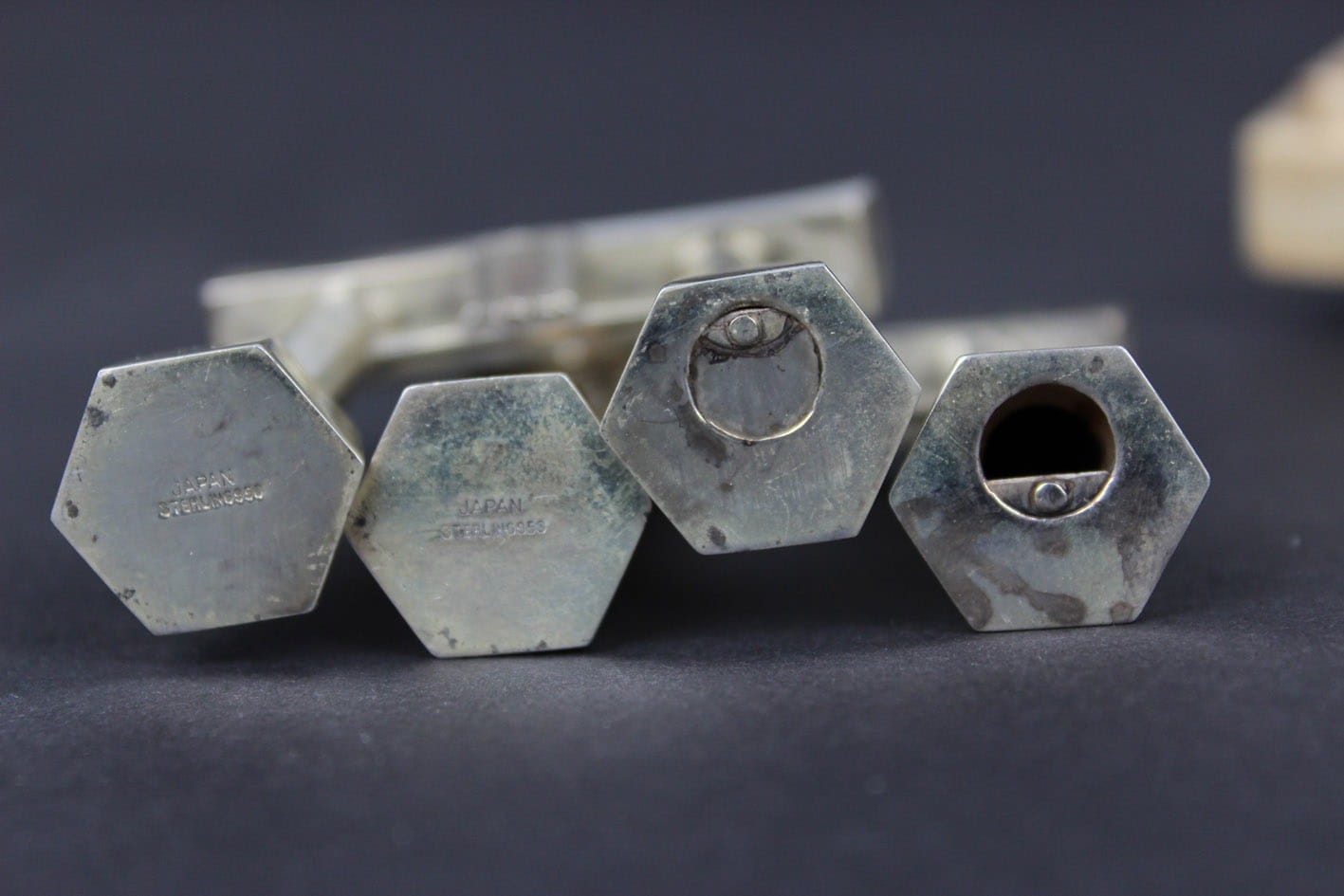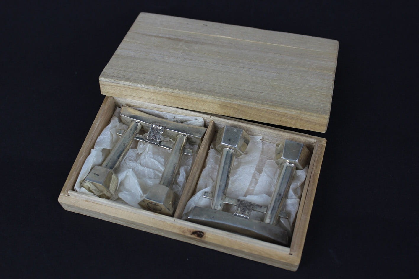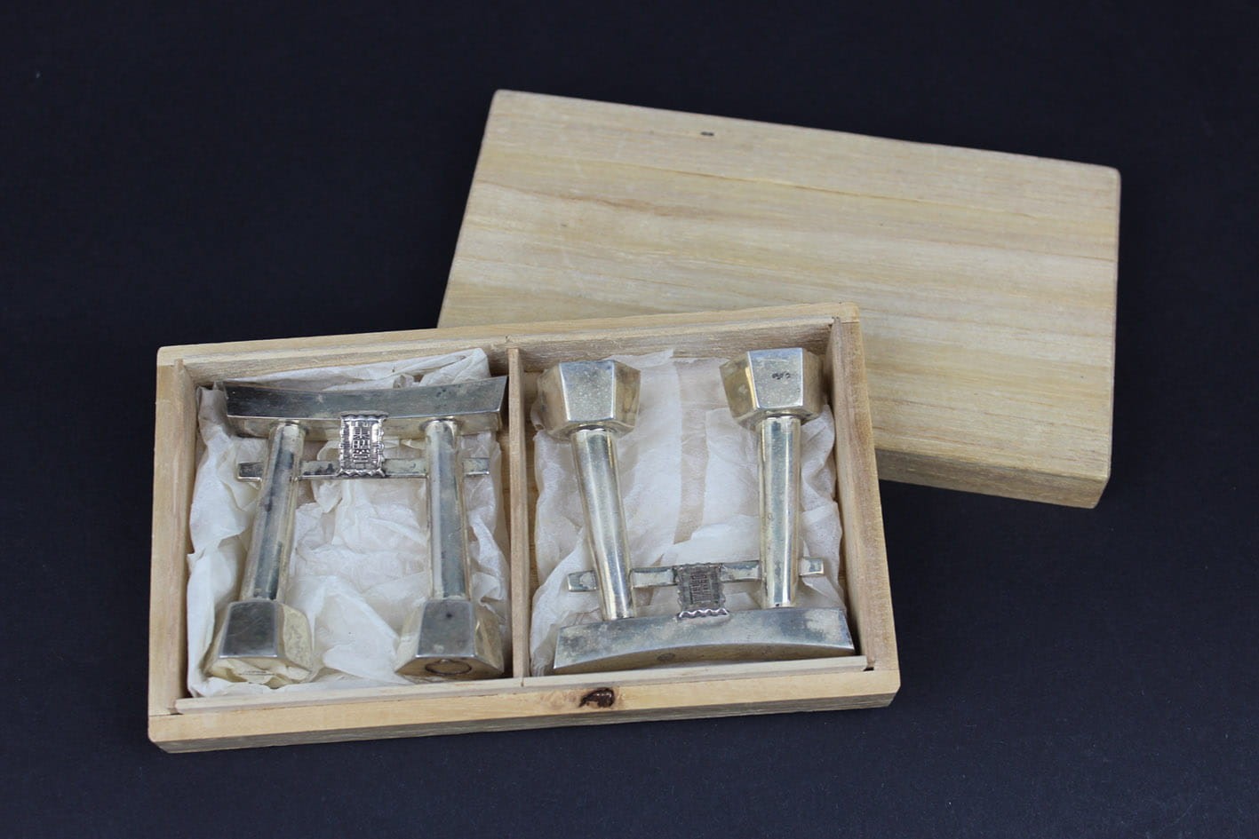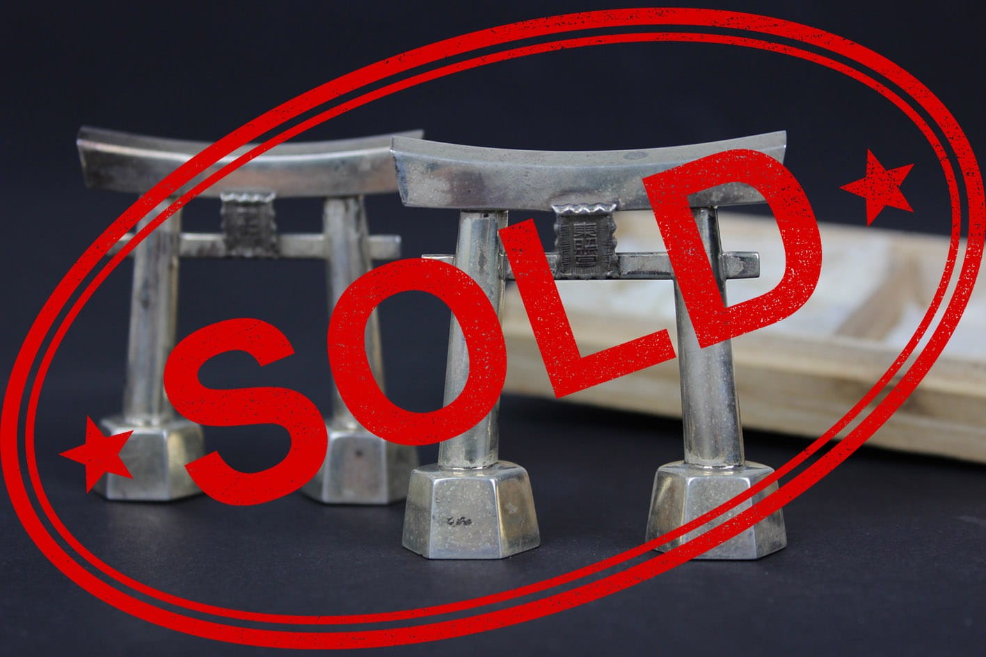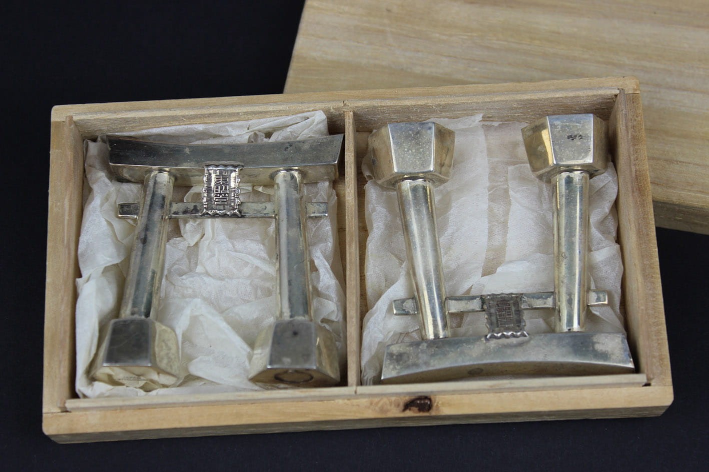 Przepięknie zachowany japoński zestaw do przypraw z połowy lat 50-tych XX wieku. Pieprzniczka i solniczka w formie symbolicznej bramy Tori prowadzącej do świętego obszaru chramów. Zestaw wykonany w srebrze próby 950 sygnowany puncą JAPAN STERLING 950. Całość w oryginalnym drewnianym opakowaniu z papierową wyściółką. Stan zachowania zestawu bardzo dobry z wiekową patynką. Jedynie pudełko posiada pęknięcie na wieczku. Wymiary: