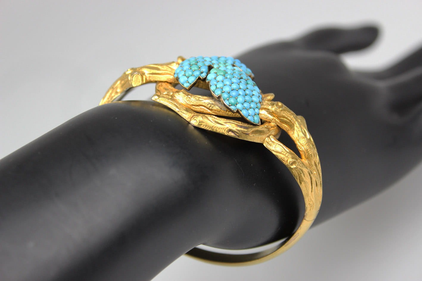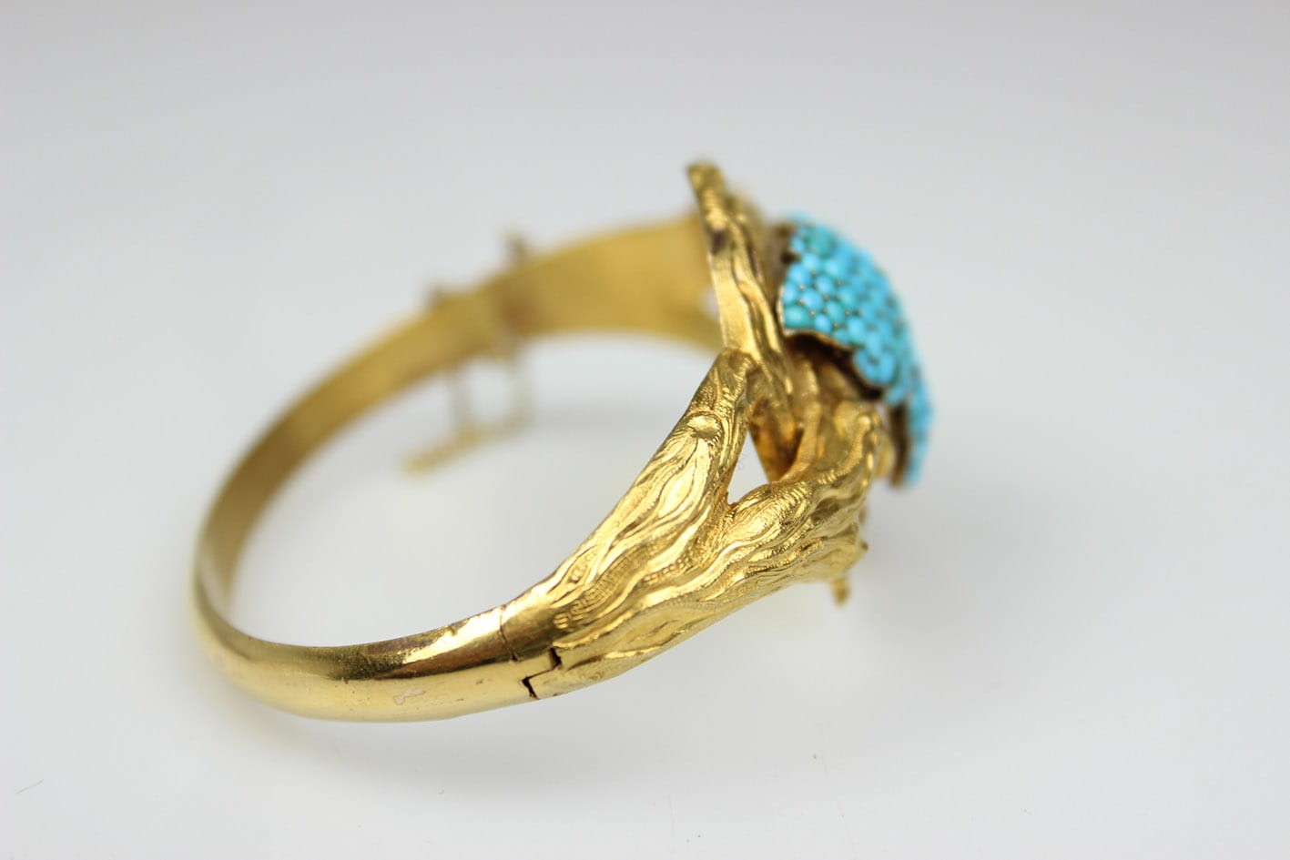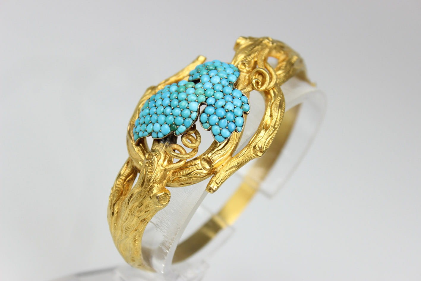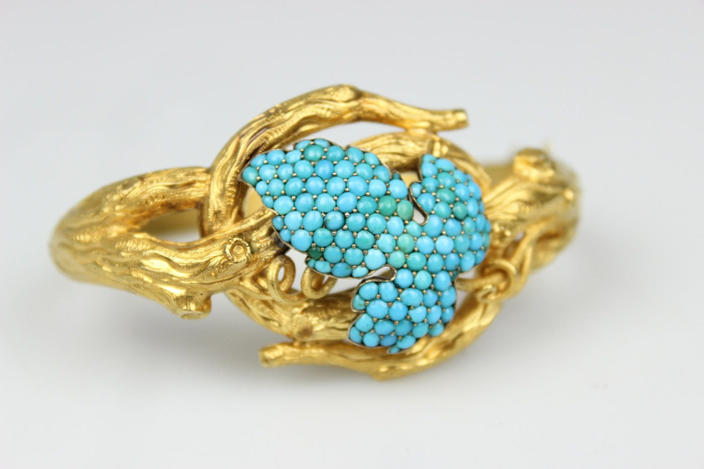 Rzadki i niepowtarzalny egzemplarz bransoletki pochodzącej z II połowy XIX wieku inspirowanej stylem realizmu. Unikalne dzieło jubilerskie z precyzyjnie odwzorowanymi motywami gałązek i faktury drzewa z centralnie osadzonym liściem kameryzowanym 114 turkusami. Konstrukcja bransoletki to dwudzielna obręcz łączona zawiasem i zapinana na zamek z łańcuszkiem zabezpieczającym. Wyrób wykonany w technice złota dętego w złocie próby 585 ( 14 karatów). Bardzo dobry stan zachowania. W komplecie certyfikat renomowanego rzeczoznawcy.