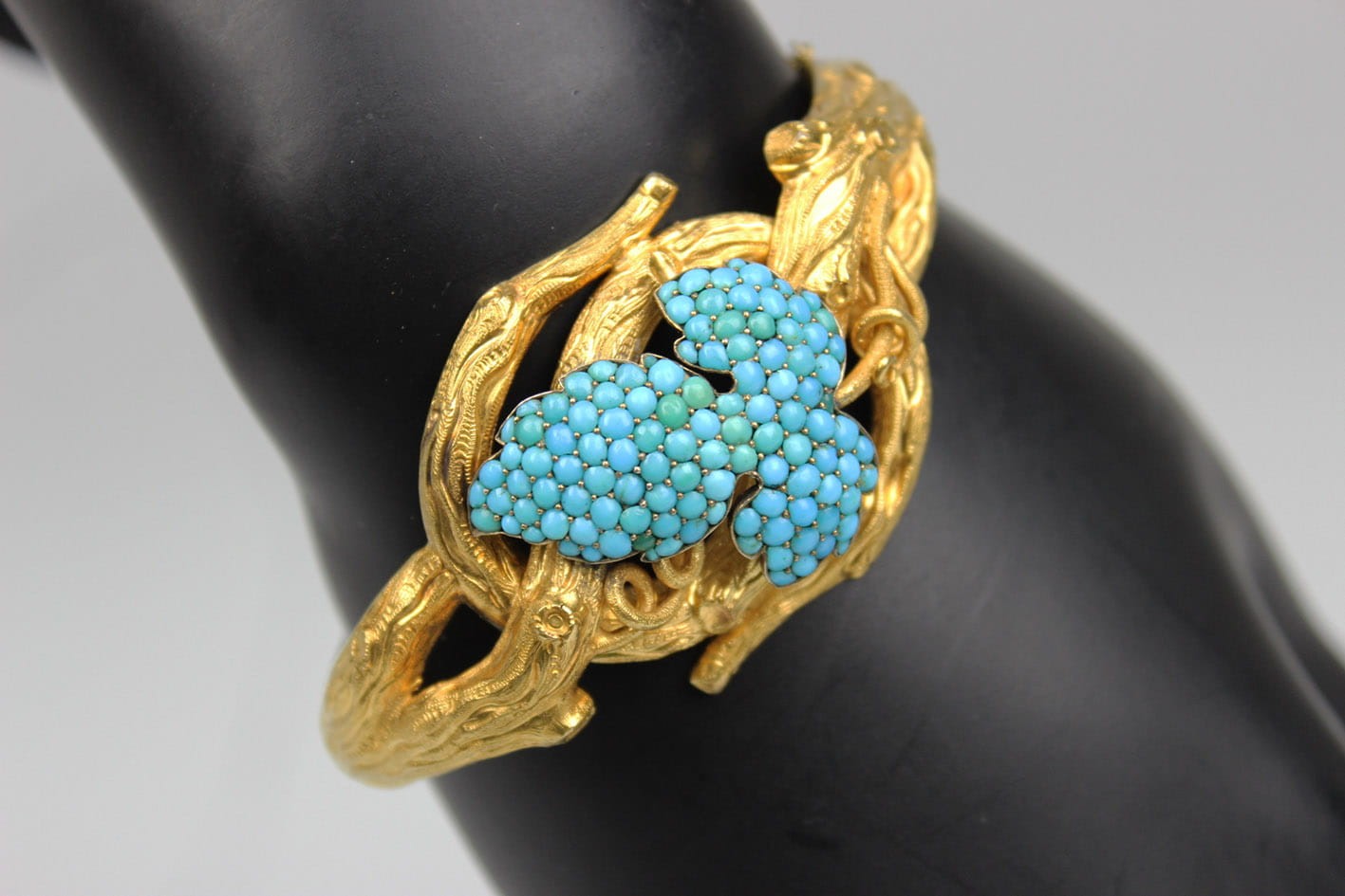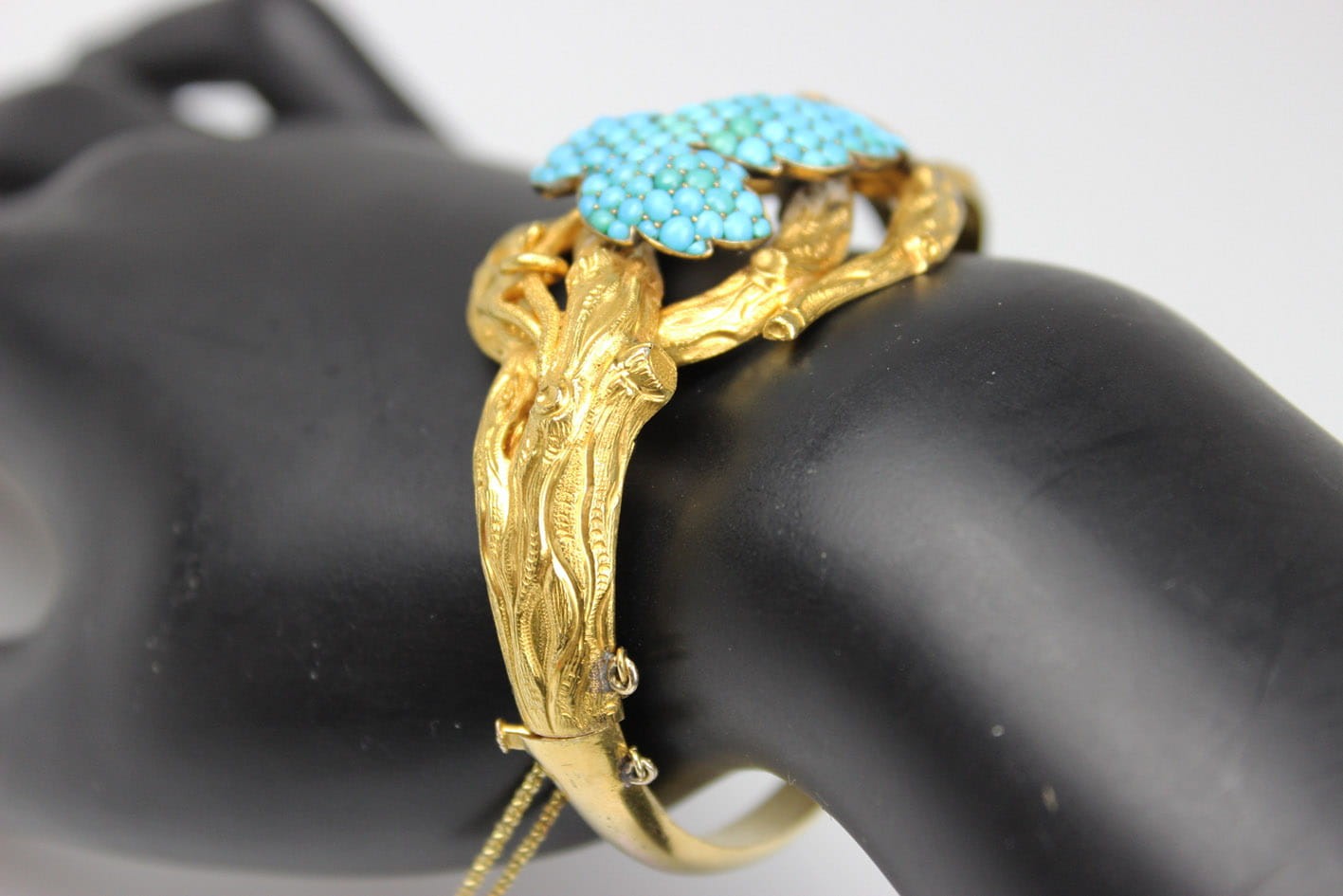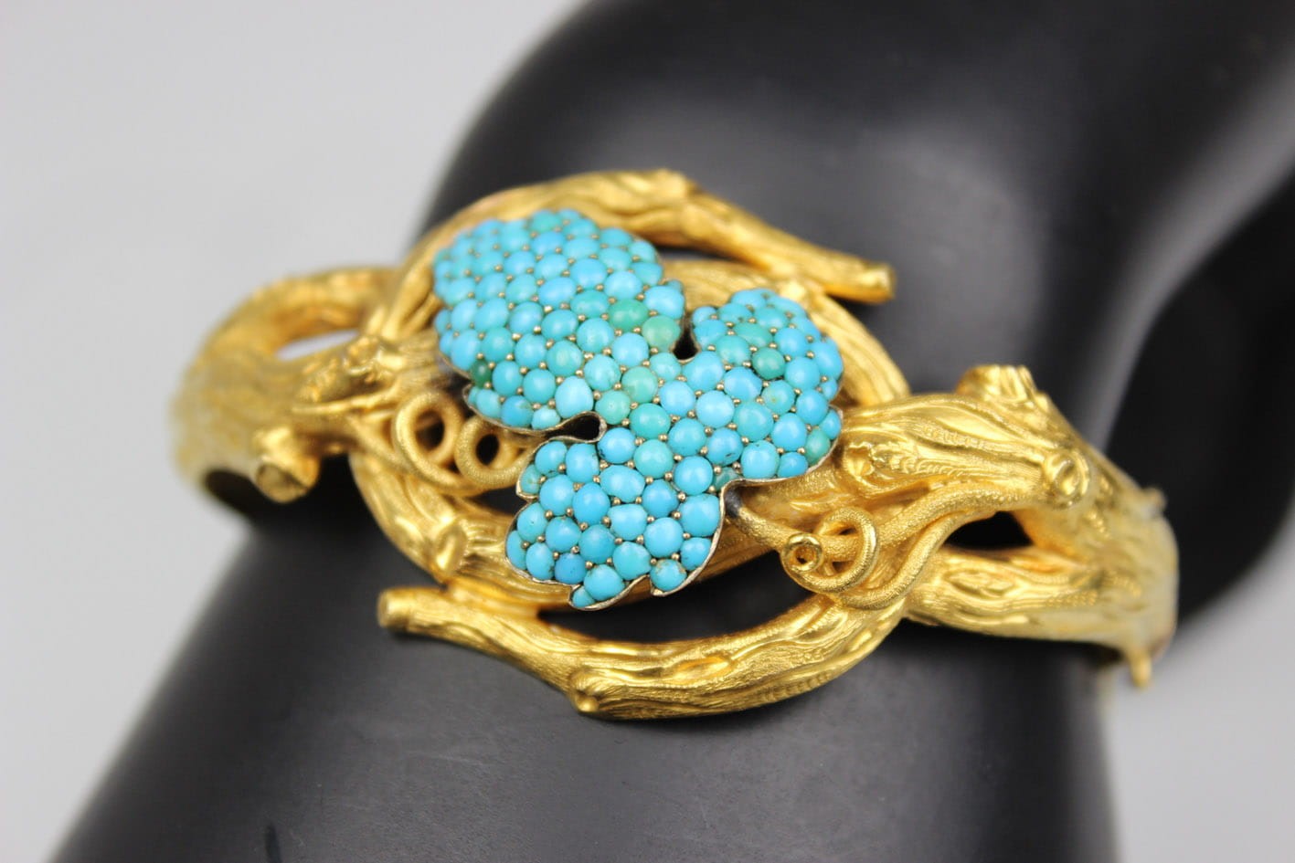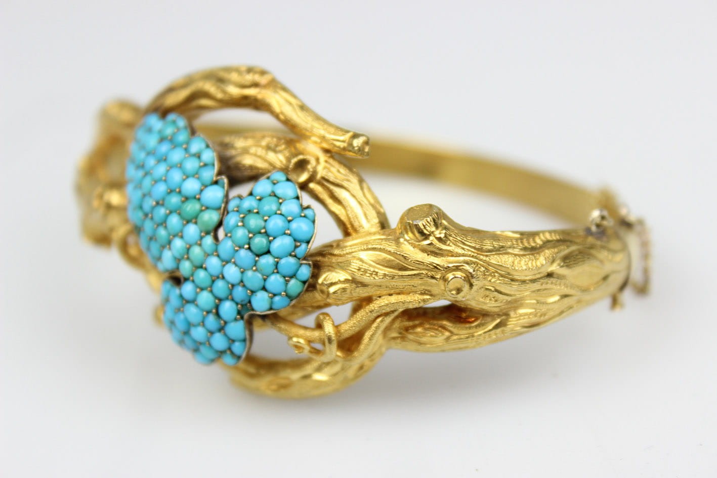Rzadki i niepowtarzalny egzemplarz bransoletki pochodzącej z II połowy XIX wieku inspirowanej stylem realizmu. Unikalne dzieło jubilerskie z precyzyjnie odwzorowanymi motywami gałązek i faktury drzewa z centralnie osadzonym liściem kameryzowanym 114 turkusami. Konstrukcja bransoletki to dwudzielna obręcz łączona zawiasem i zapinana na zamek z łańcuszkiem zabezpieczającym. Wyrób wykonany w technice złota dętego w złocie próby 585 ( 14 karatów). Bardzo dobry stan zachowania. W komplecie certyfikat renomowanego rzeczoznawcy.