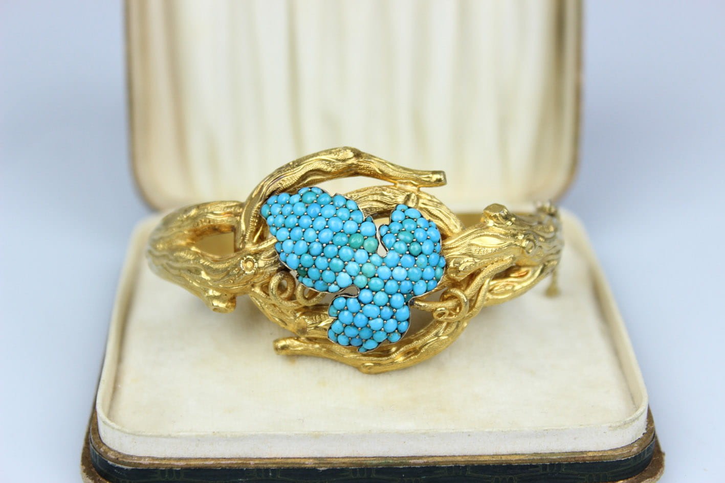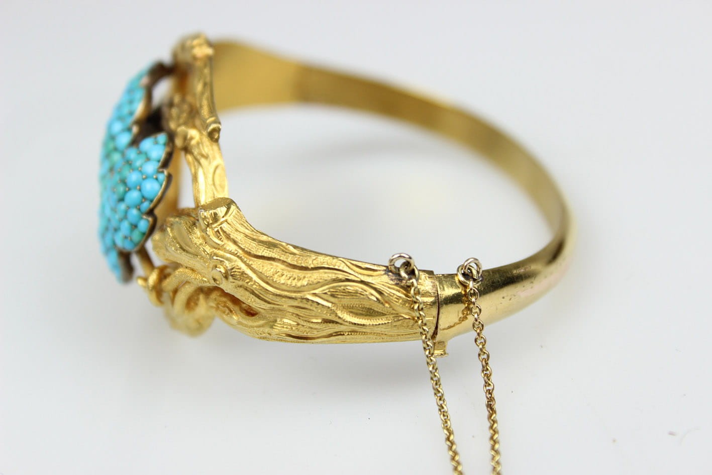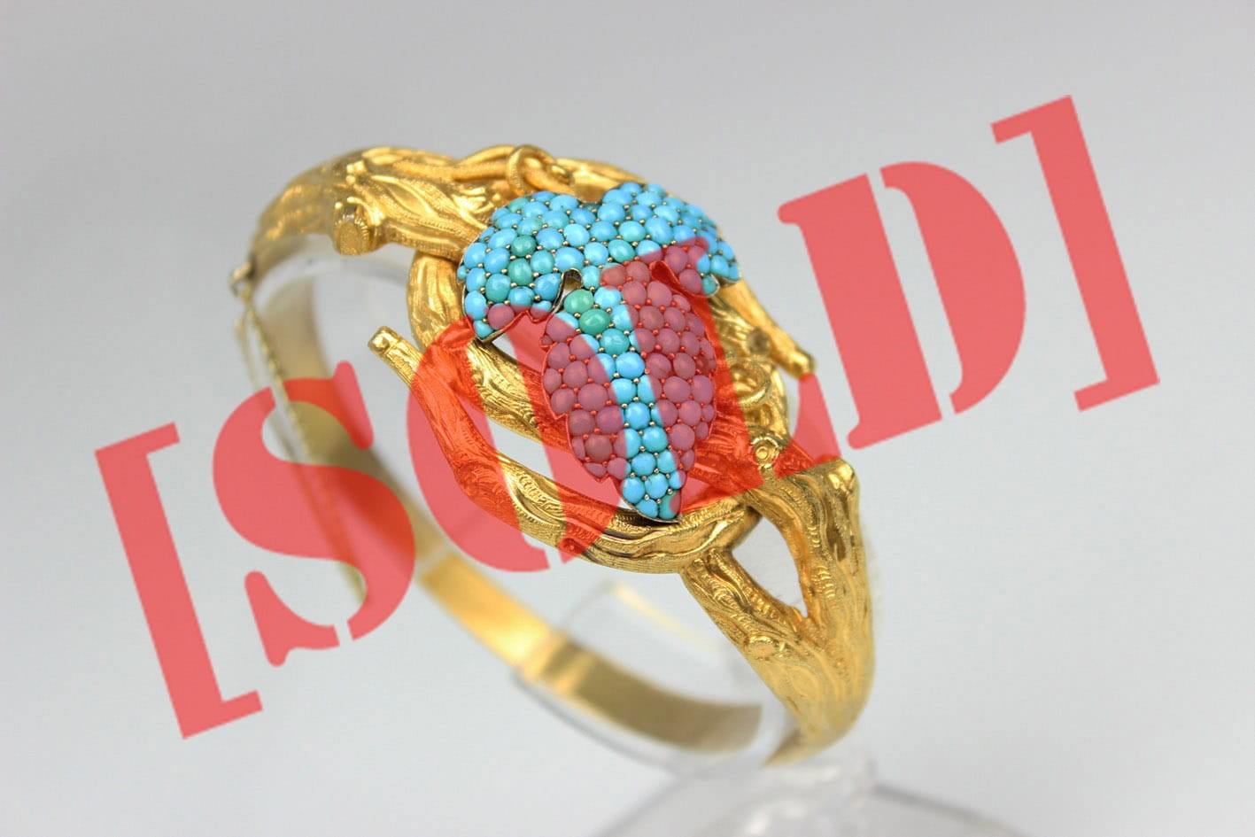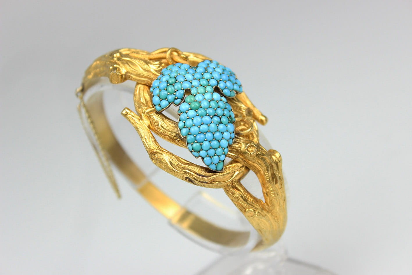 Rzadki i niepowtarzalny egzemplarz bransoletki pochodzącej z II połowy XIX wieku inspirowanej stylem realizmu. Unikalne dzieło jubilerskie z precyzyjnie odwzorowanymi motywami gałązek i faktury drzewa z centralnie osadzonym liściem kameryzowanym 114 turkusami. Konstrukcja bransoletki to dwudzielna obręcz łączona zawiasem i zapinana na zamek z łańcuszkiem zabezpieczającym. Wyrób wykonany w technice złota dętego w złocie próby 585 ( 14 karatów). Bardzo dobry stan zachowania. W komplecie certyfikat renomowanego rzeczoznawcy.