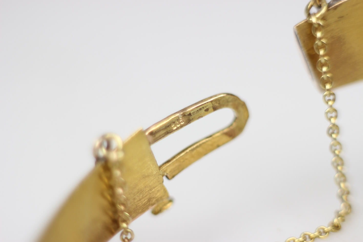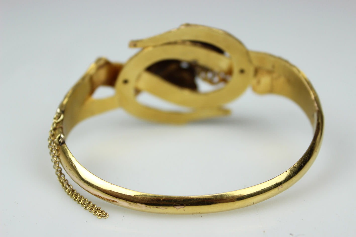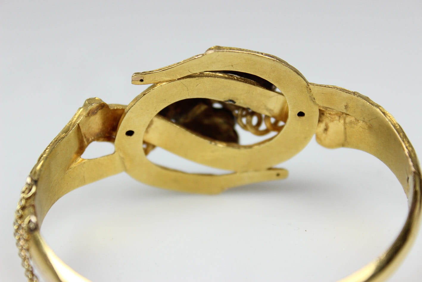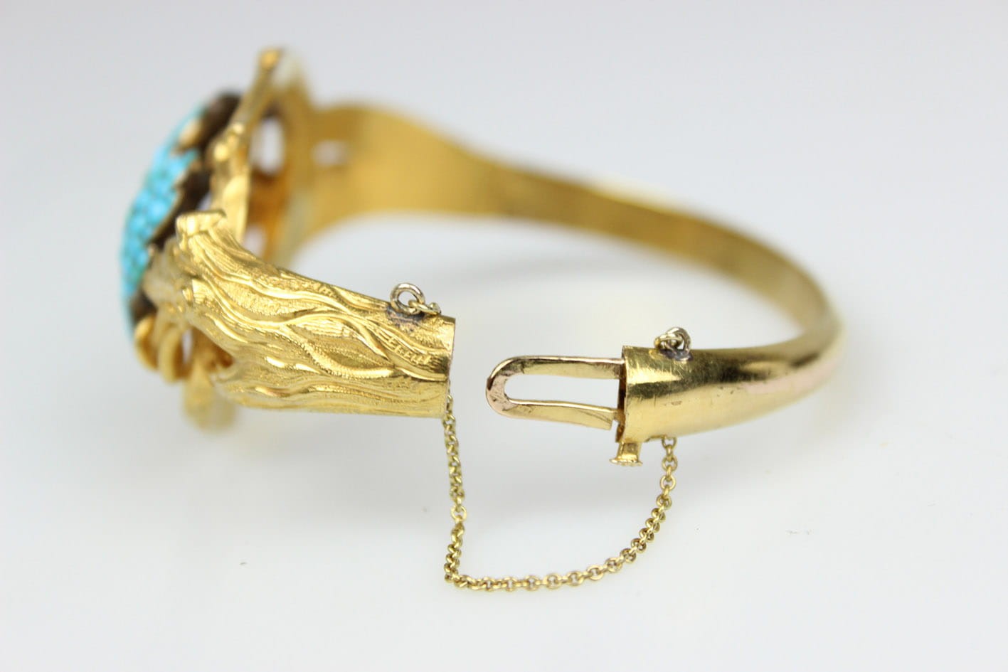 Rzadki i niepowtarzalny egzemplarz bransoletki pochodzącej z II połowy XIX wieku inspirowanej stylem realizmu. Unikalne dzieło jubilerskie z precyzyjnie odwzorowanymi motywami gałązek i faktury drzewa z centralnie osadzonym liściem kameryzowanym 114 turkusami. Konstrukcja bransoletki to dwudzielna obręcz łączona zawiasem i zapinana na zamek z łańcuszkiem zabezpieczającym. Wyrób wykonany w technice złota dętego w złocie próby 585 ( 14 karatów). Bardzo dobry stan zachowania. W komplecie certyfikat renomowanego rzeczoznawcy.